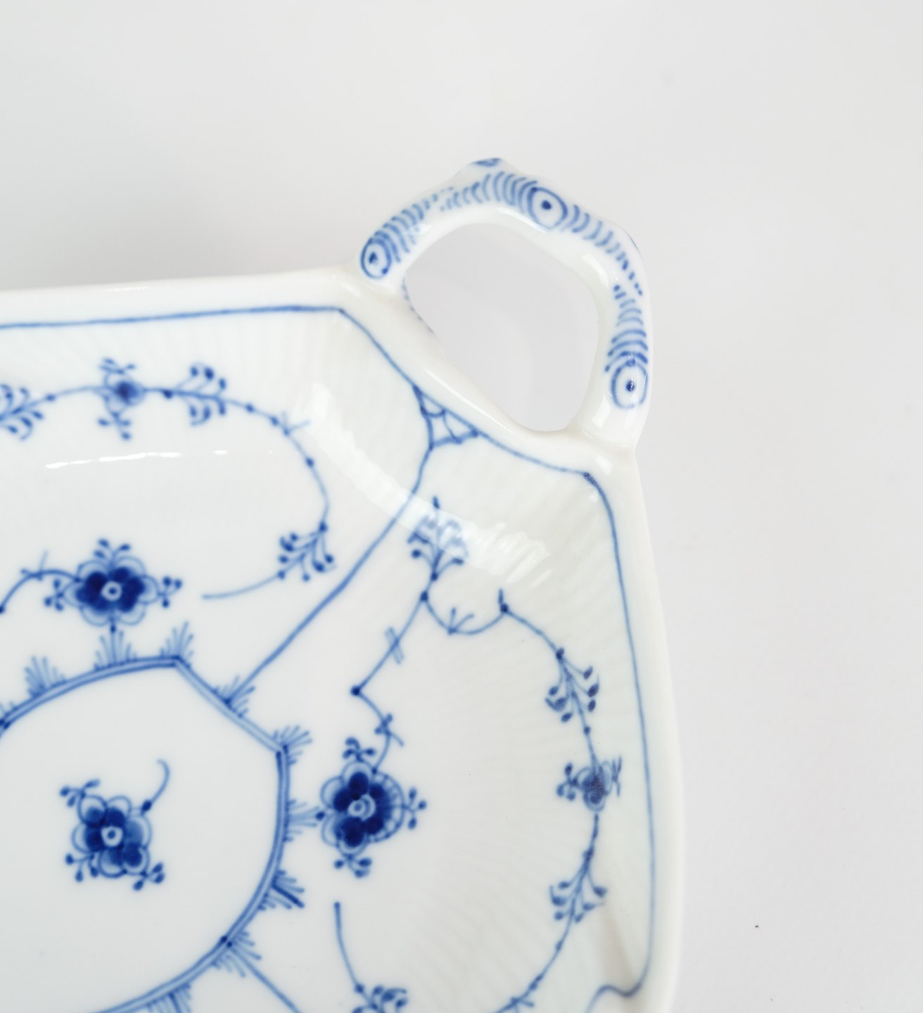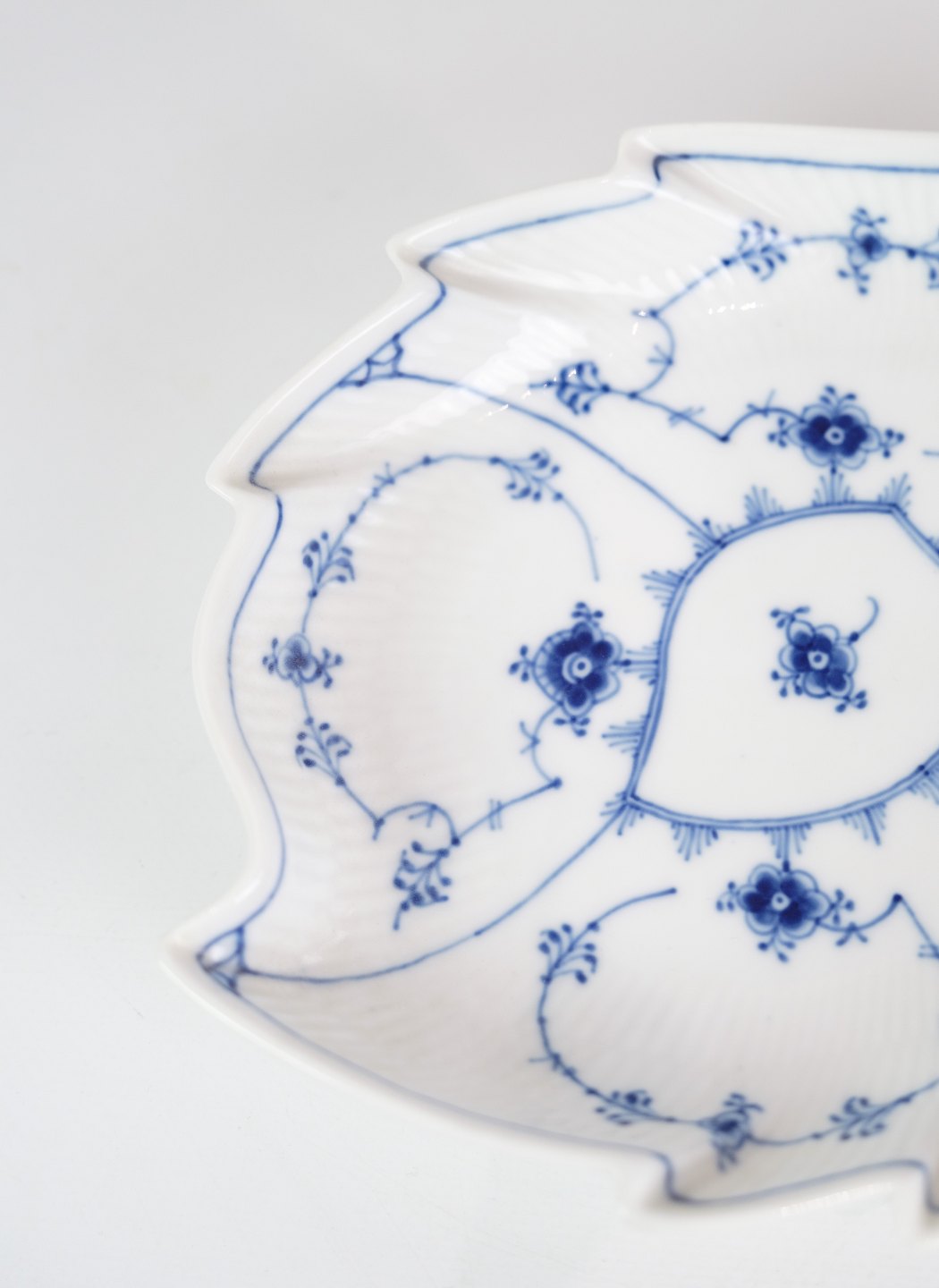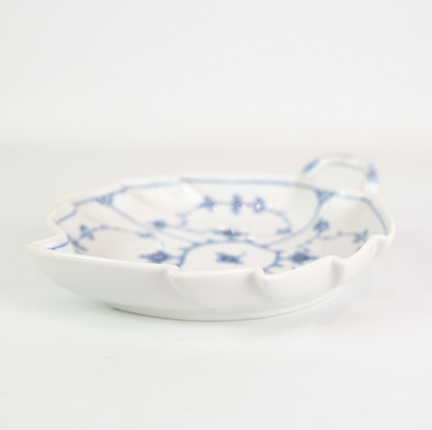 Dette asiet har form som et blad og er en del af den ikoniske Musselmalet Riflet-serie, der er kendt for sit karakteristiske Riflet-mønster. Mønsteret består af delikate blåmønstre, der pryder asiet og tilføjer en fornemmelse af tradition og dansk kultur til din servering.