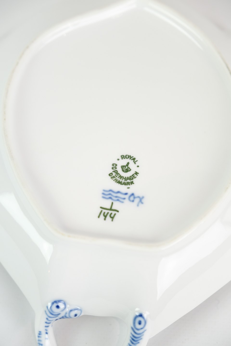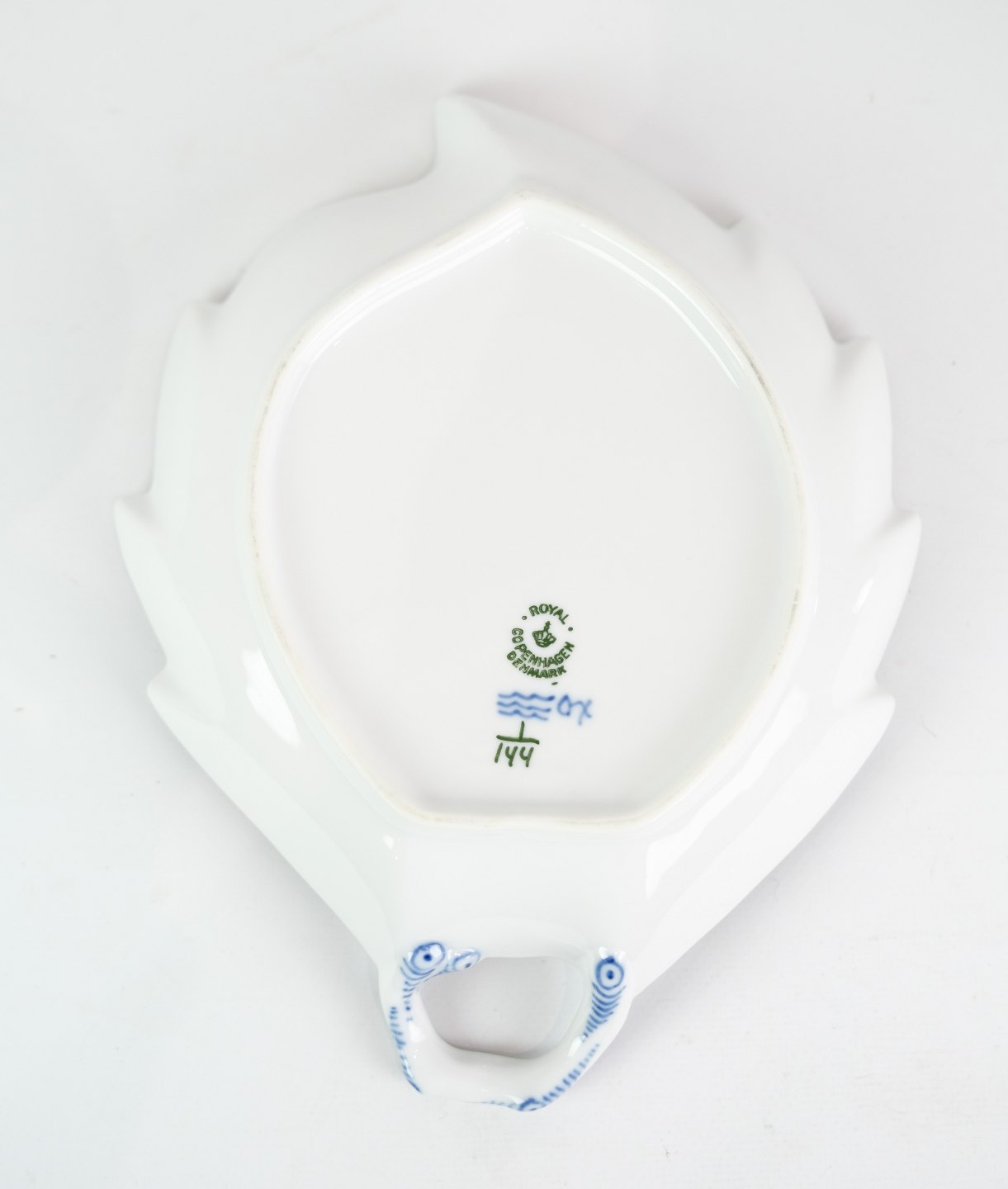 SolgtMusselmalet Riflet bladformet asiet fra Royal Copenhagen med nummer 1/144 er en fortryllende og unik genstand, der tilføjer en ekstra dimension af skønhed og elegance til din borddækning.