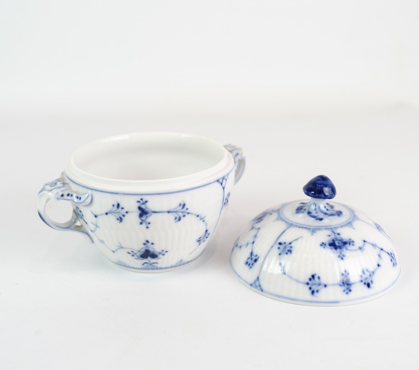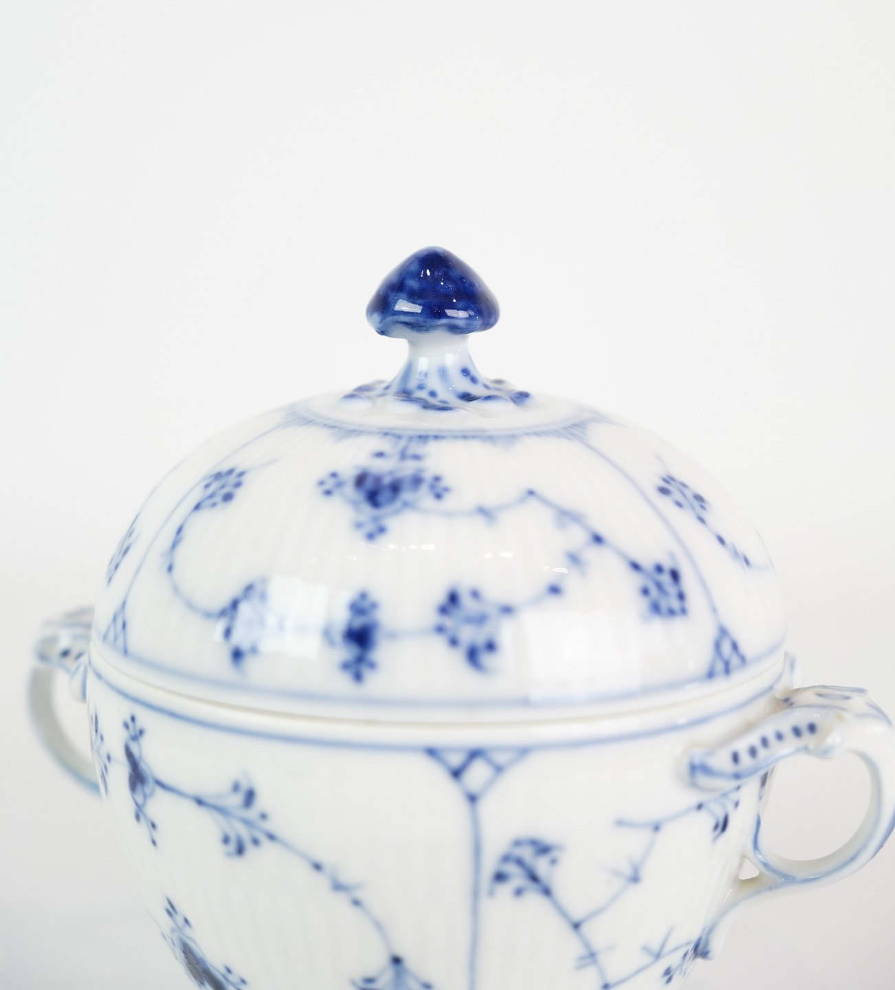 Denne sukkerskål er en del af den ikoniske Musselmalet Riflet-serie, kendetegnet ved det karakteristiske Riflet-mønster. Mønsteret består af delikate blåmønstre, der pryder skålens overflade og giver et subtilt og klassisk præg til din borddækning.