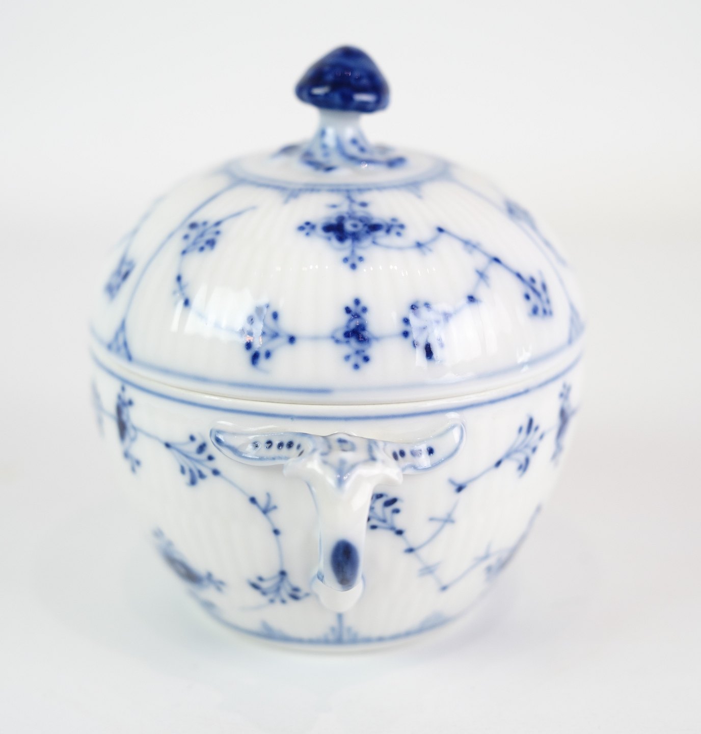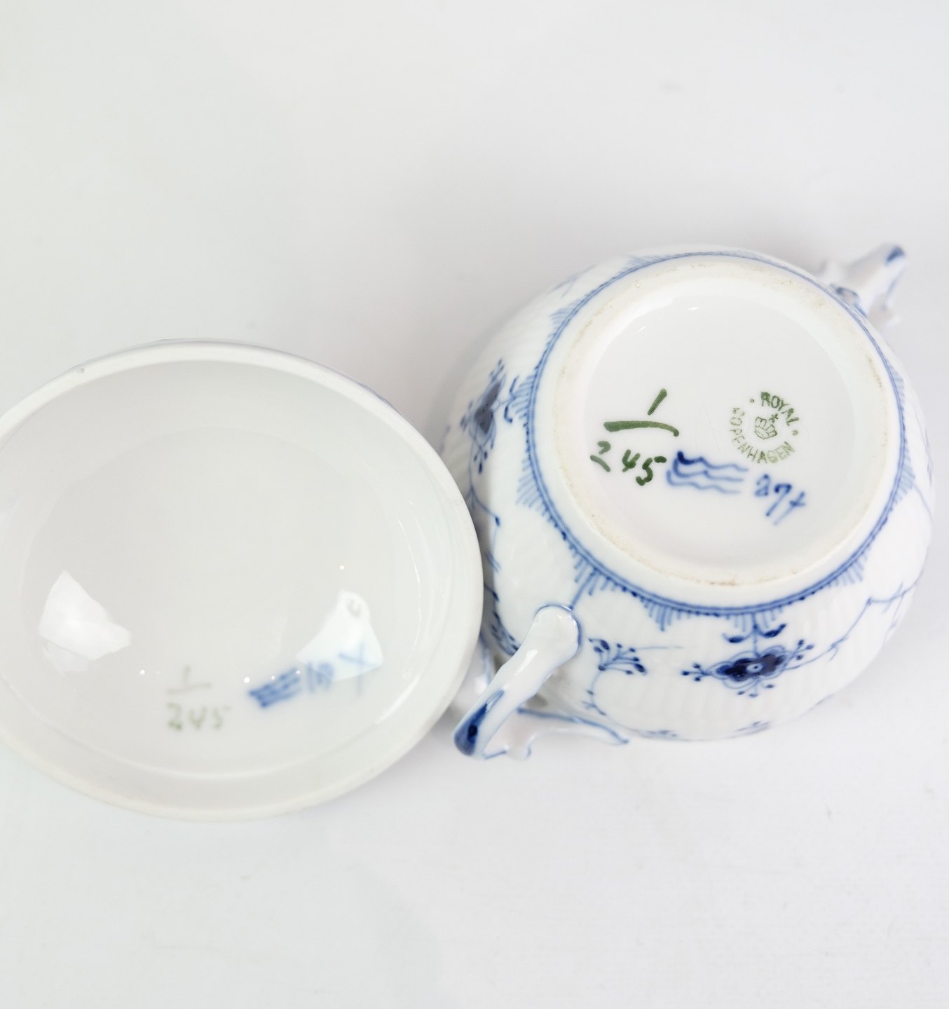 SolgtMusselmalet Riflet sukkerskål fra Royal Copenhagen med nummer 245 er et elegant og tidløst stykke porcelæn, der tilføjer en fornem følelse til din kaffeborddækning.