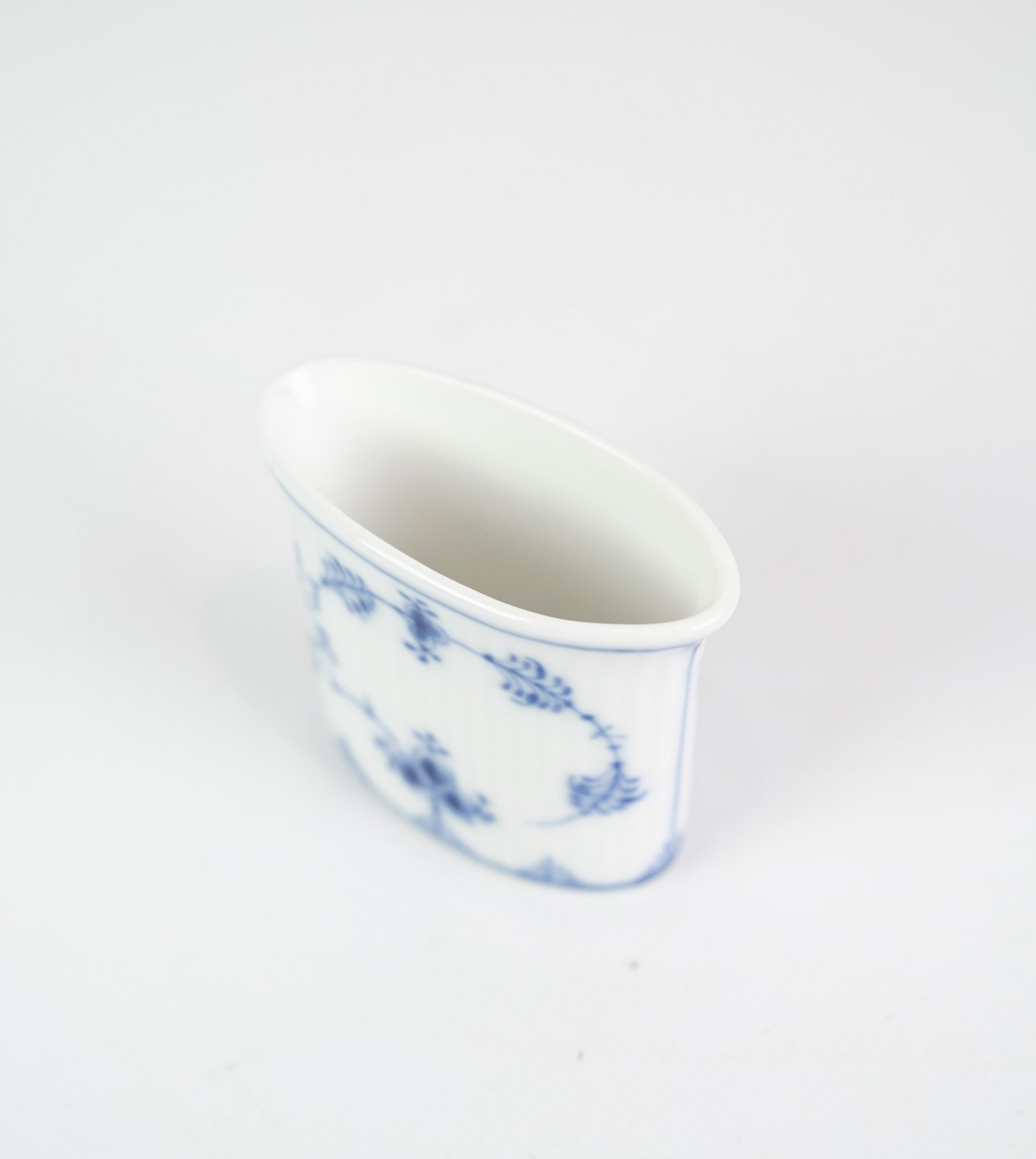 Dette ovalformede bæger/lille vase er en del af den ikoniske Musselmalet Riflet-serie og er kendetegnet ved de karakteristiske rifler, der pryder overfladen. Dekorationsnummeret 1/2183 er en reference til det unikke mønster og design, der er blevet nøje udvalgt til denne vase.