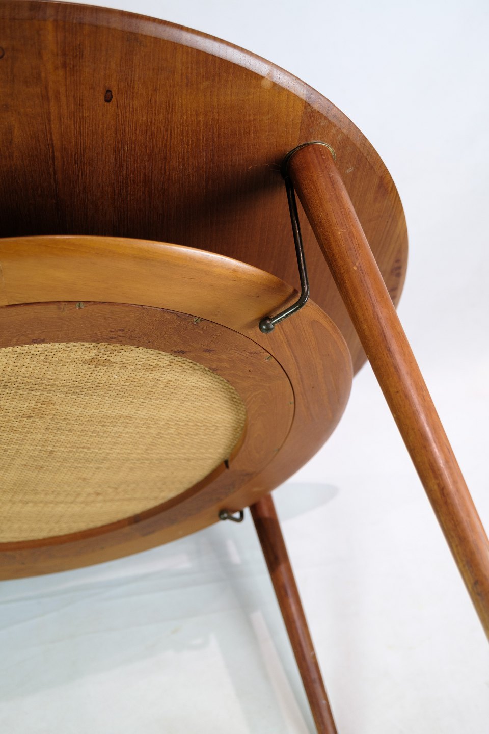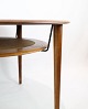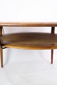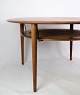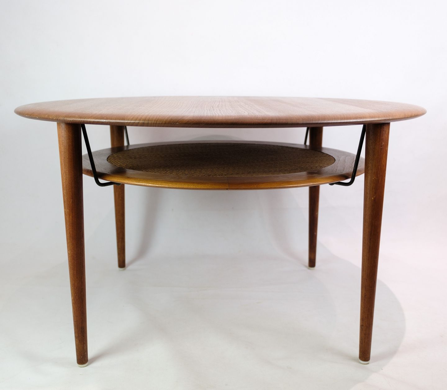 Sofabord, model FD 515, designet af Peter Hvidt 1916-1986 & Orla Mølgaard-Nielsen 1907-1993 fremstillet i teaktræ fra 1956. Sofabordet er monteret med en avishylde i flet og messingbeslag. Fremstillet af producenten France & Daverkosen.