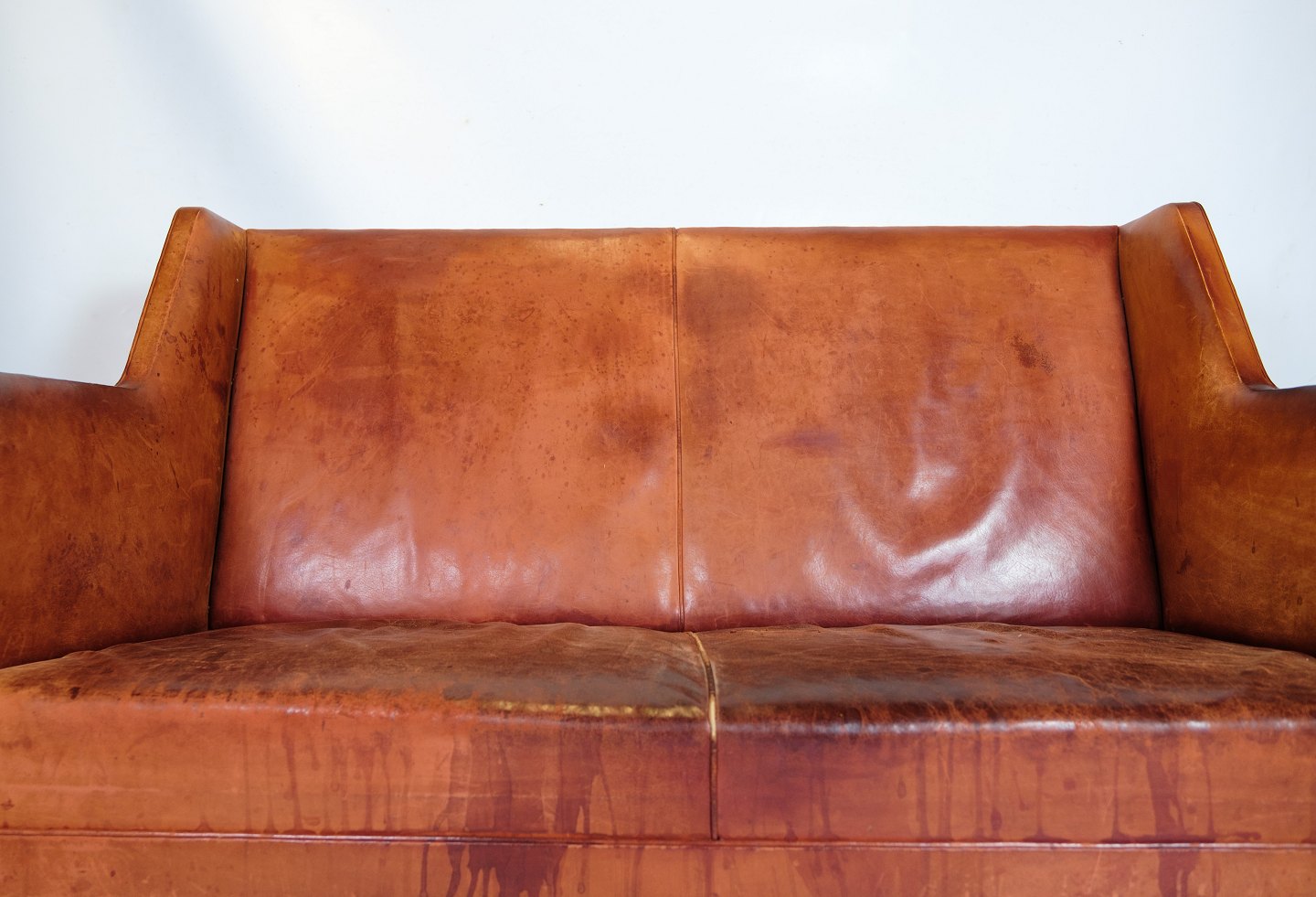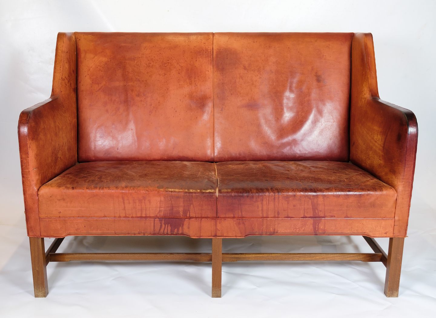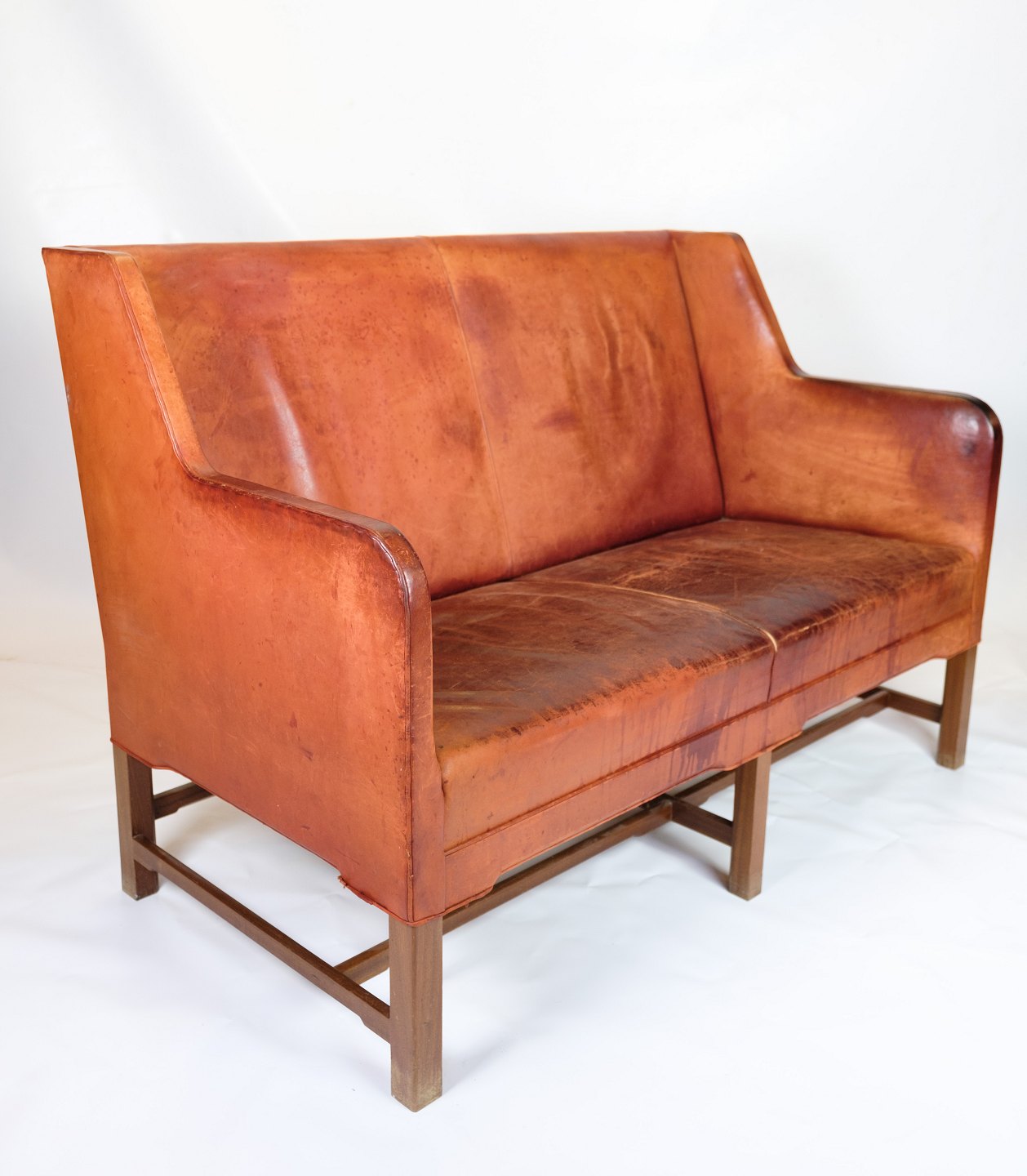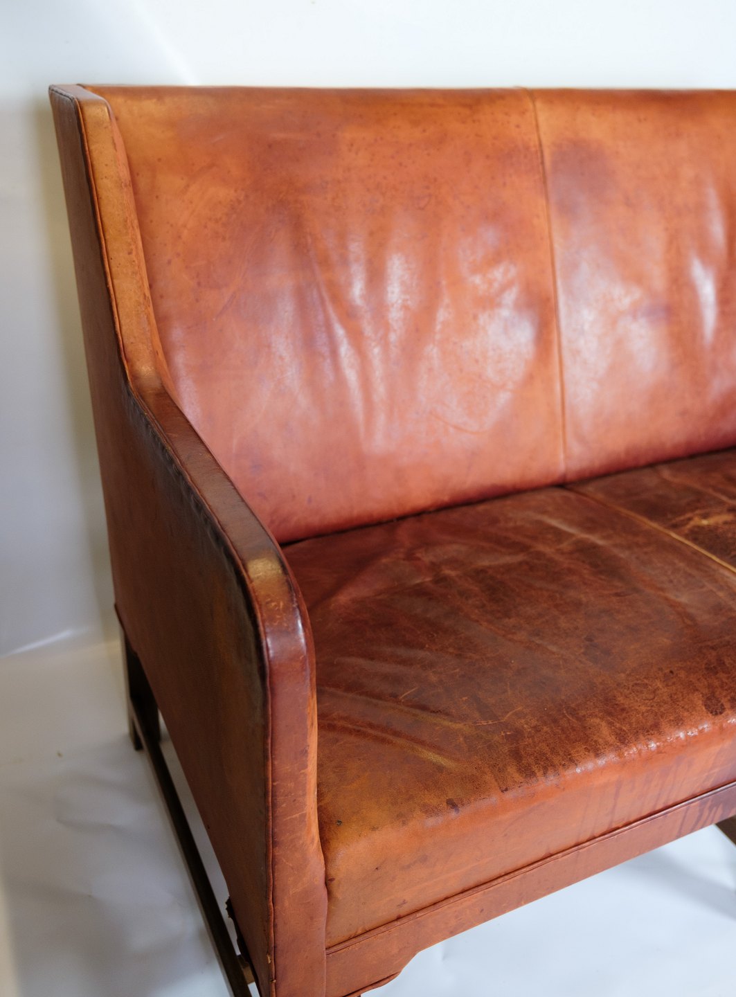 Kontakt os vedrørende prisVintage design to-personers sofa model 5011 skabt af Kaare Klint. Dette ikoniske stykke er lavet i originalt cognac læder og har en karakteristisk seks-benet mahogni base. Sofaen vandt anerkendelse efter at have været fremvist på Københavns Snedkerlaugs udstilling i 1935, hvor den fremhævede dens betydning i dansk moderne designs historie.