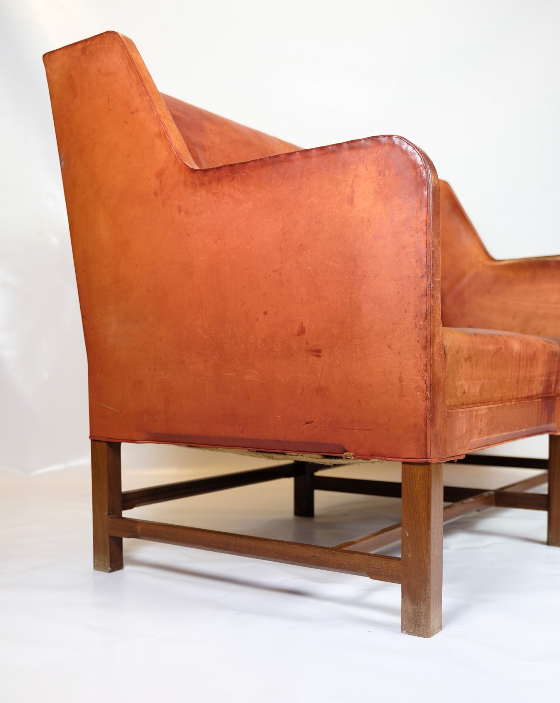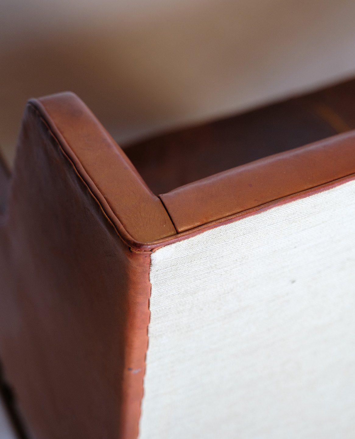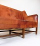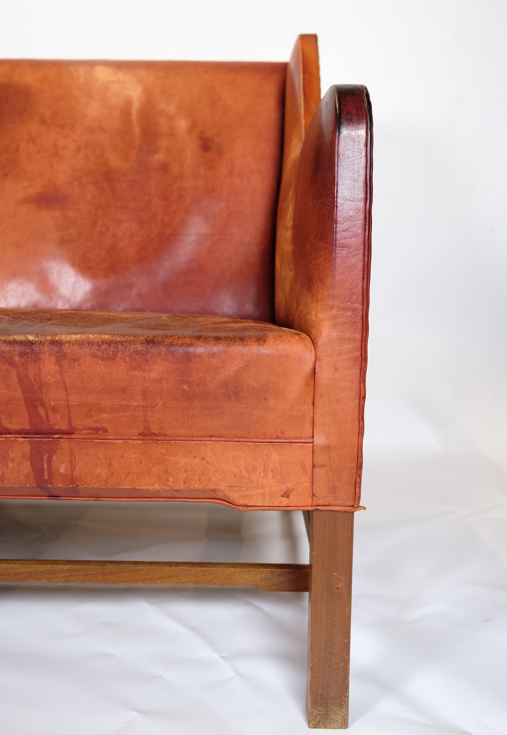 Kontakt os vedrørende prisVintage design to-personers sofa model 5011 skabt af Kaare Klint. Dette ikoniske stykke er lavet i originalt cognac læder og har en karakteristisk seks-benet mahogni base. Sofaen vandt anerkendelse efter at have været fremvist på Københavns Snedkerlaugs udstilling i 1935, hvor den fremhævede dens betydning i dansk moderne designs historie.