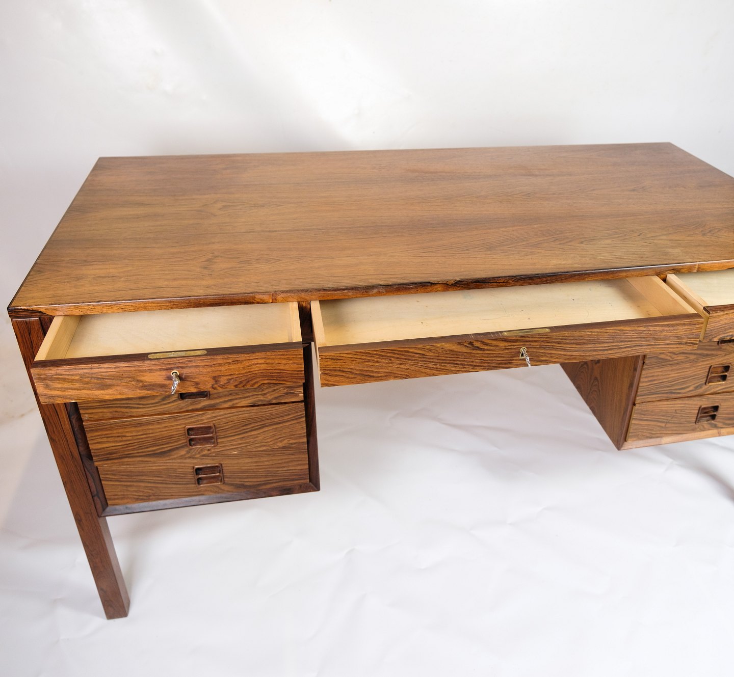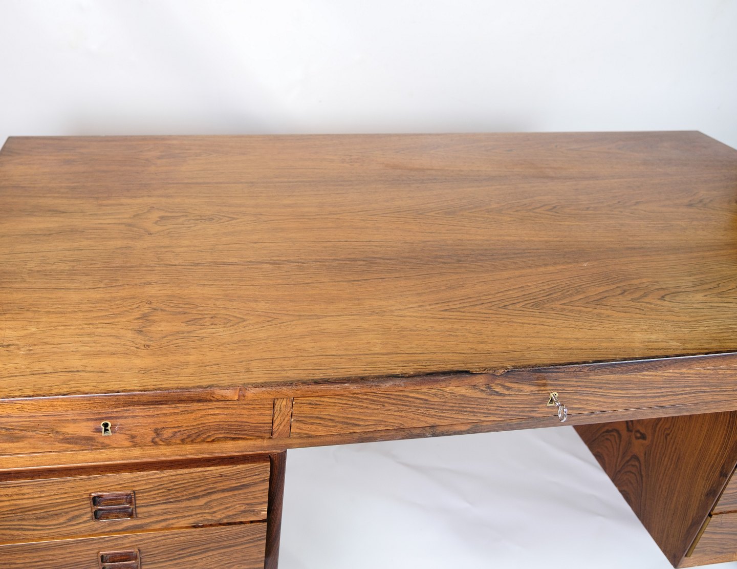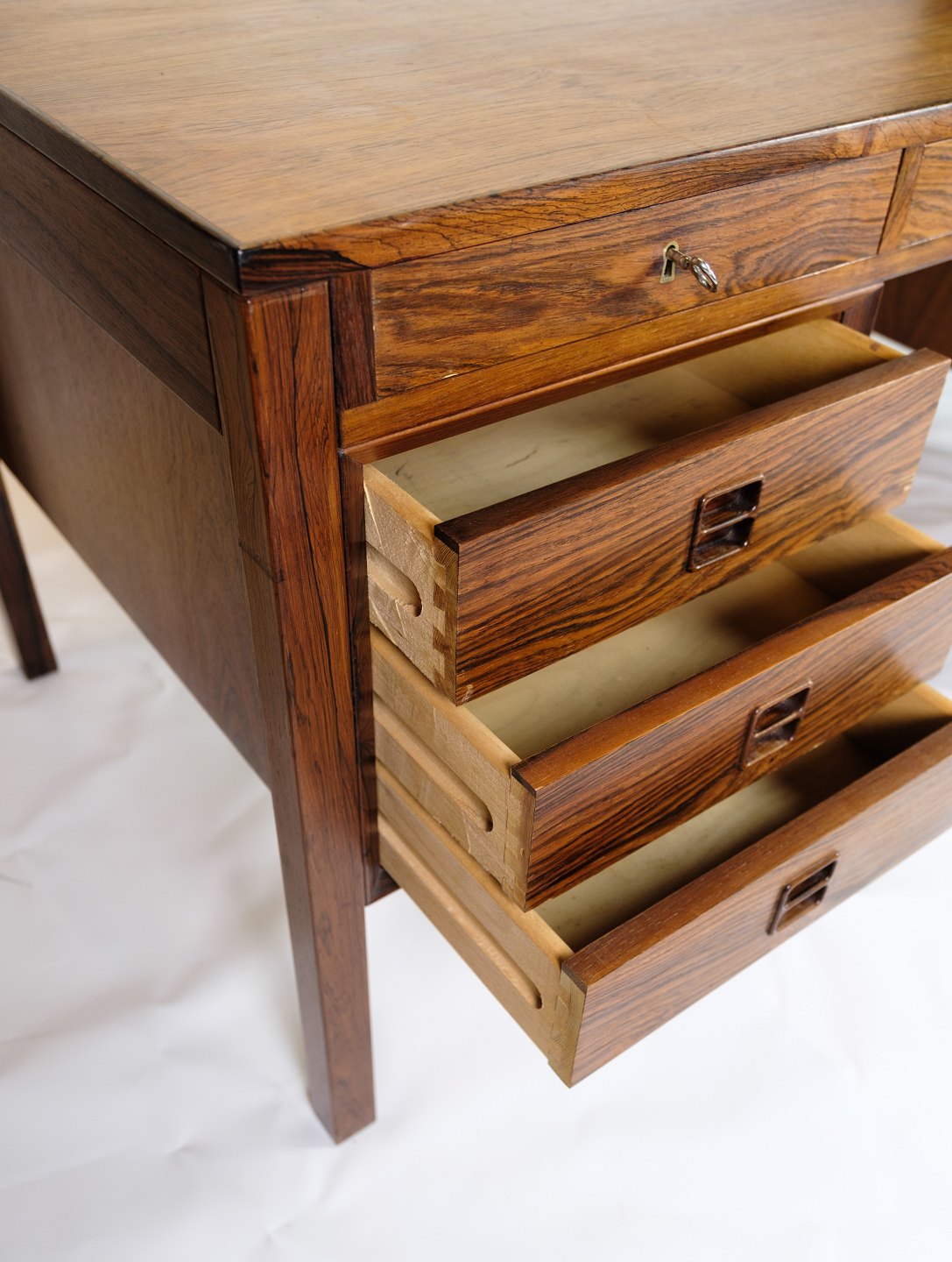 SolgtDette skrivebord er et pragteksemplar af dansk design fra 1960'erne, udført i rosewood, også kendt som palisandertræ. Med sin smukke og varme farvetone og karakteristiske åretegning udstråler dette skrivebord en tidløs elegance og luksus.
