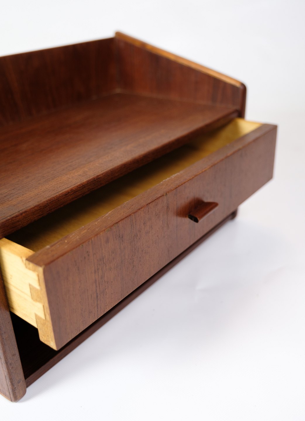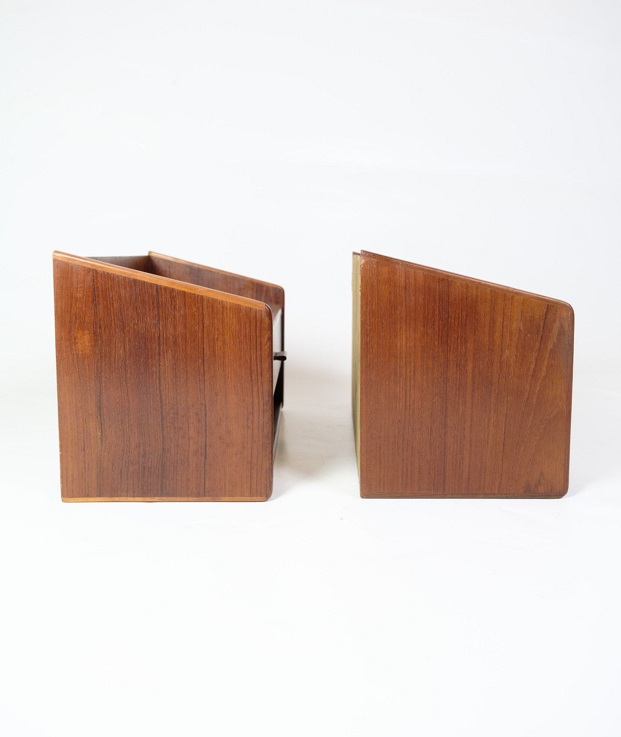 Disse væghængte natborde af teaktræ passer godt ind i den minimalistiske æstetik, der var typisk for 1960'ernes design. Deres væghængte natur frigiver gulvplads og tilføjer en luftighed til rummet, samtidig med at de stadig tilbyder opbevaringsmuligheder med deres skuffer.
