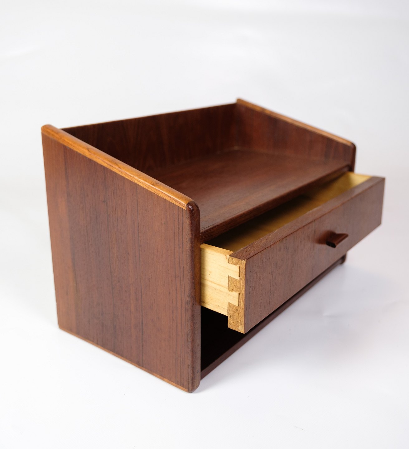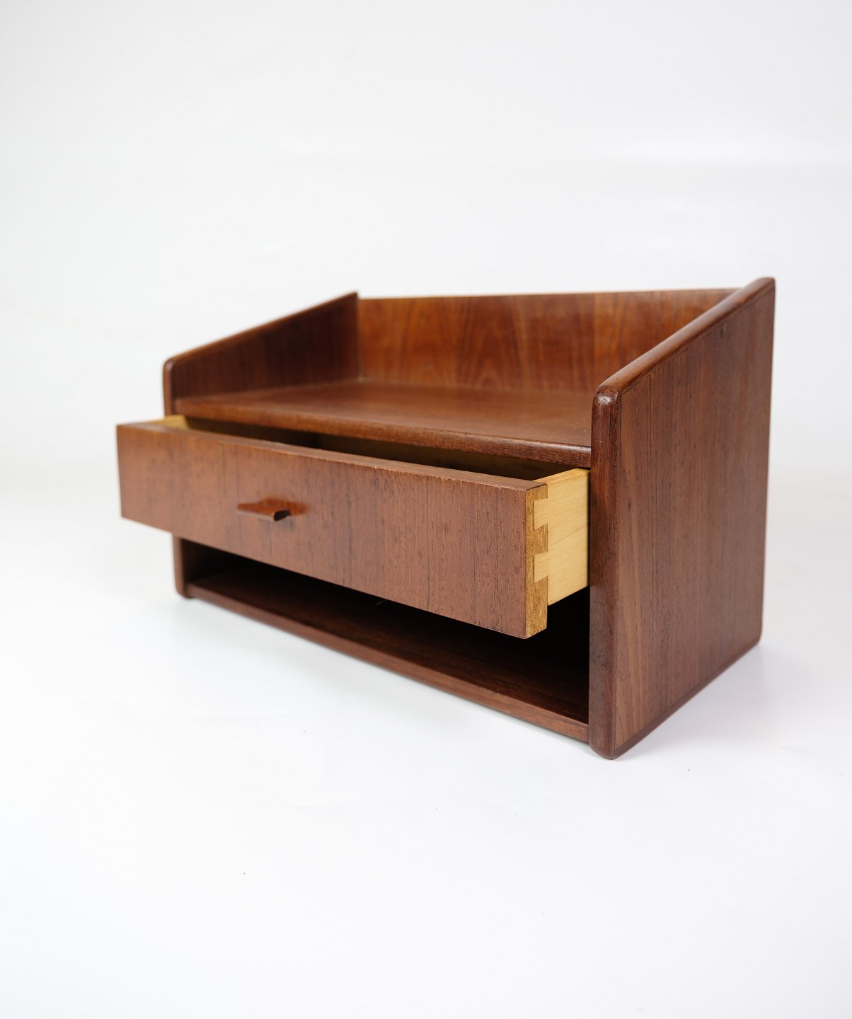 SolgtEt sæt væghængte natborde i teaktræ med skuffer fra omkring 1960'erne repræsenterer en elegant og pladsbesparende løsning til soveværelset med en vintage fornemmelse.