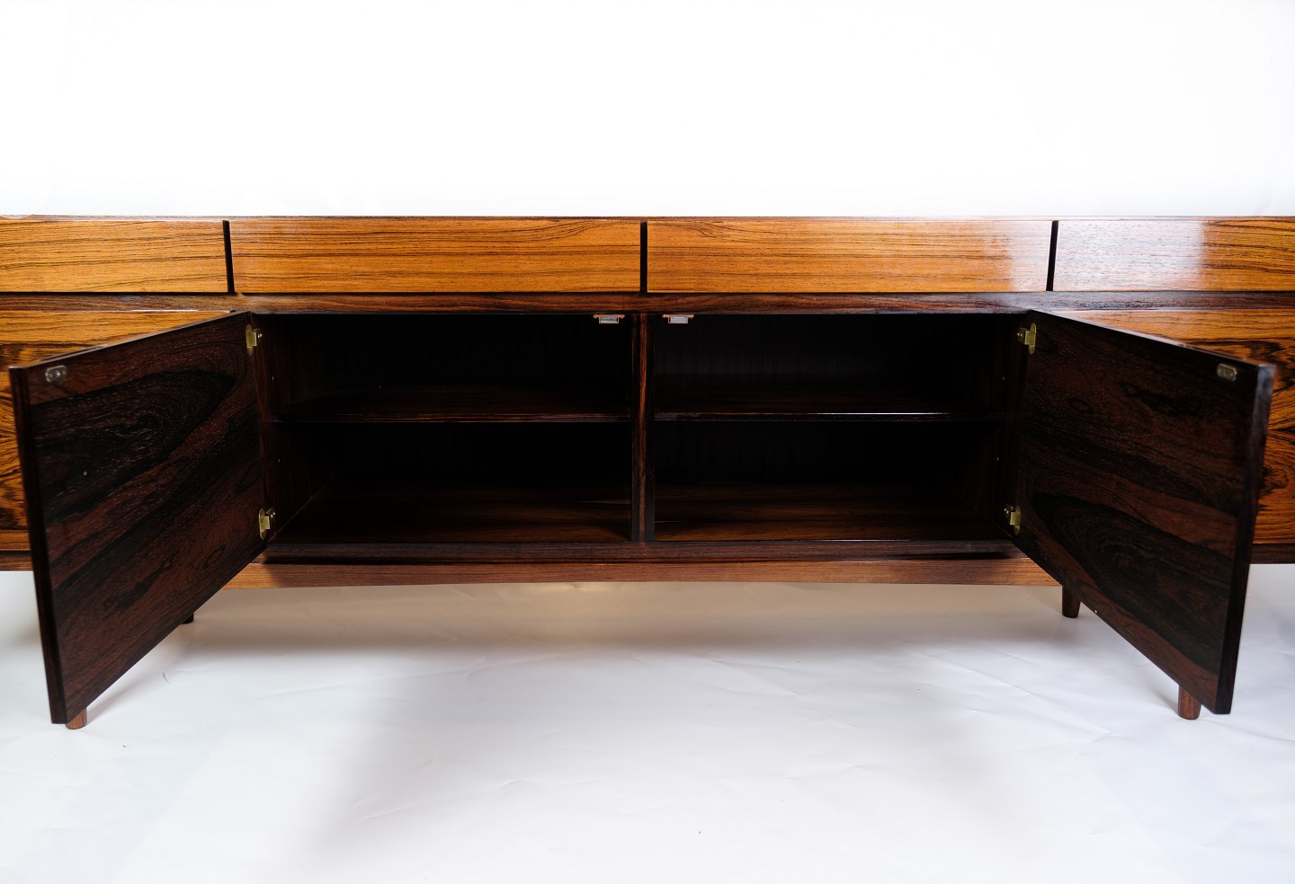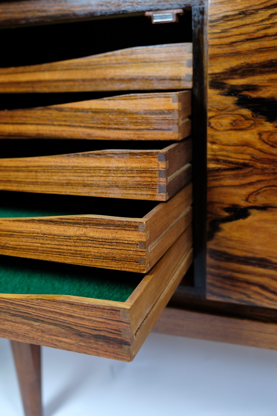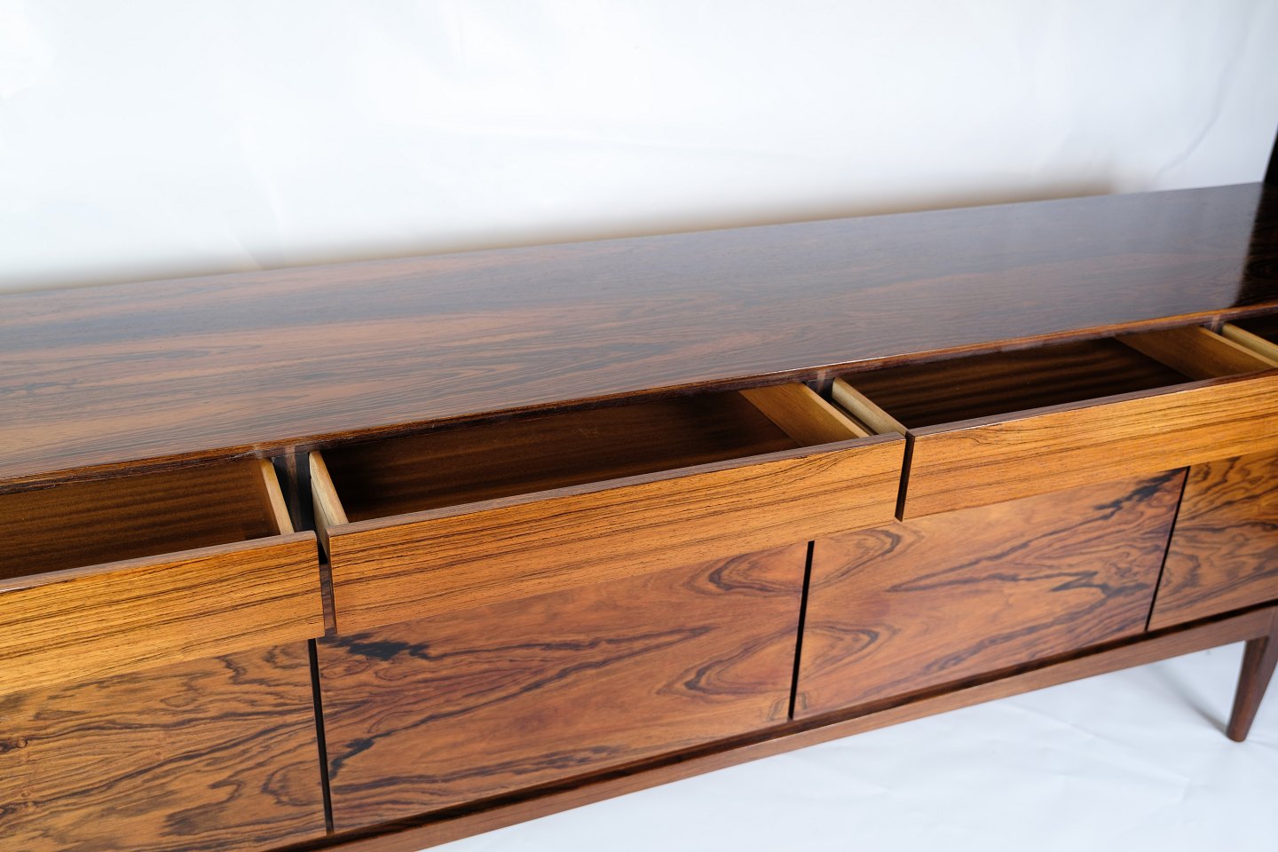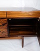 SolgtEn skænk i palisander designet af Ib Kofod-Larsen, model FA66, fremstillet hos Faarup Møbelfabrik i 1960'erne, er en sand perle af håndværksmæssig kvalitet. Denne lave, fritstående skænk udmærker sig ved sin fortræffelige udførelse i palisanderfinér med en fortryllende struktur.