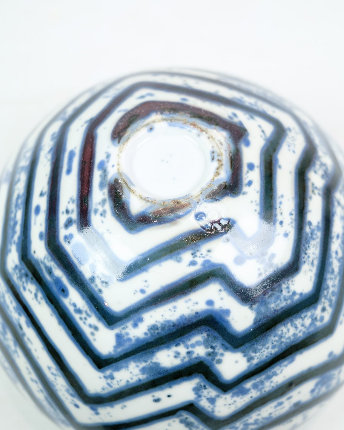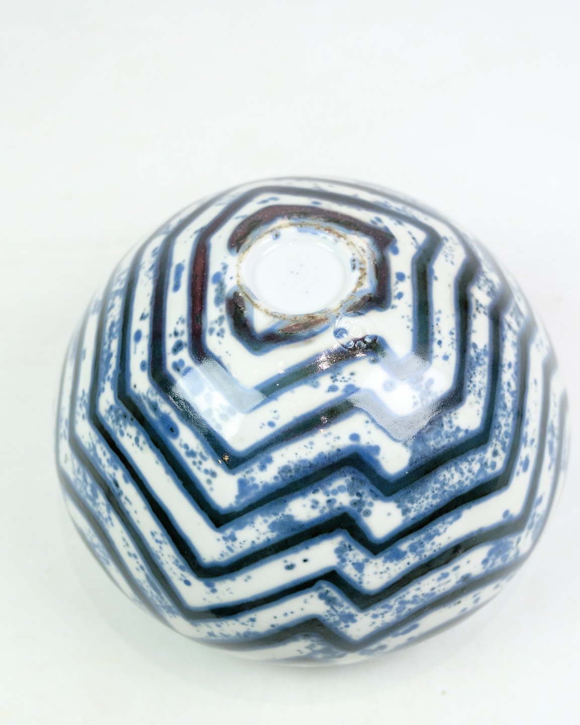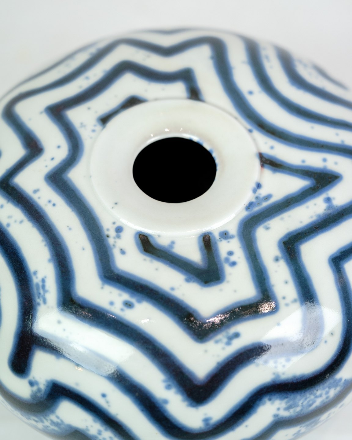 Kontakt os vedrørende prisKeramikvase af Per Weiss (1953-2023) mønstret med blå og hvide farver fra omkring 1990'erne. Per Weiss var en anerkendt dansk keramiker kendt for sit talent og hans bidrag til kunsthåndværkets verden. Han var bosat i Gammel Lejre, hvor han udførte sit håndværk og havde sin butik.