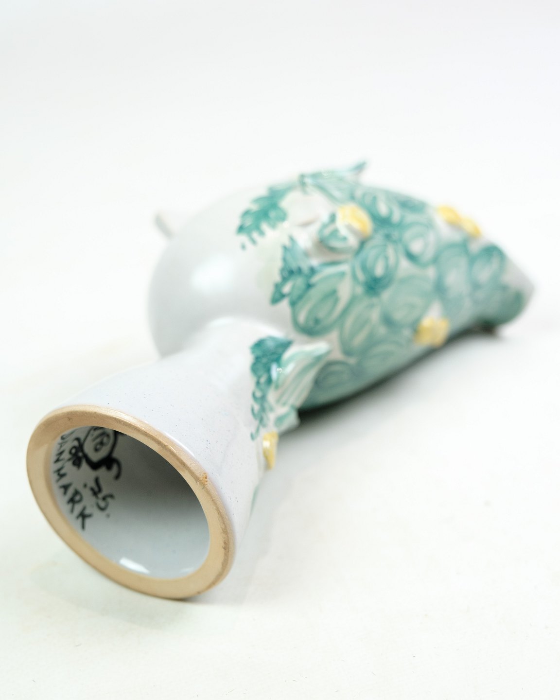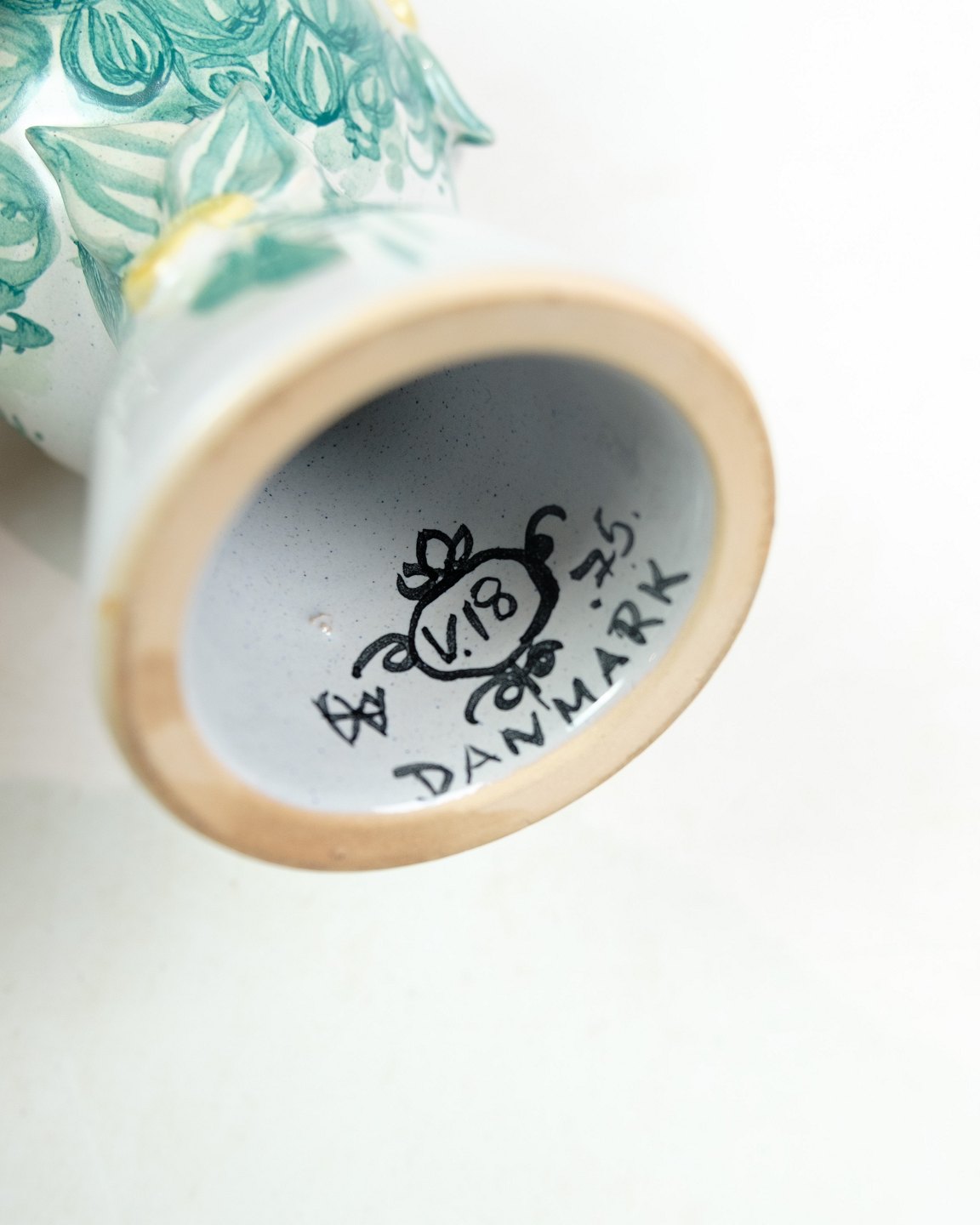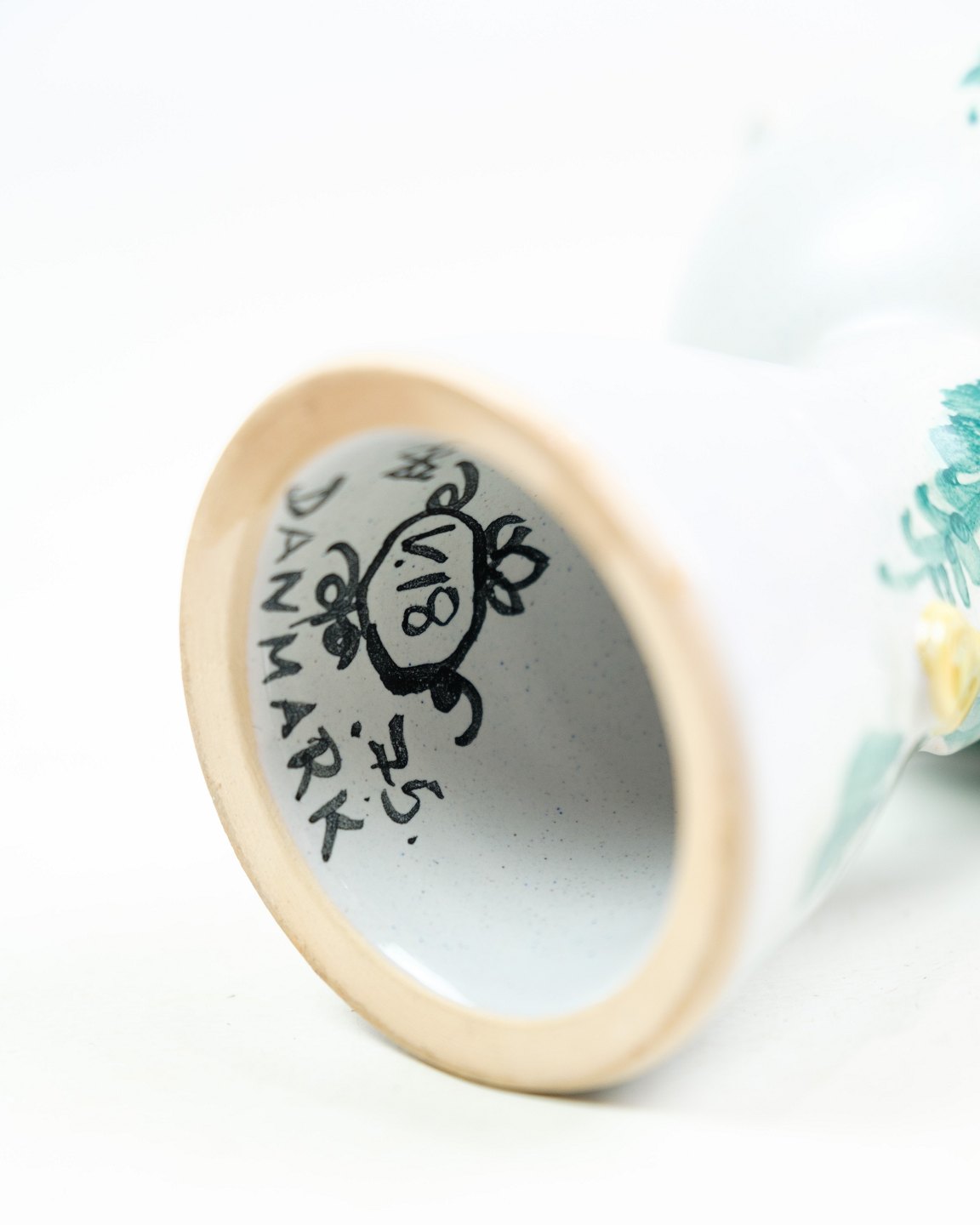 Keramikvase designet af Bjørn Wiinblad, med Dessinnr. V18 fra 1975, produceret i Danmark. Denne vase repræsenterer Wiinblads karakteristiske stil, der ofte omfattede fantasifulde og farverige mønstre. Med en tidstypisk indflydelse fra 1970'erne er denne vase ikke kun en funktionel genstand, men også et kunstværk, der afspejler designerens unikke æstetik. Et samlerobjekt for elskere af dansk design og Bjørn Wiinblads kreative værker.