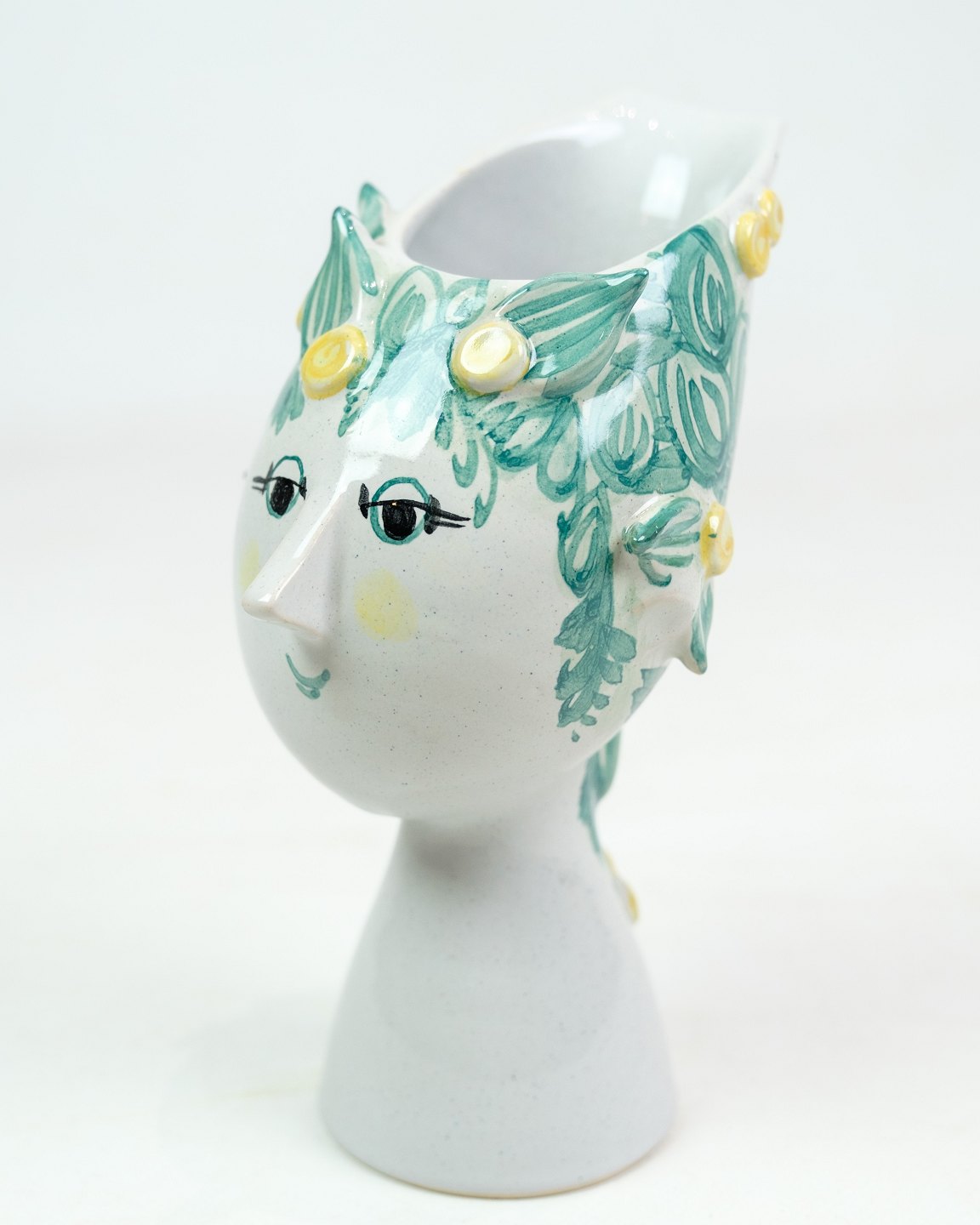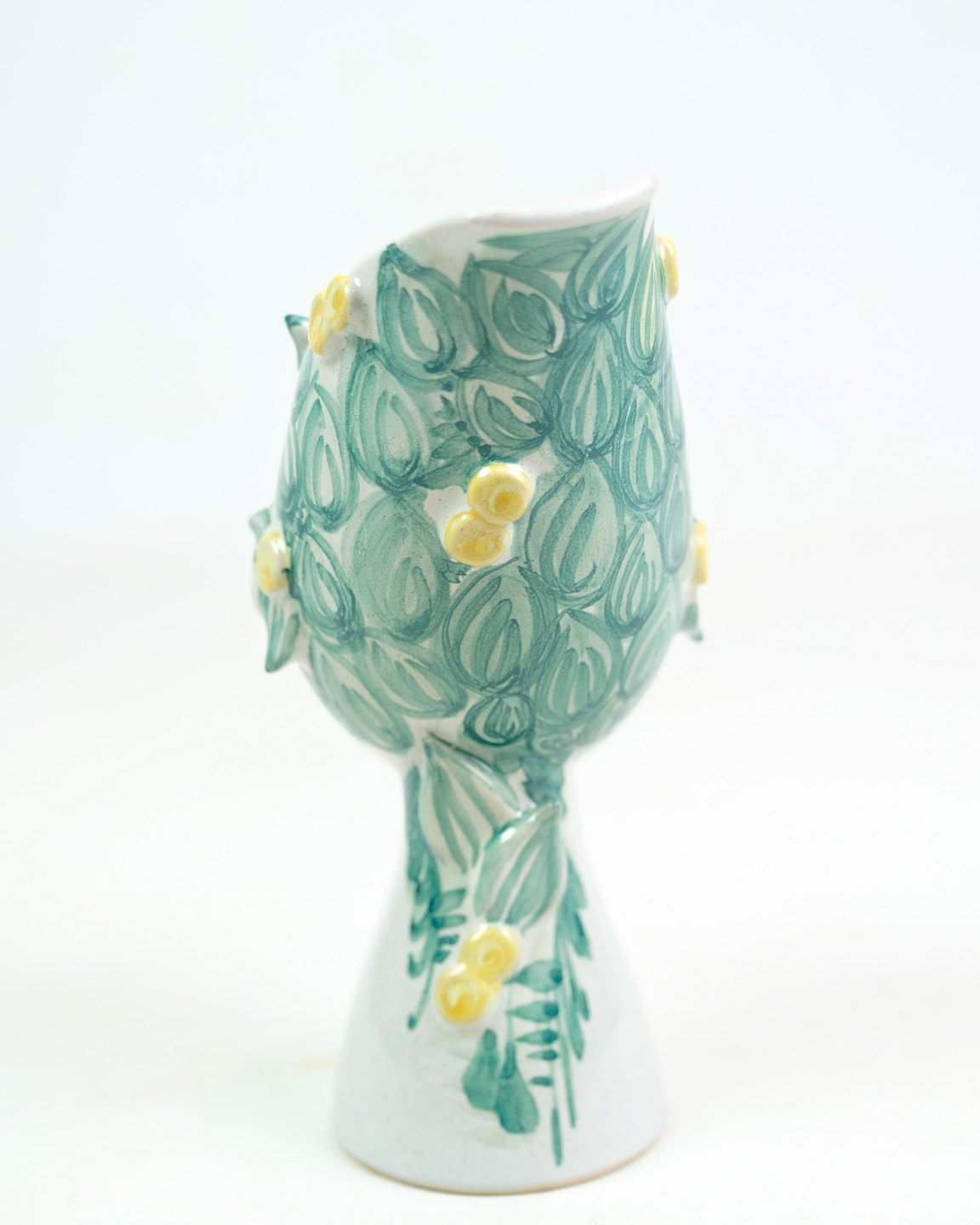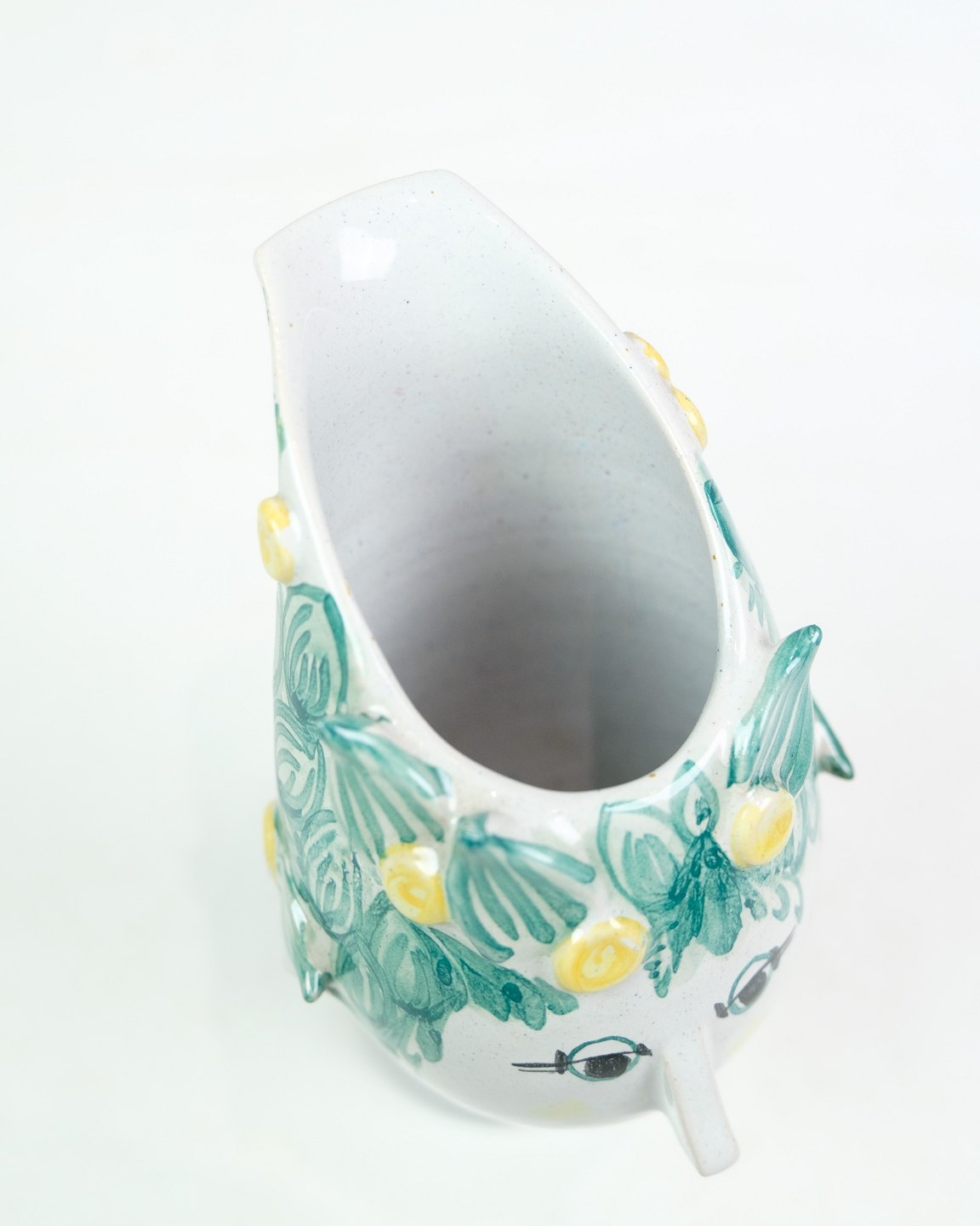 Keramikvase designet af Bjørn Wiinblad, med Dessinnr. V18 fra 1975, produceret i Danmark. Denne vase repræsenterer Wiinblads karakteristiske stil, der ofte omfattede fantasifulde og farverige mønstre. Med en tidstypisk indflydelse fra 1970'erne er denne vase ikke kun en funktionel genstand, men også et kunstværk, der afspejler designerens unikke æstetik. Et samlerobjekt for elskere af dansk design og Bjørn Wiinblads kreative værker.