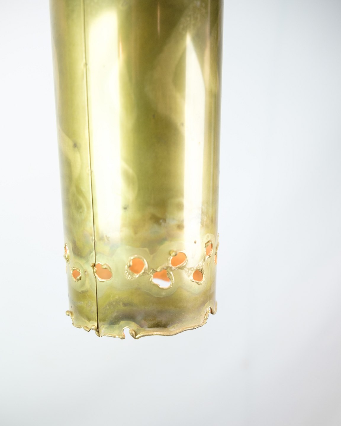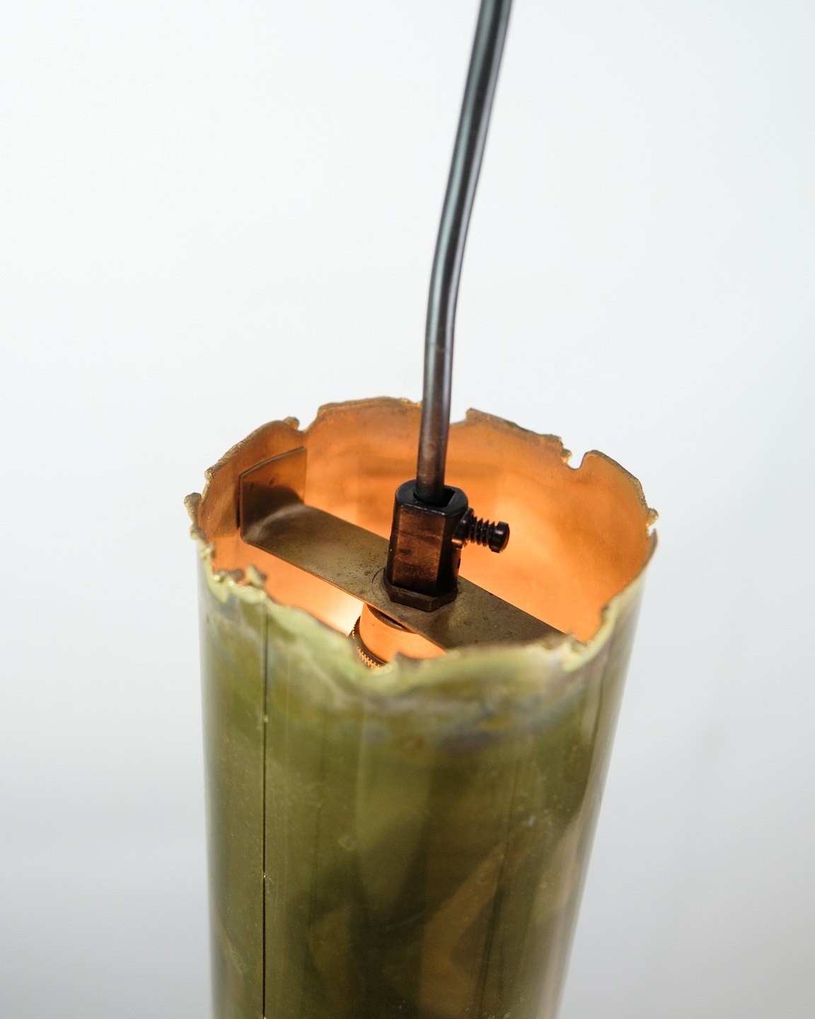 Loftlampen i messing, præget af en karakteristisk cylinderform og en sort ledning, er et bemærkelsesværdigt eksempel på belysningsdesign fra 1960'erne, skabt af den dygtige designer Sven Aage Holm Sørensen. Dette ikoniske stykke fanger ånden af dansk modernisme med sin enkle, men elegant udformede struktur.