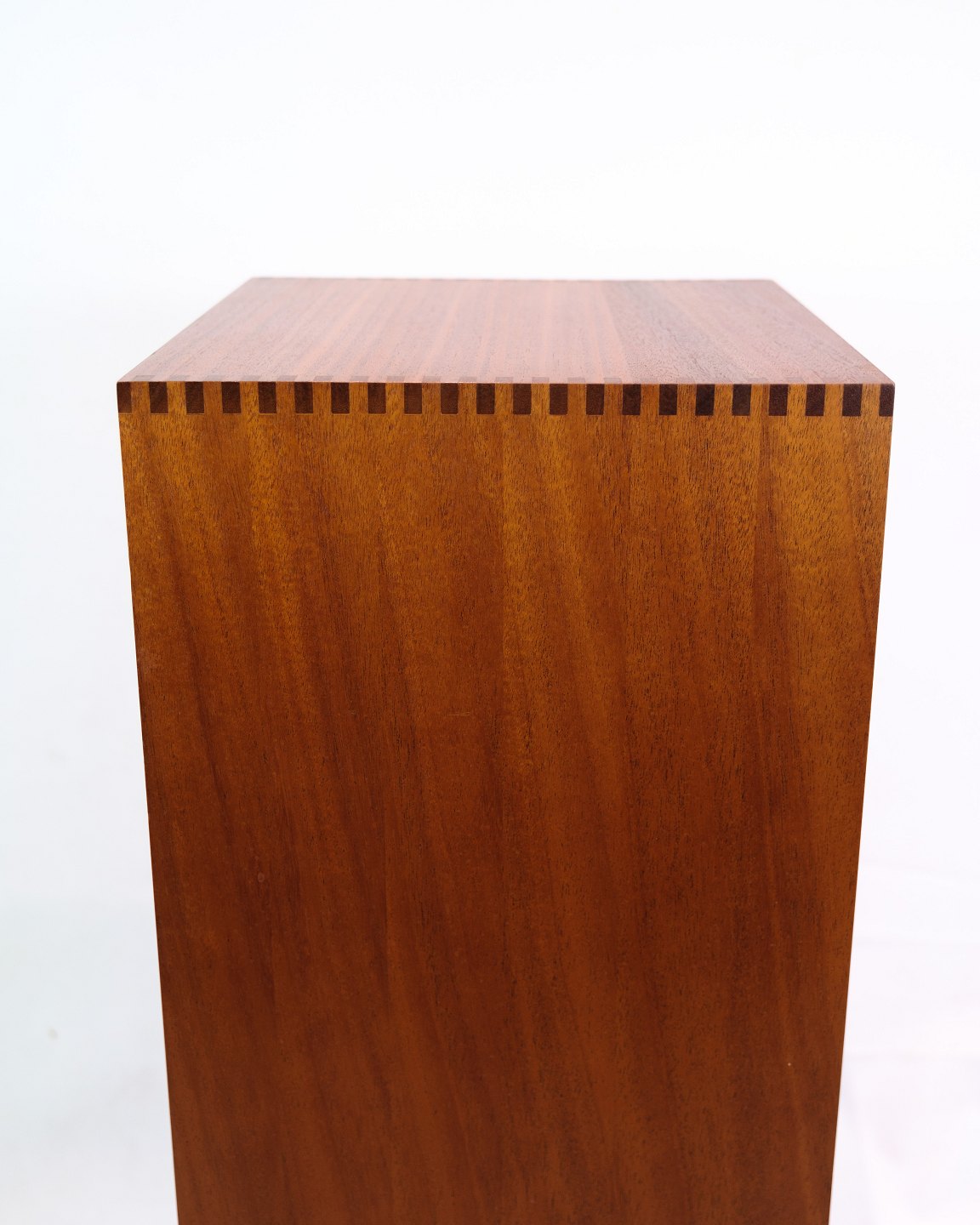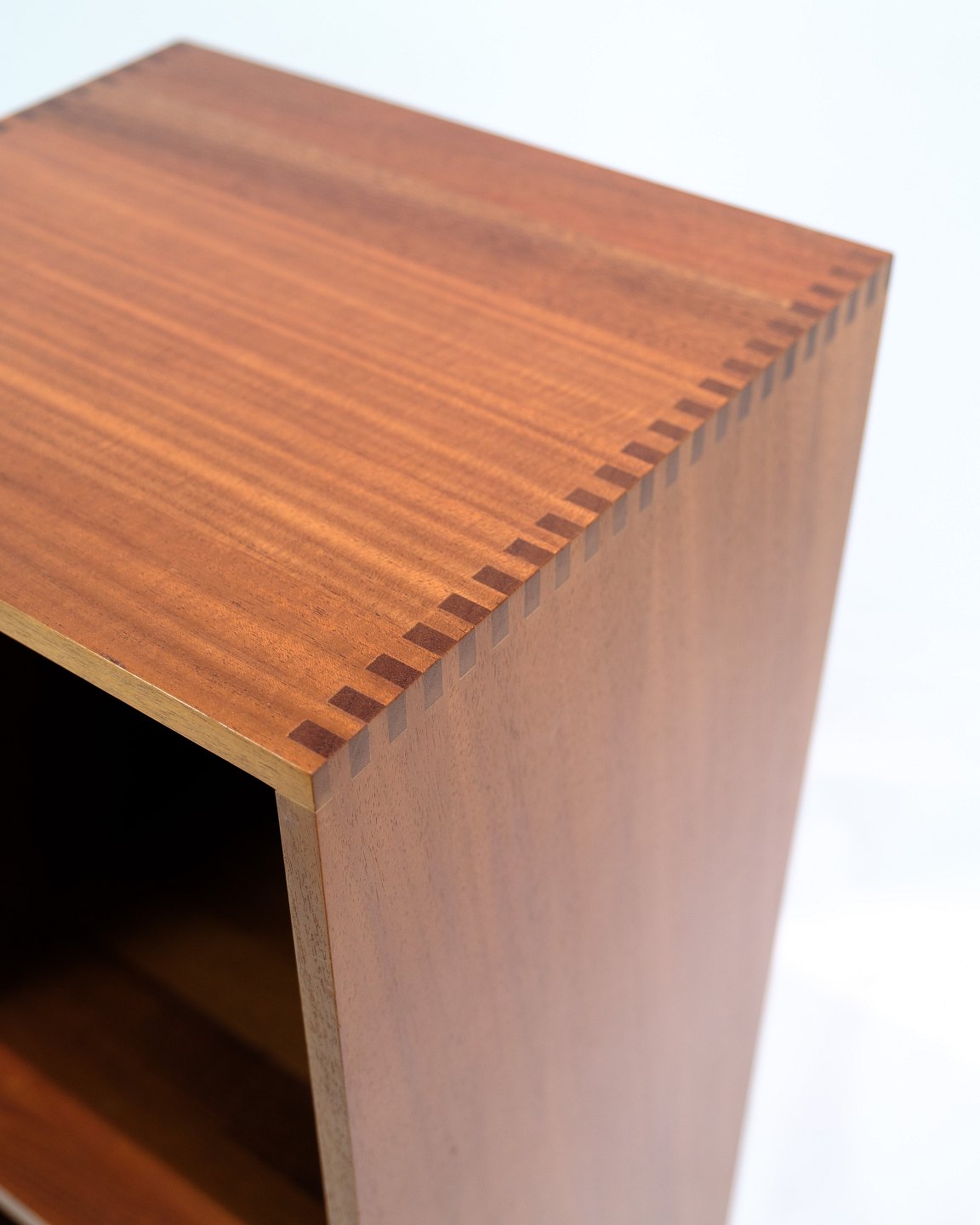 Denne reol med hylde er et eksempel på dansk design fra 1960'erne, lavet af Mahogni. Den repræsenterer en æra, hvor dansk møbeldesign blomstrede og opnåede international anerkendelse for sin enkelhed, funktionalitet og høje kvalitet. Typisk for mange møbler fra denne periode er reolen sandsynligvis karakteriseret ved rene linjer, elegant træbearbejdning og et minimalistisk udtryk. Produkter som disse var populære i danske hjem og er stadig eftertragtede som samlerobjekter og emblematiske repræsentanter for den danske modernistiske æstetik.