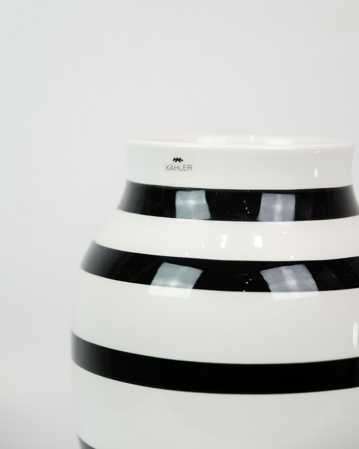 Kähler er en uundværlig favorit i utallige hjem takket være sit klassiske udseende og moderne design. Denne smukke vase, der er en del af en serie, passer perfekt til det skandinaviske hjem med sit enkle, men alligevel iøjnefaldende udtryk. Hver Kähler-vase i serien er håndmalet, hvilket betyder, at ingen to er helt ens. Den unikke charme og personlighed, der følger med variationerne i farve og bredde på striberne, gør hver vase til et kunstværk i sig selv. Tilføj et strejf af elegance og individualitet til dit hjem med en Kähler-vase, der vil pryde ethvert rum med sin skønhed og unikke karakter.