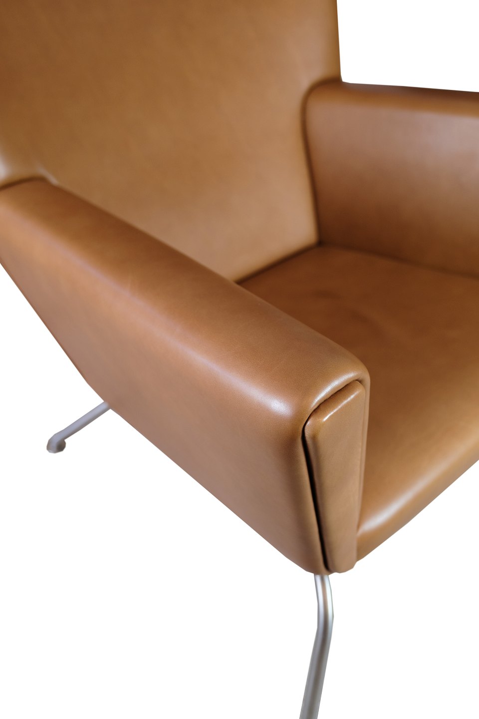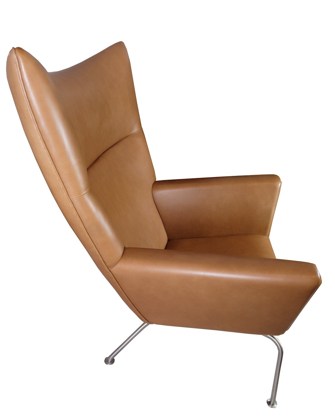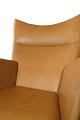Betrukket med elegance læder i en varm valnødfarve tilføjer den en sofistikeret og luksuriøs fornemmelse til ethvert rum. Wegners fokus på håndværk og komfort skinner igennem i denne stol, der både er smuk og funktionel. Med sit tidløse design er denne lænestol ikke blot et møbel, men en investering i stil og komfort, der vil blive værdsat i mange år fremover. Det er muligt at tilkøbe skammel i præcis samme læder.