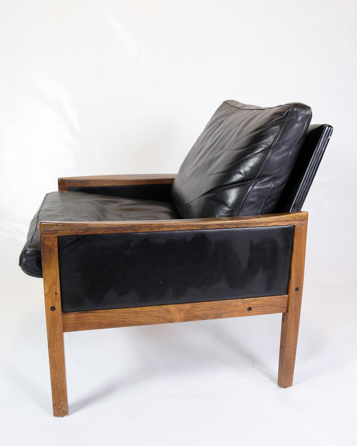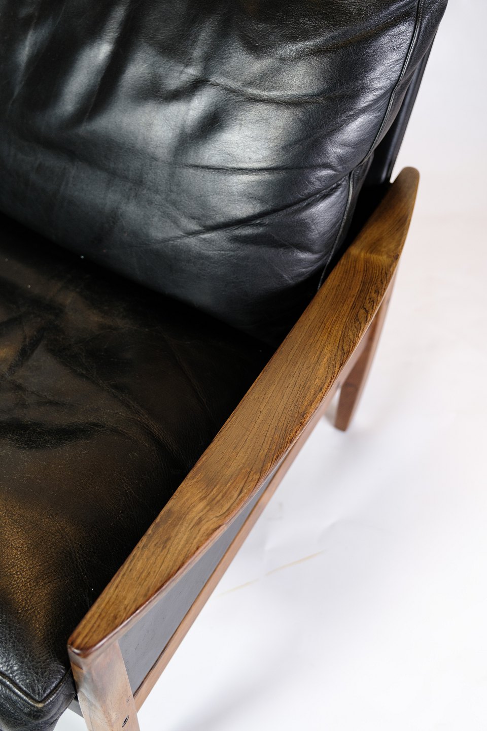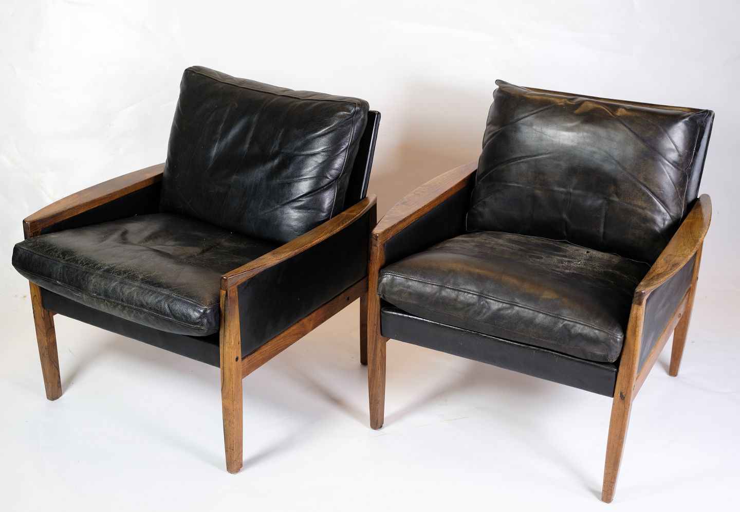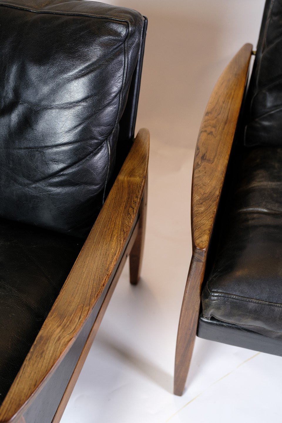 SolgtDette sæt af to elegante lænestole i palisander med sorte læderhynder udstråler klassisk dansk design på sit fineste. Palisandertræets rige farve og smukke korn giver disse stole en luksuriøs og tidløs elegance, mens det bløde, sorte læder sikrer en behagelig siddeoplevelse.