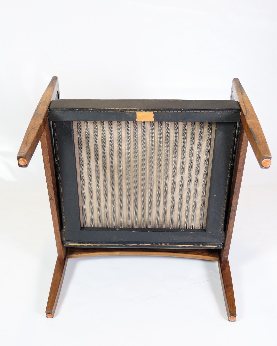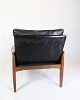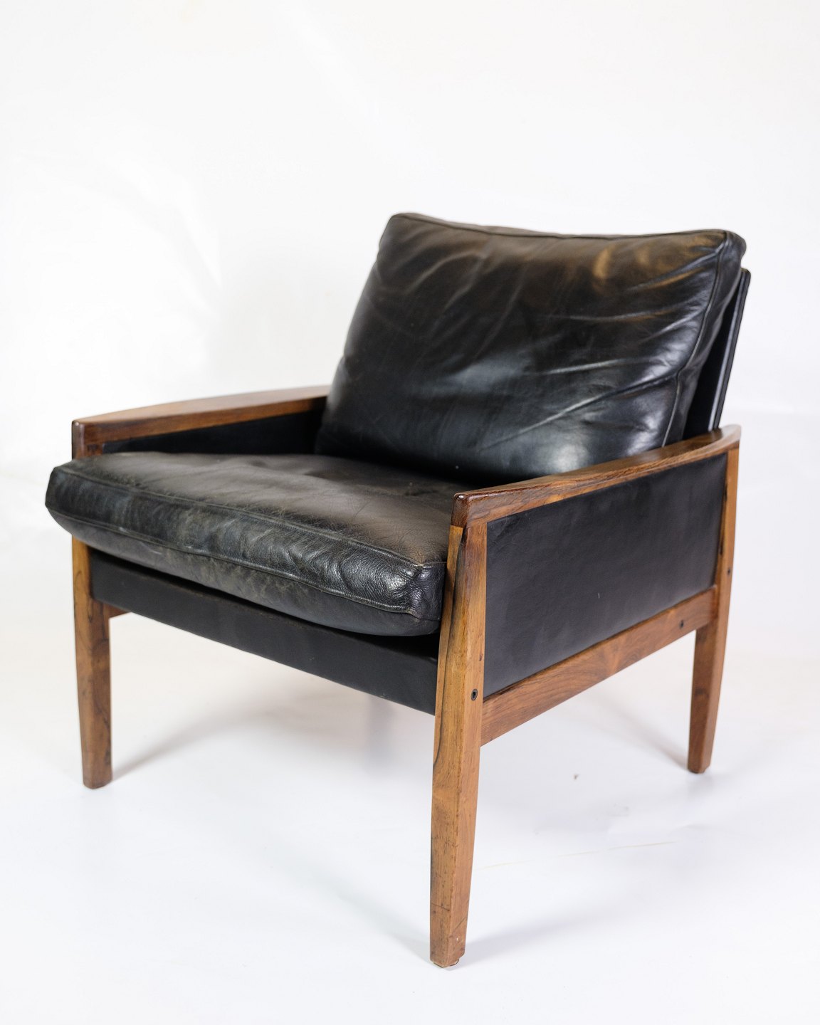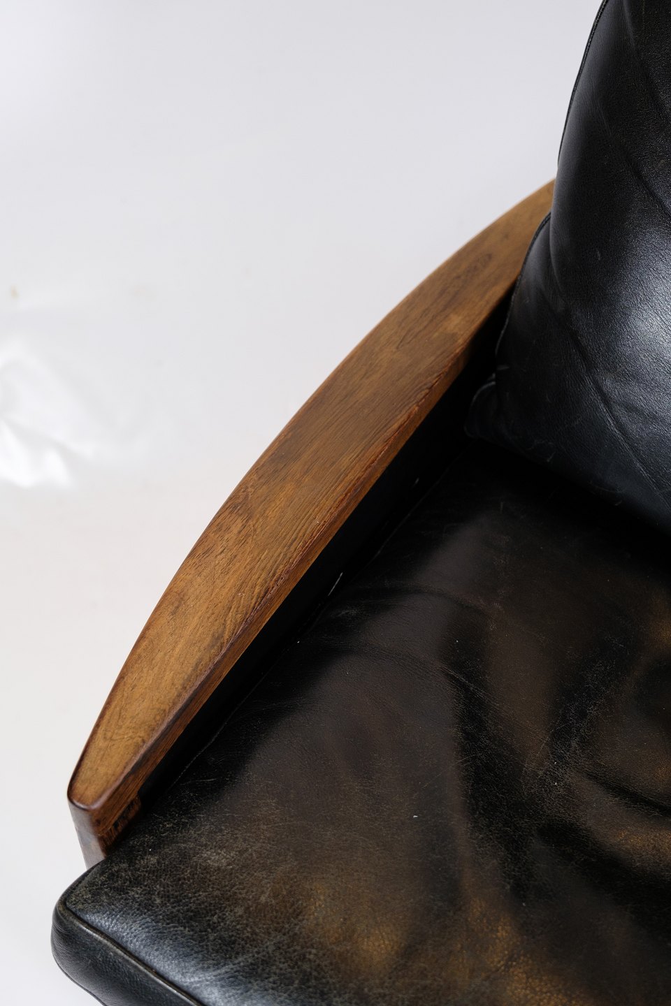 SolgtDette sæt af to elegante lænestole i palisander med sorte læderhynder udstråler klassisk dansk design på sit fineste. Palisandertræets rige farve og smukke korn giver disse stole en luksuriøs og tidløs elegance, mens det bløde, sorte læder sikrer en behagelig siddeoplevelse.