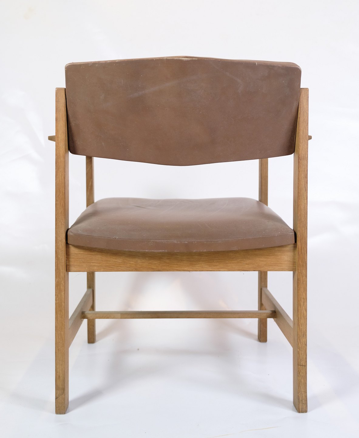 Kontorstol fra 1970, fremstillet af robust egetræ og polstret med brunt læder. Denne tidløse design vil tilføre et strejf af elegance til ethvert kontor eller studie. Med sit ergonomiske design og holdbare materialer er den ikke kun stilfuld, men også komfortabel og funktionel. En smuk blanding af æstetik og praktisk anvendelighed med denne charmerende kontorstol fra 1970.