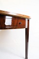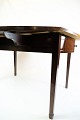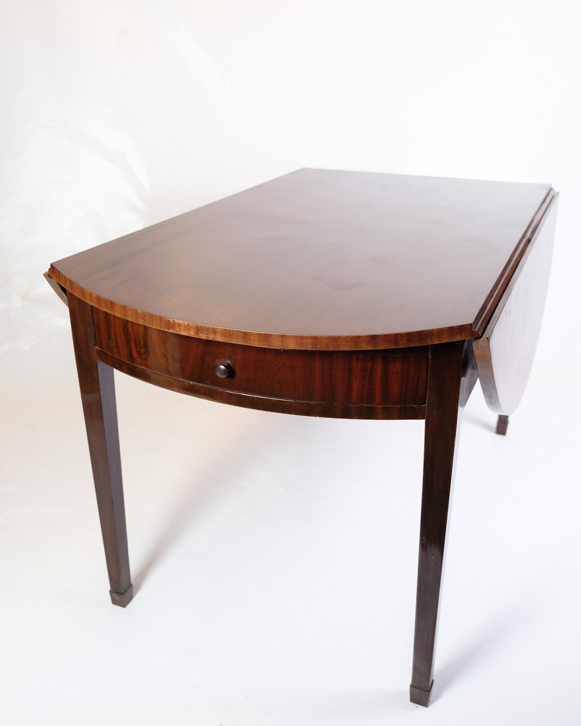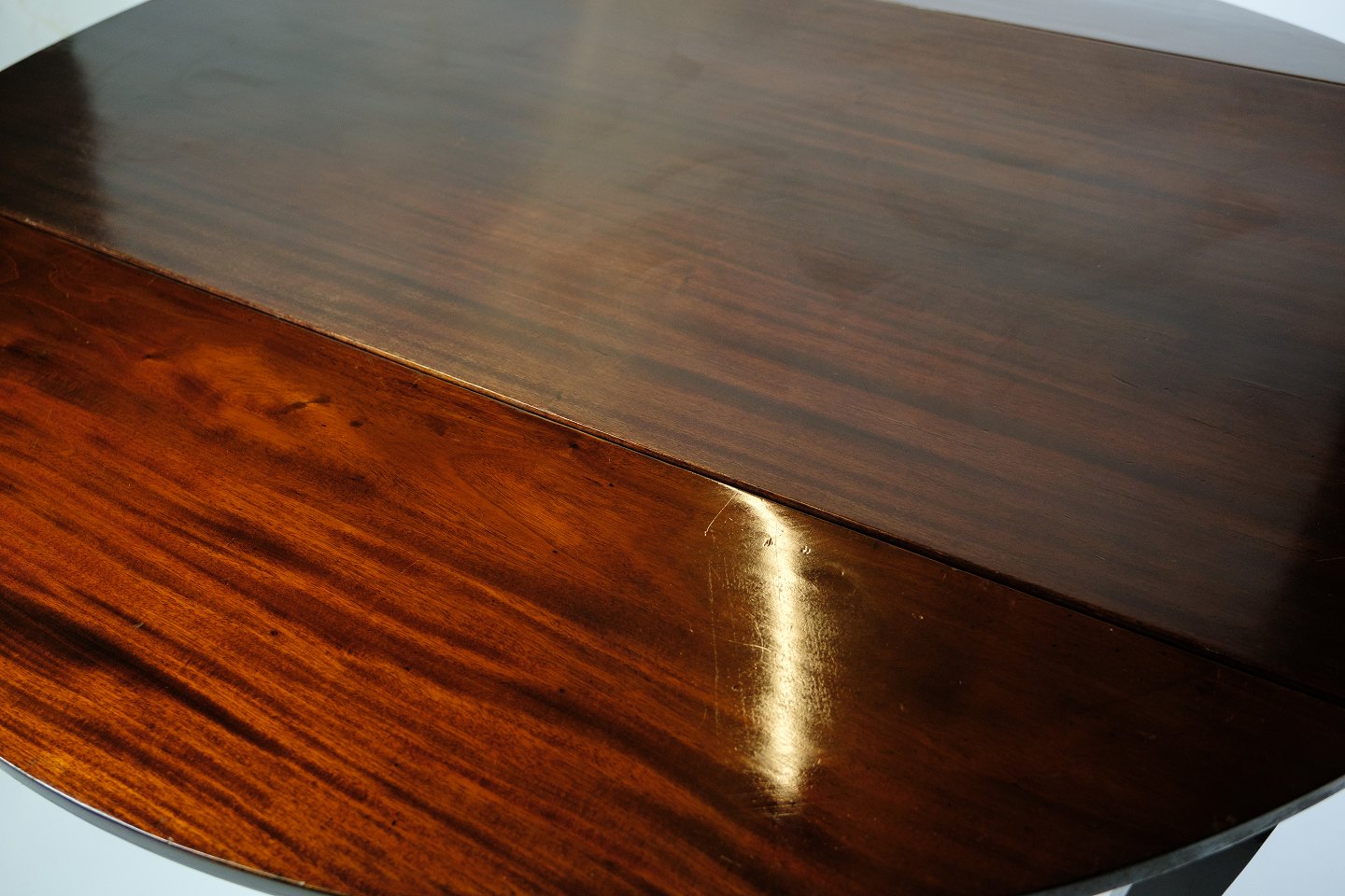 SolgtDette antikke klapbord/spisebord fra cirka 1840 er et vidunderligt eksempel på klassisk håndværk og tidløs elegance. Fremstillet af poleret mahognitræ udstråler bordet varme og skønhed med sit smukke træmønster. Det unikke design inkluderer en praktisk skuffe, der tilføjer funktionalitet til bordet. Med sin ældre alder bærer bordet en autentisk patina, der kun øger dets historiske appel.