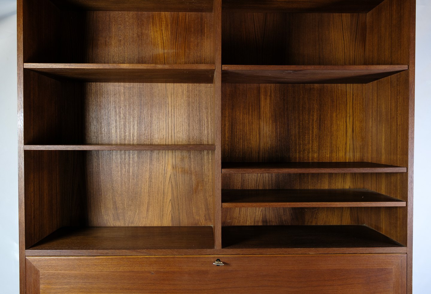 Denne imponerende reol med sekretær/skrivebord er lavet af teak og er fra 1960'erne, er et mesterværk af funktionalitet og æstetik. Med sit smukke teaktræ og karakteristiske design udstråler denne reol en tidløs elegance og enkelhed, der er kendetegnende for dansk design.