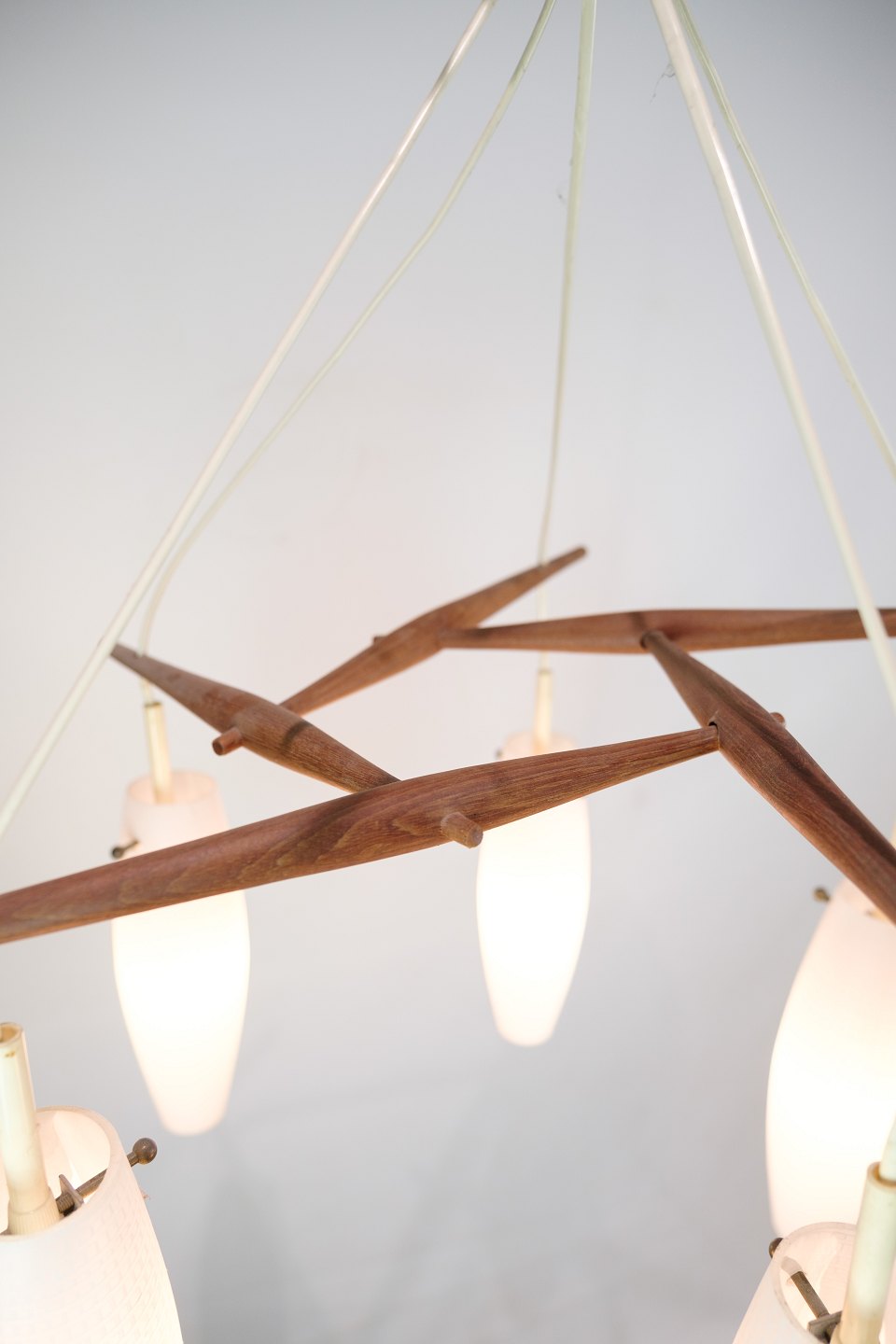 Teaktræets varme farve og opalglasets bløde belysning skaber en behagelig atmosfære i ethvert rum. Denne kombination af materialer giver lampen et organisk udseende, der passer perfekt til både moderne og retroindretninger.