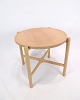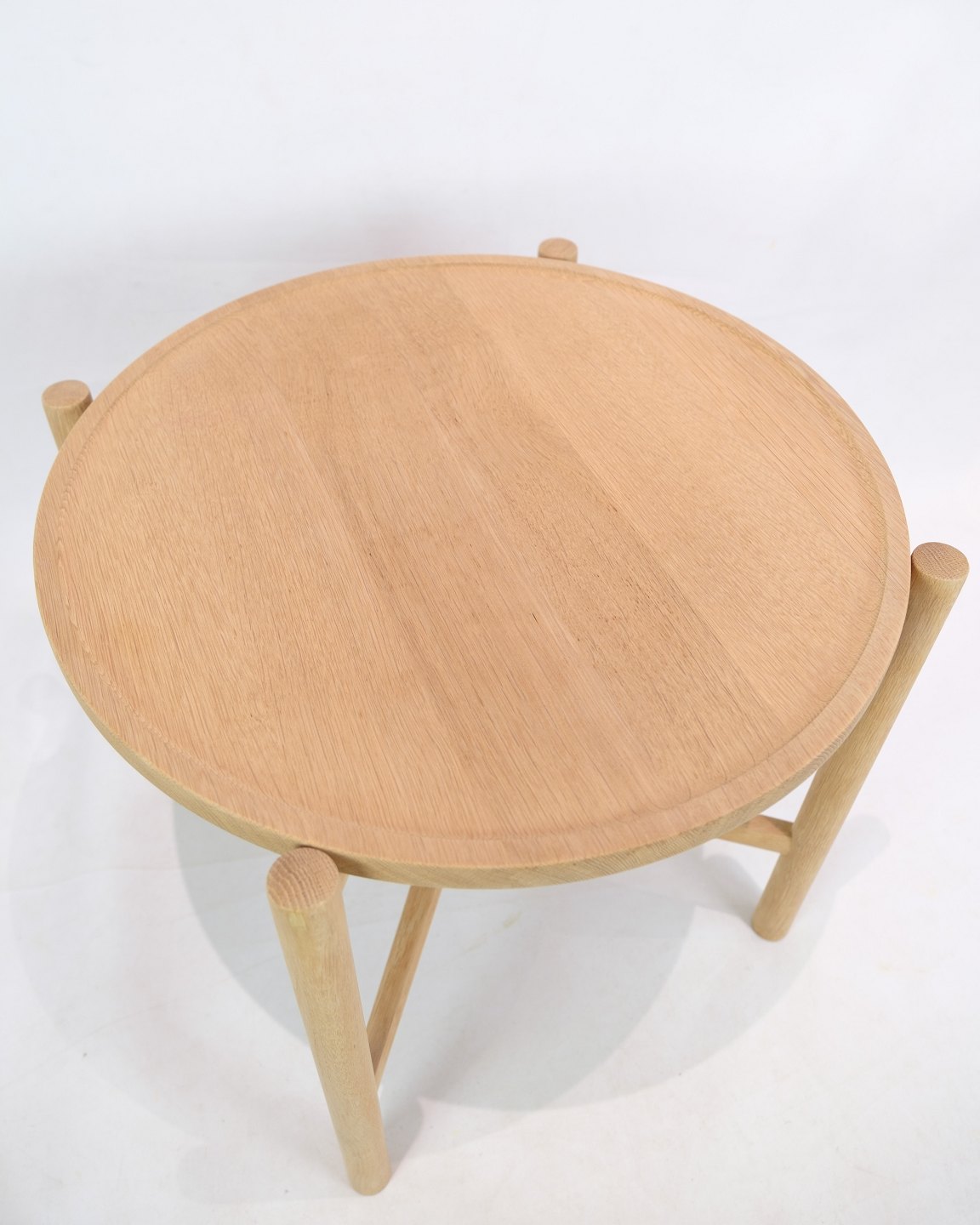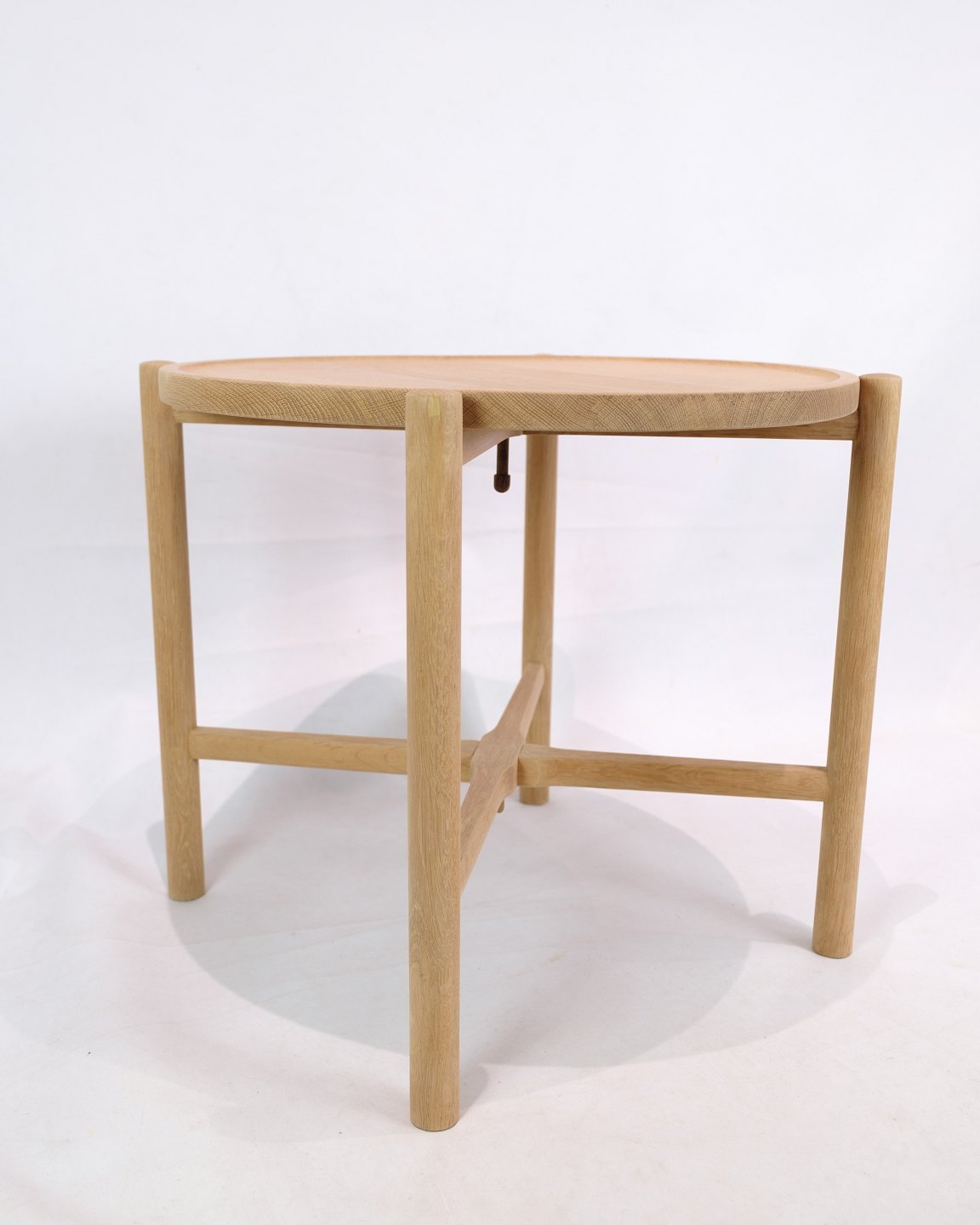 SolgtDette bakkebord eller sidebord, designet af den berømte danske møbelarkitekt Hans J. Wegner og kendt som PP35/62, er et mesterværk af enkelhed og funktionalitet. Fremstillet af sæbebehandlet egetræ, udstråler dette bord en naturlig skønhed og varme, der er karakteristisk for Wegners design.