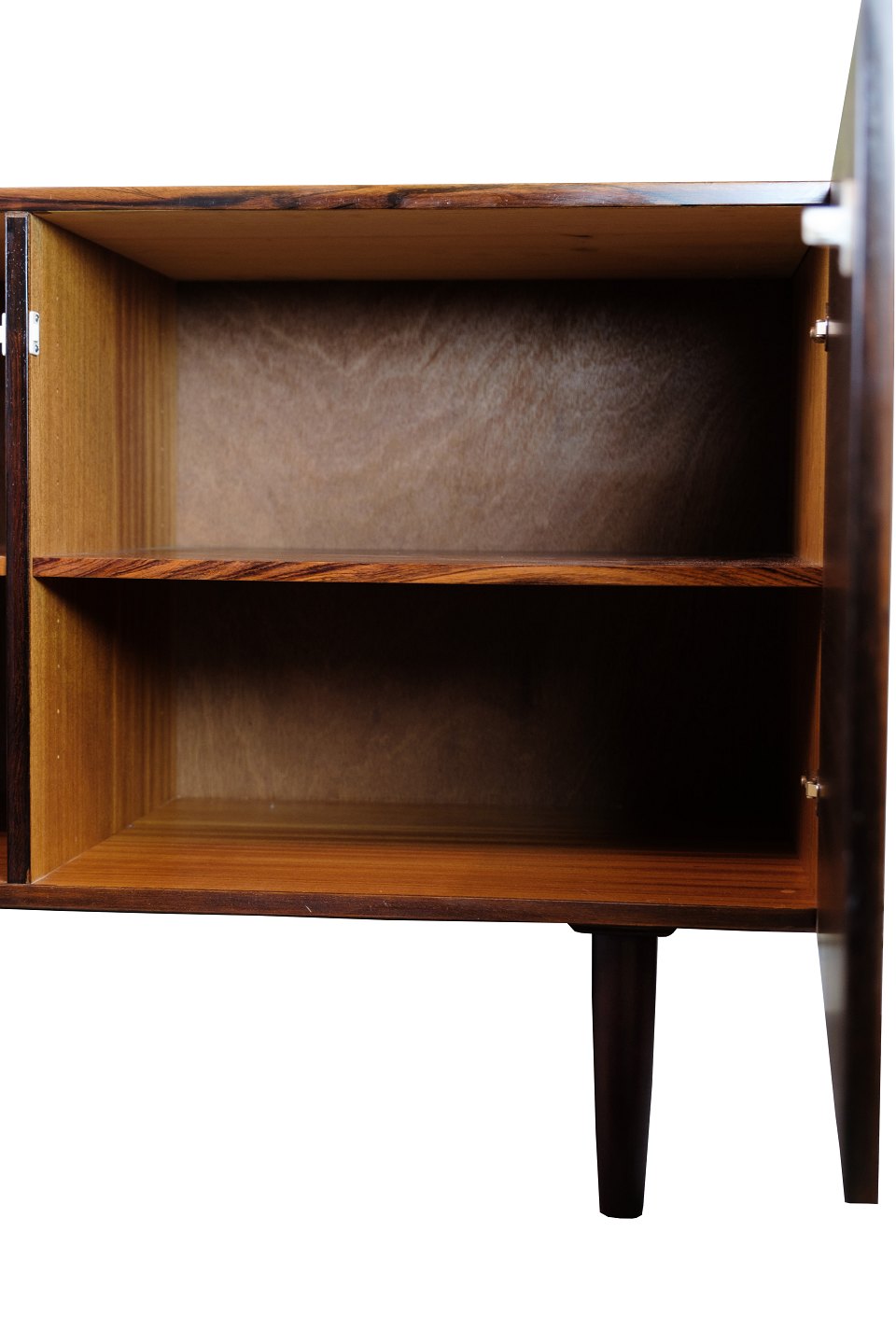 Denne skænk i palisander repræsenterer den tidløse elegance og funktionalitet, der kendetegner dansk design fra 1960'erne. Med sine to låger og hyldemuligheder indeni tilbyder skænken både stil og praktisk opbevaringsplads.