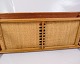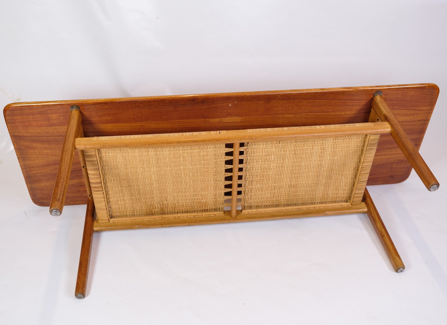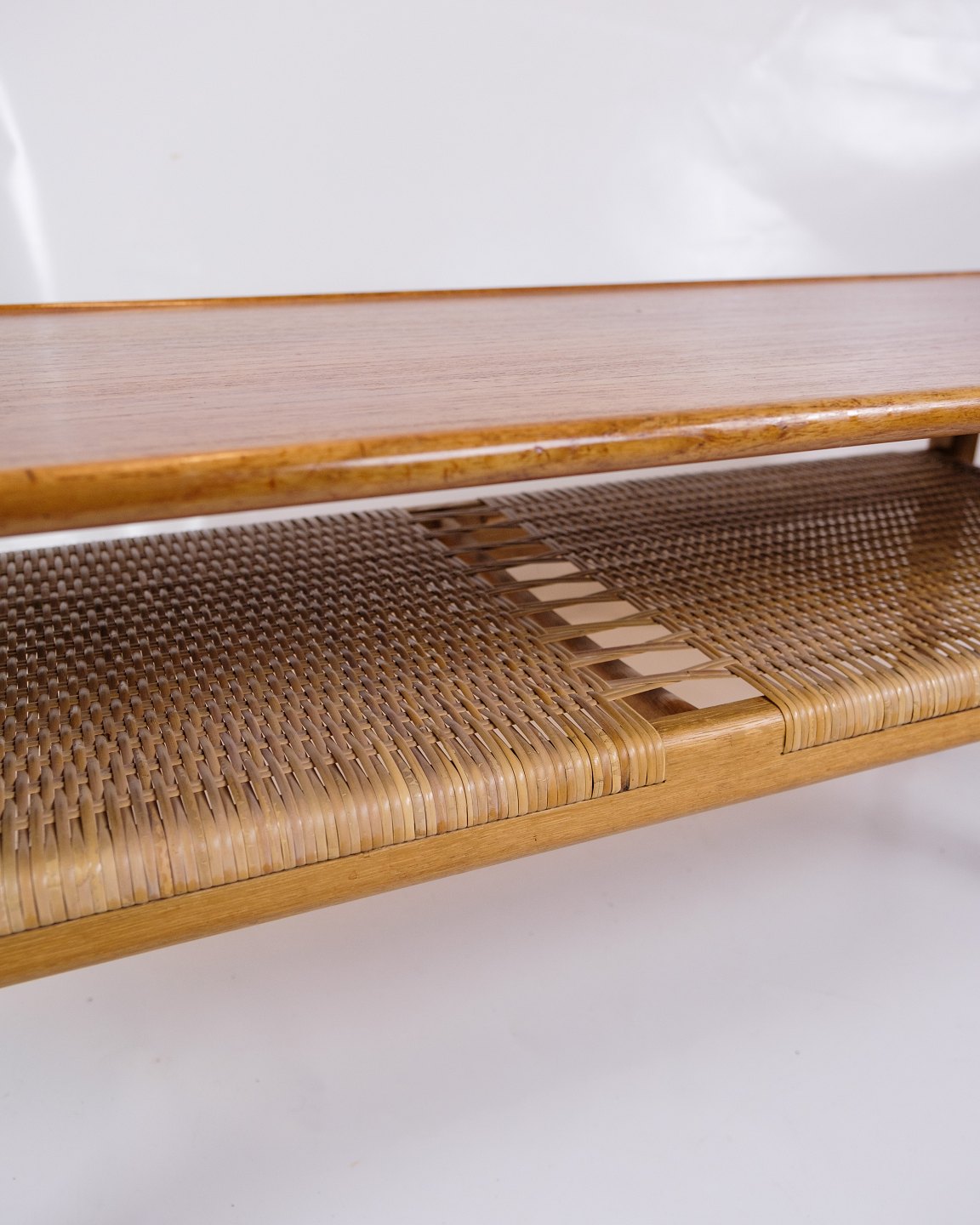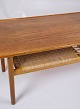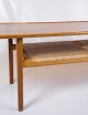 Dette sofabord, model AT-10, designet af Hans J. Wegner og fremstillet af Andreas Tuck i 1960'erne, er et fremragende eksempel på dansk mid-century modern design. Bordet kombinerer teak og eg med en hylde af flet, hvilket skaber en smuk og funktionel møbel, der afspejler Wegners sans for detaljer og håndværk.