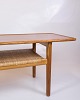 Under bordpladen er der en praktisk hylde af flet, som tilføjer både funktionalitet og visuel lethed til designet. Fletværket skaber en luftig og elegant opbevaringsløsning, perfekt til magasiner, bøger eller andre genstande, som man ønsker at have inden for rækkevidde, men alligevel holde organiseret og ude af vejen.