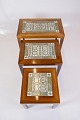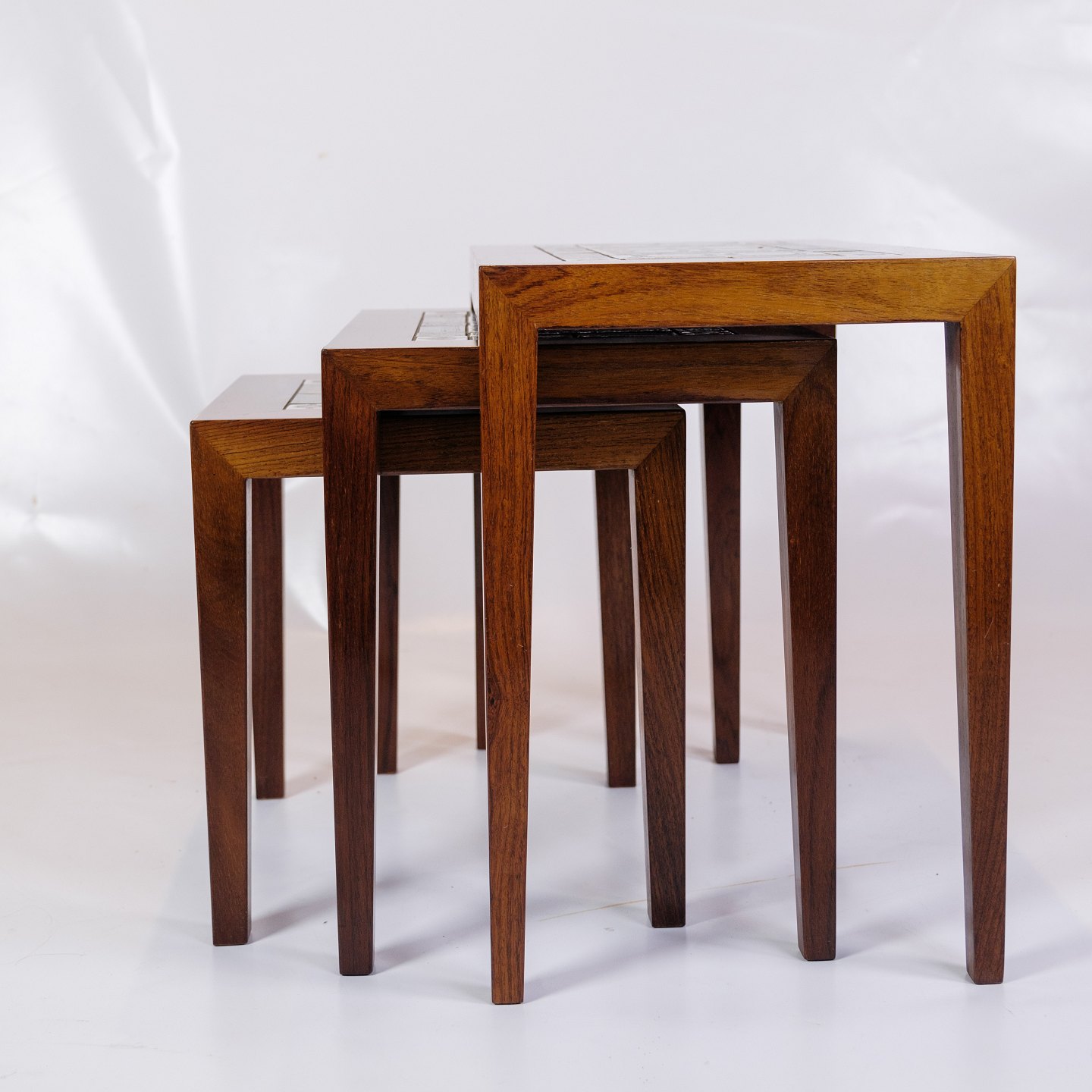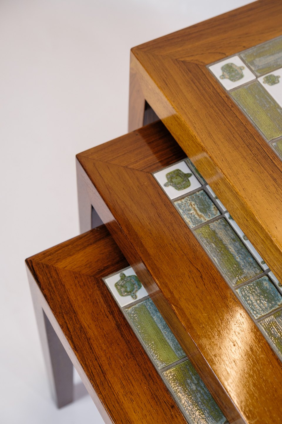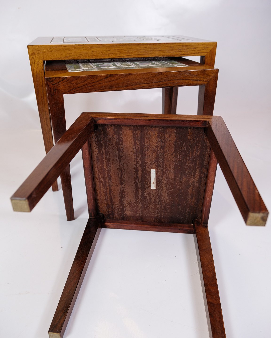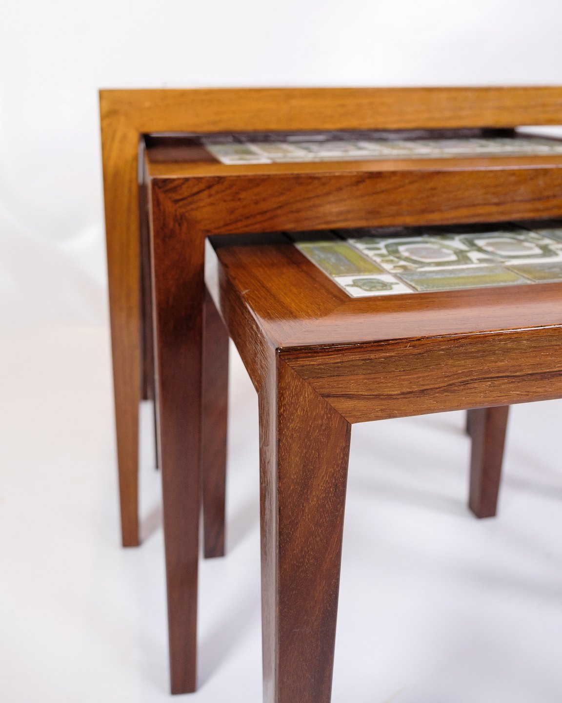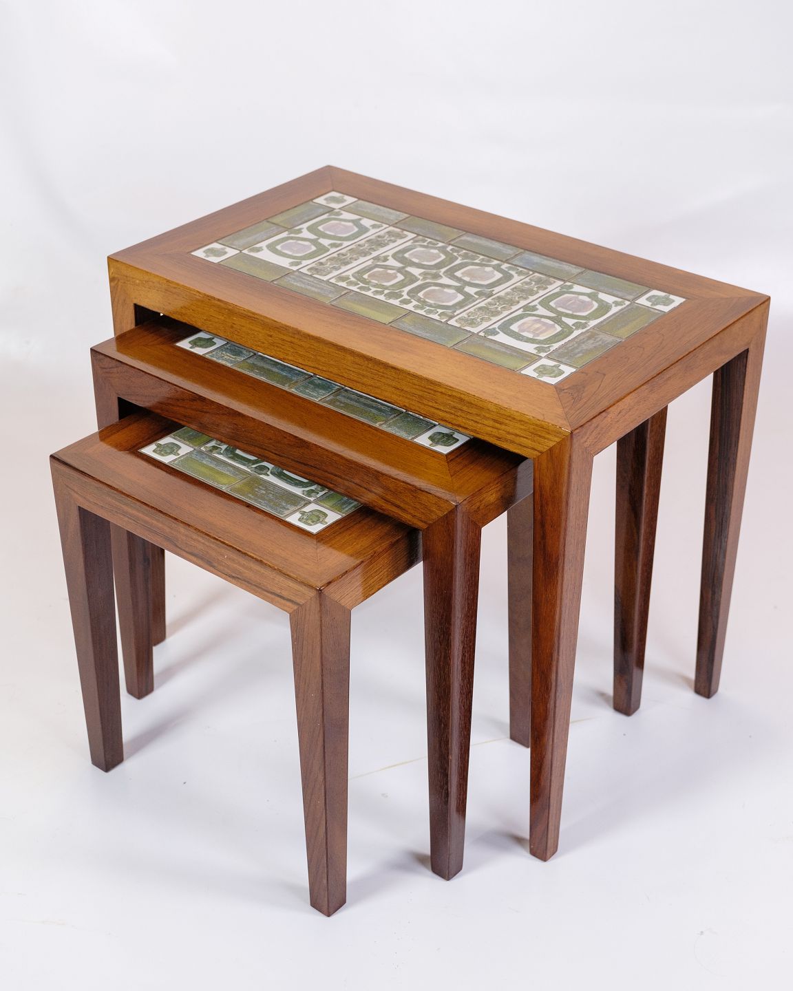 SolgtDette sæt af indskudsborde, designet af Severin Hansen i 1960'erne, er et fremragende eksempel på dansk mid-century modern design. Bordene er fremstillet af smukt palisandertræ og udsmykket med Royal Copenhagen fliser, hvilket skaber en elegant kombination af naturlige materialer og kunstnerisk udsmykning.