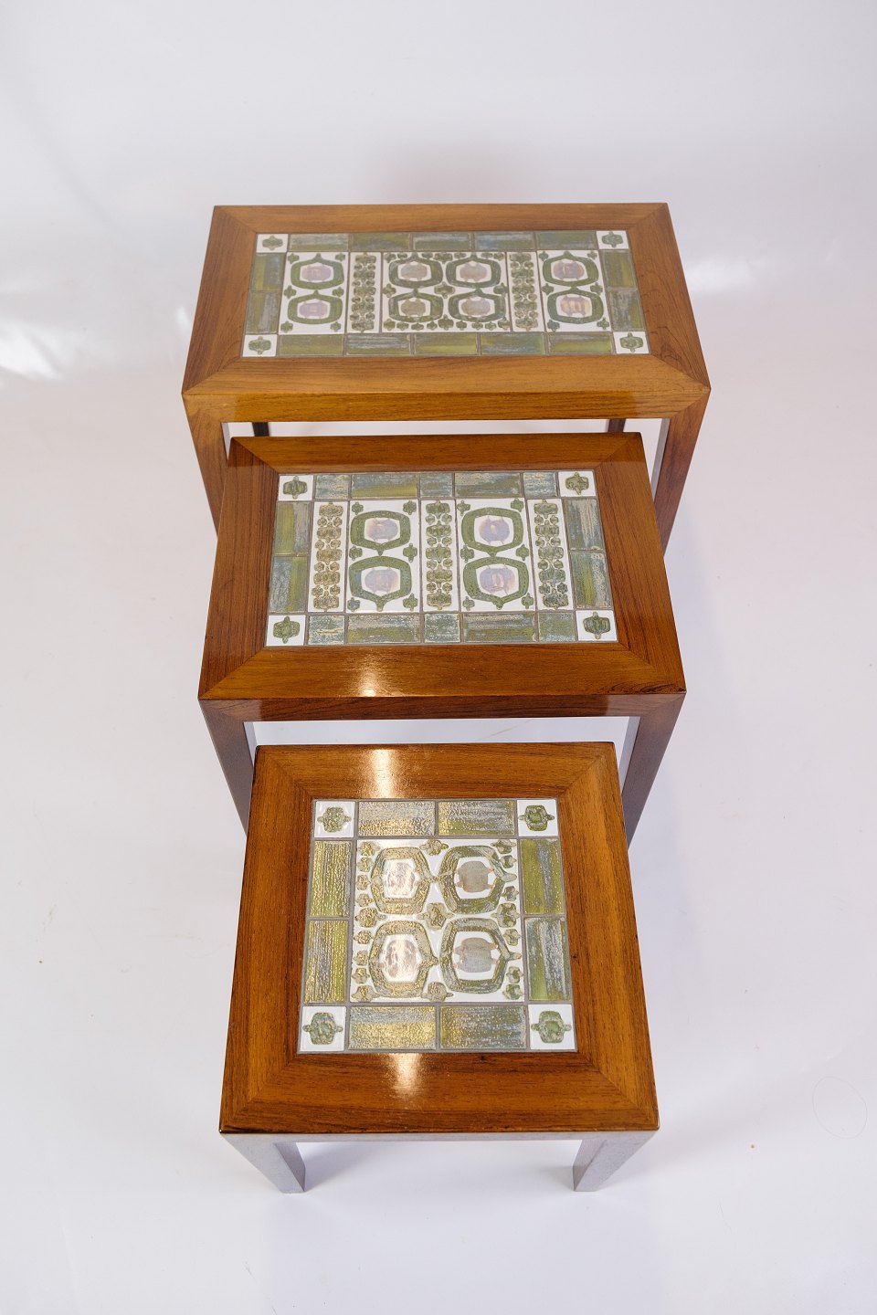 Royal Copenhagen fliserne tilføjer en ekstra dimension af raffinement og kunstnerisk værdi til bordene. Fliserne er kendt for deres fine porcelæn og detaljerede, håndmalede dekorationer. Kombinationen af palisander og de dekorative fliser skaber en harmonisk balance mellem funktionalitet og æstetik.