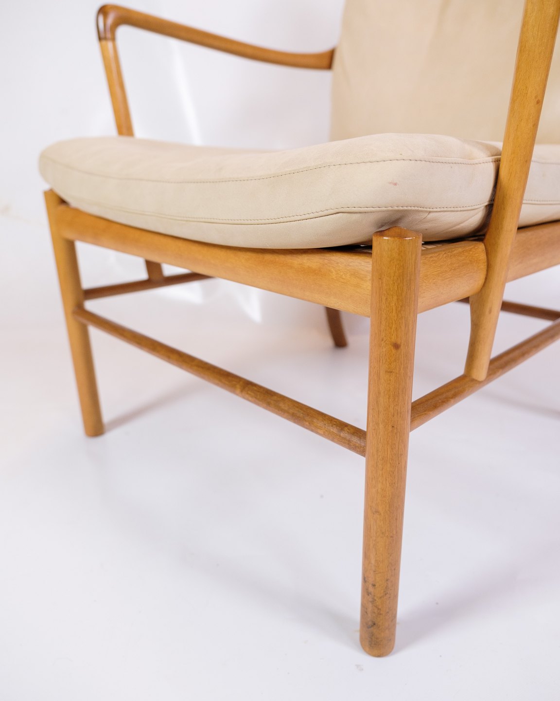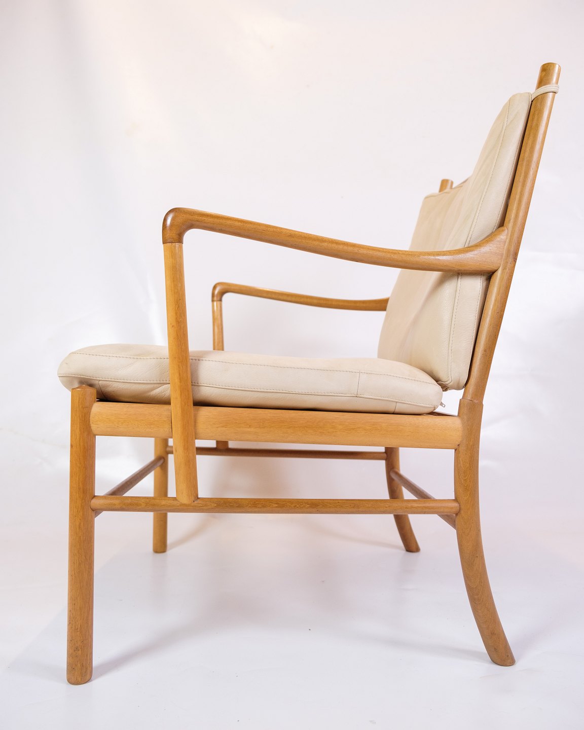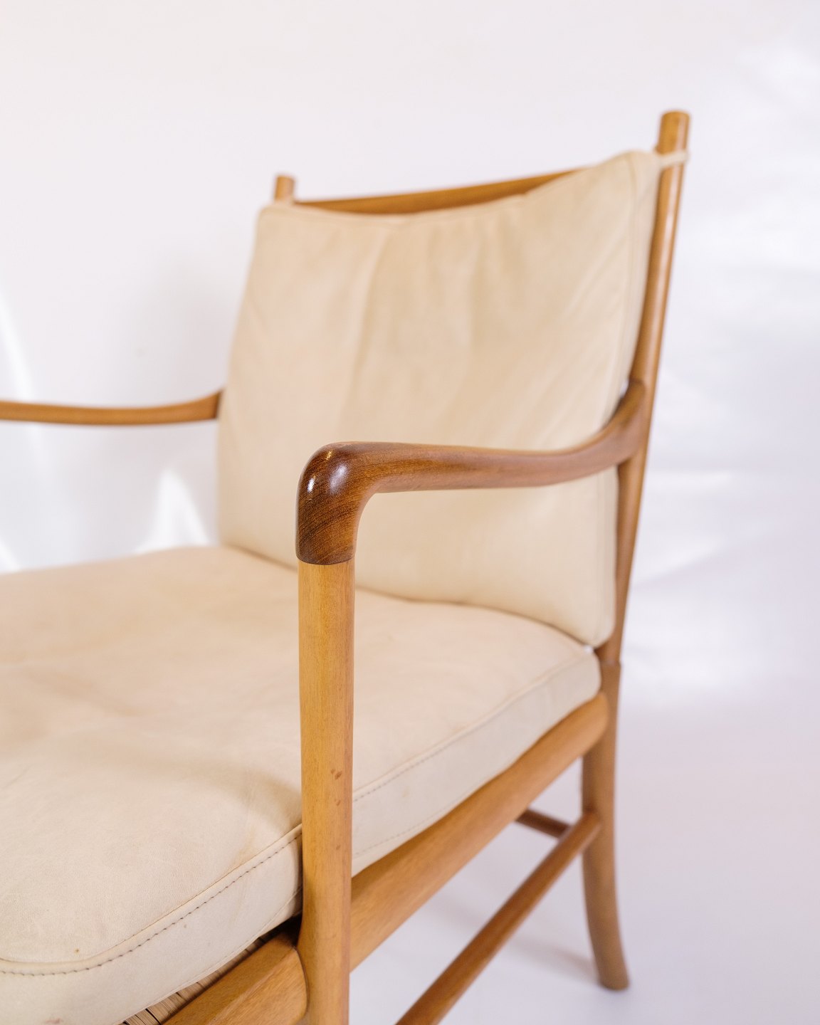 Dette sæt af to Colonial lænestole med skammel, model OW 149, designet af Ole Wanscher og fremstillet af P. Jeppesen Møbelfabrik i 1960'erne, er et fremragende eksempel på dansk design fra midten af det 20. århundrede. Stolene og skamlerne er fremstillet af lys mahogni og betrukket med lyst læder, hvilket giver dem et elegant og tidløst udseende.