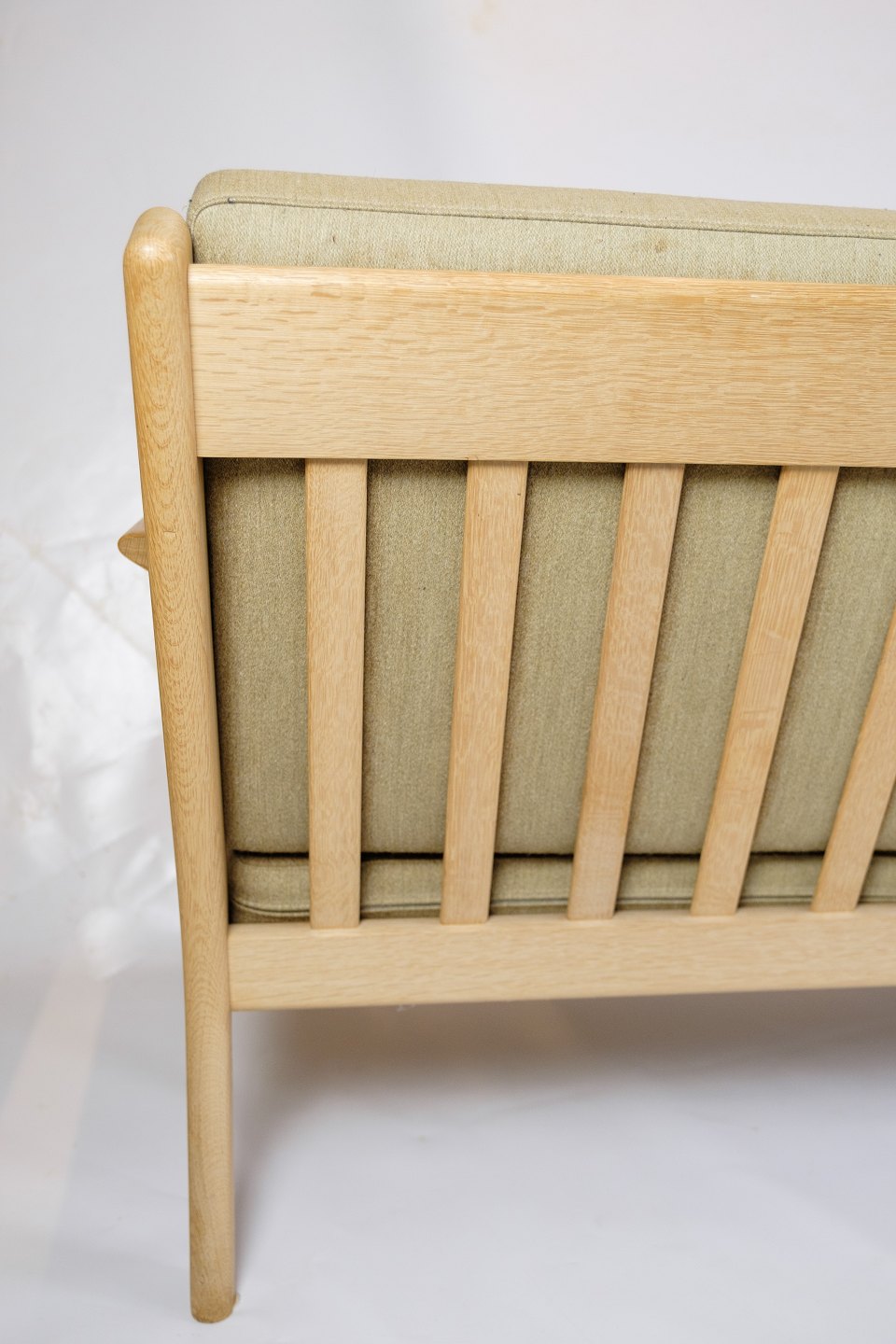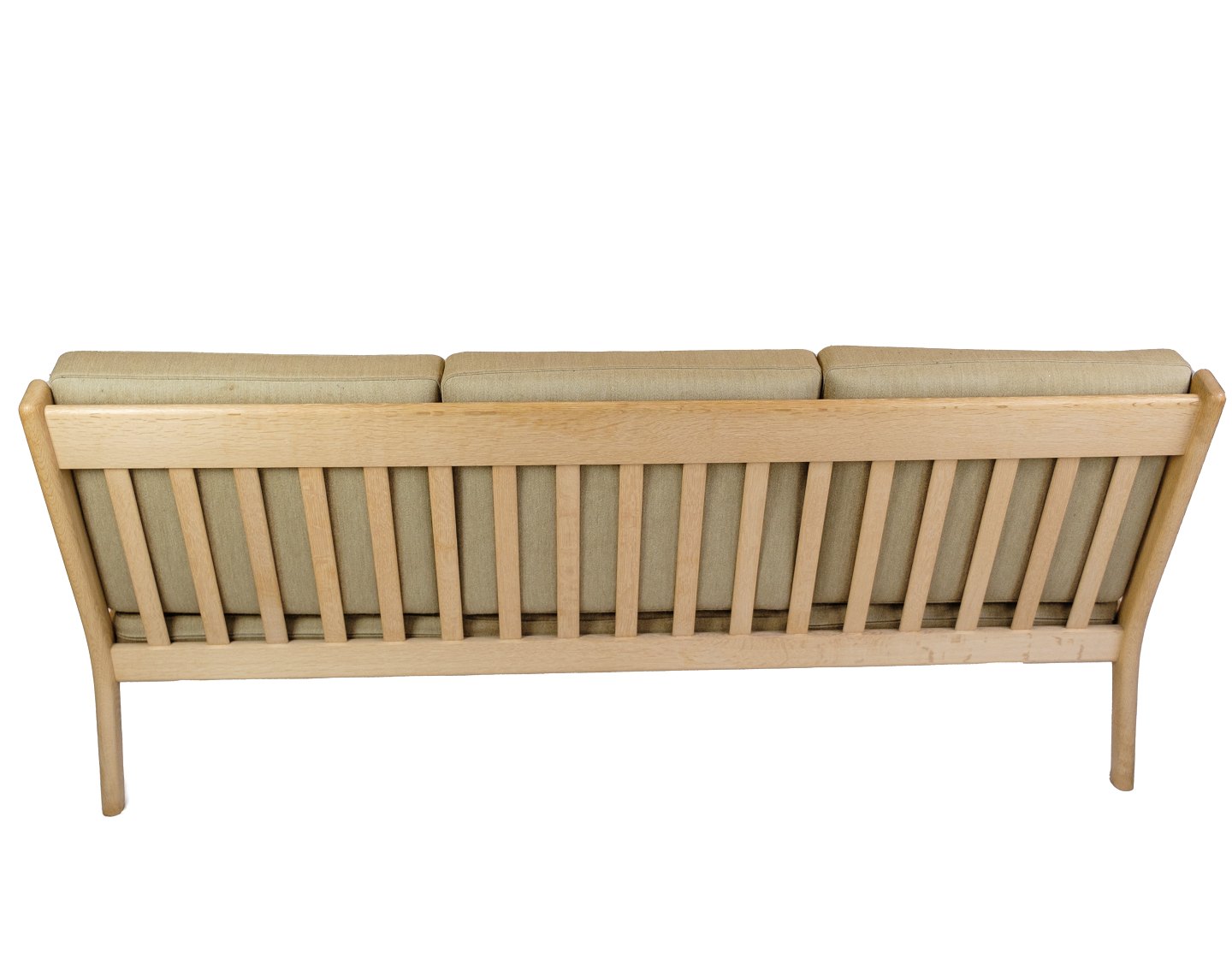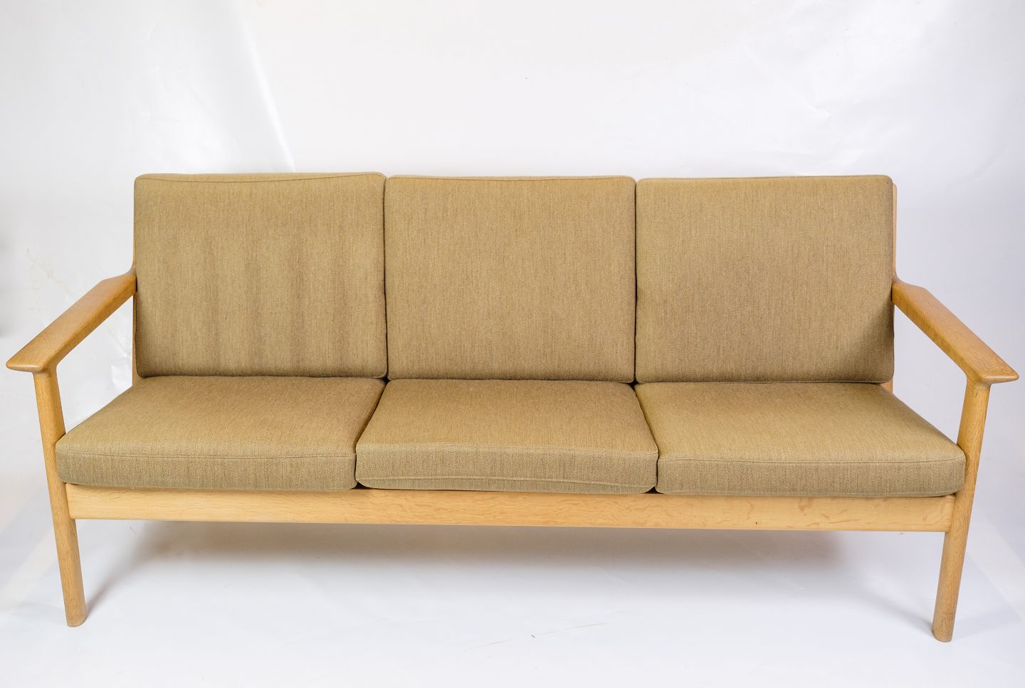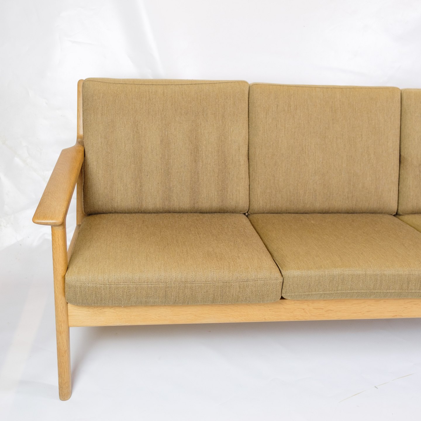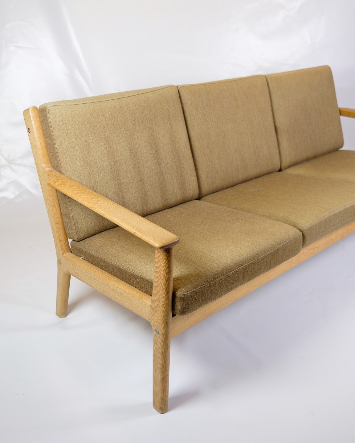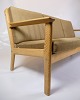 Sofaens ramme er lavet af solid egetræ, kendt for sin styrke og elegante åretegninger. Egetræet tilføjer en varm og naturlig æstetik til sofaen, som er typisk for Wegners designfilosofi, der fokuserer på at fremhæve materialernes naturlige skønhed. Træets fine finish beskytter det og fremhæver dets rige farvetoner.