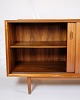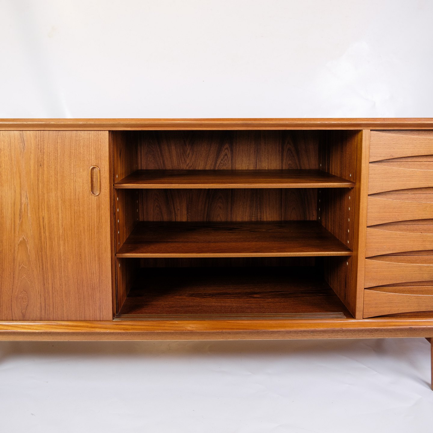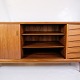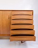 Skænkens hovedmateriale er teak, kendt for sin holdbarhed og rige, varme tone. Teaktræets naturlige åretegninger og farver fremhæves af en glat finish, der både beskytter træet og fremhæver dets æstetiske kvaliteter. Teak var et populært materiale i mid-century design på grund af dets styrke og skønhed, hvilket sikrer, at møblet kan modstå daglig brug samtidig med at det bevarer sin elegance.