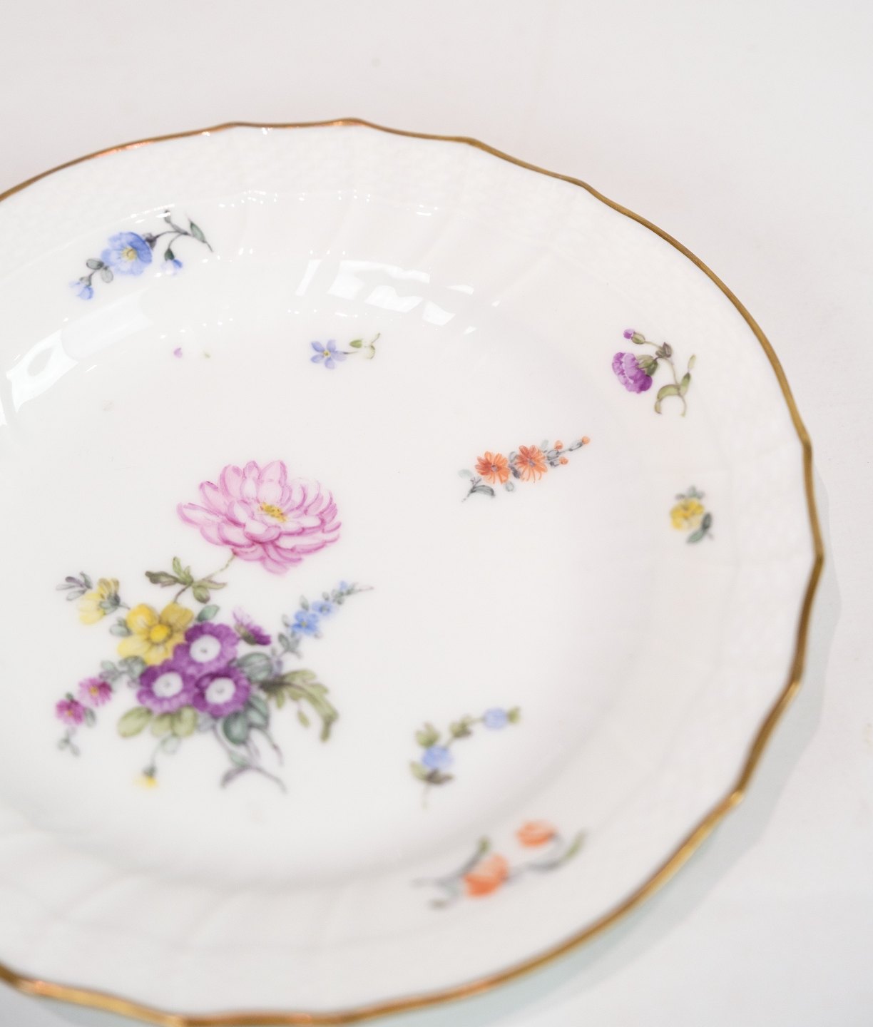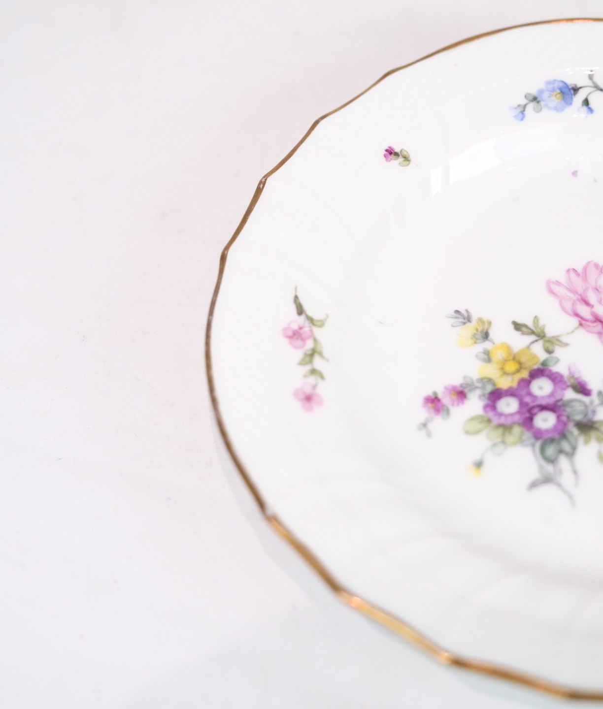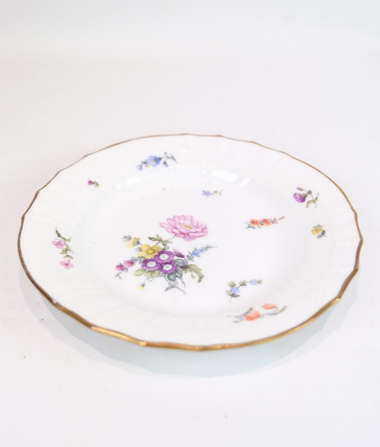 Lunch Plates of Royal porcelain with patterned Saxon flower decorated on the edge with gold. Manufactured by Royal Copenhagen in approx. 1923, where all their goods have been hand painted and subsequently become very rare. All lunch plates are without flaws or defects.