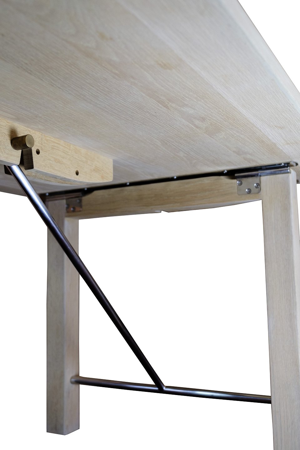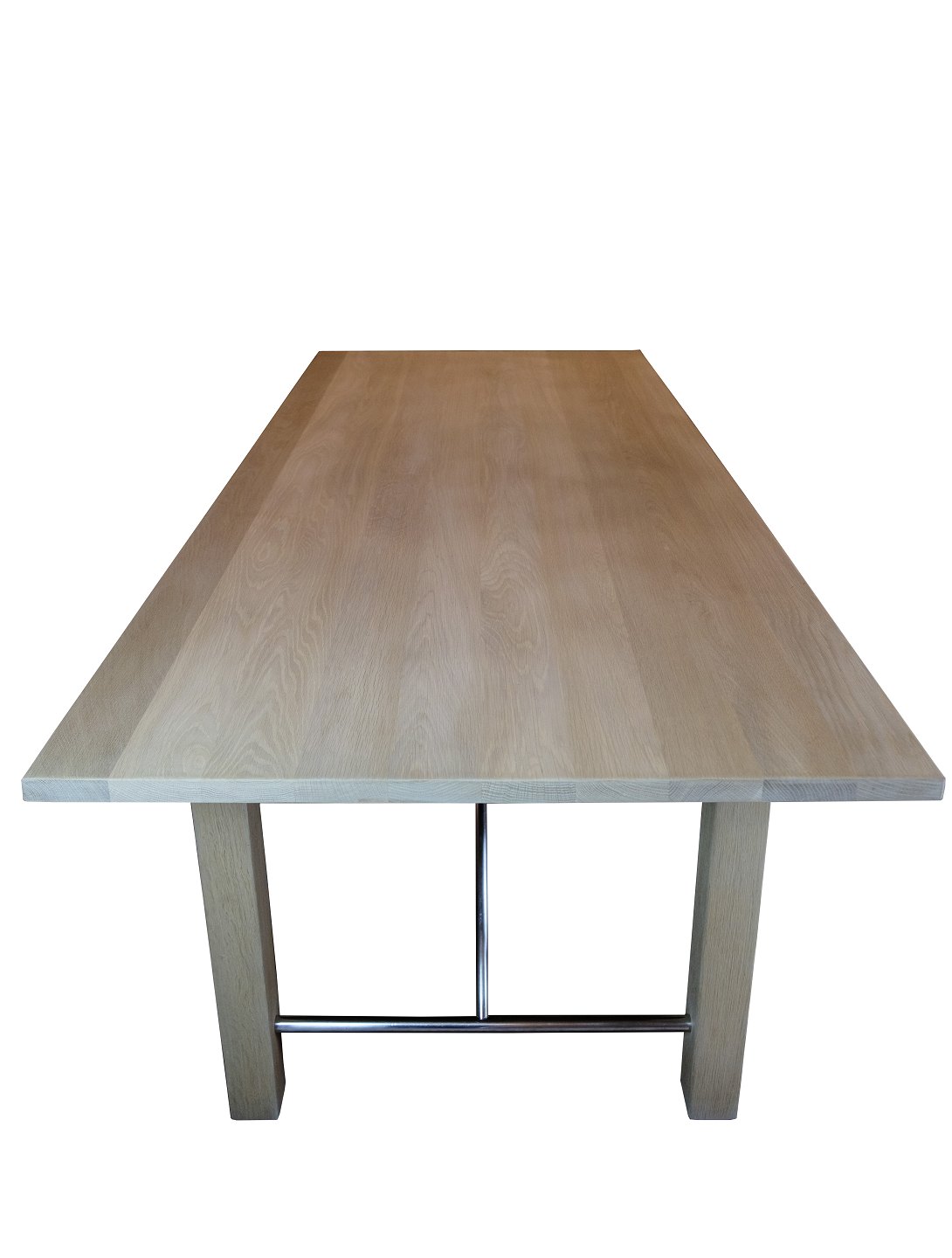 Spisebord af Massiv egetræ tegnet af Hans Thyge Raunkjær fremstillet af Trip trap med skråstiver af forkromet metal. Bordet er blevet efterset på vores værksted og står i meget flot stand. Næsten som nyt.