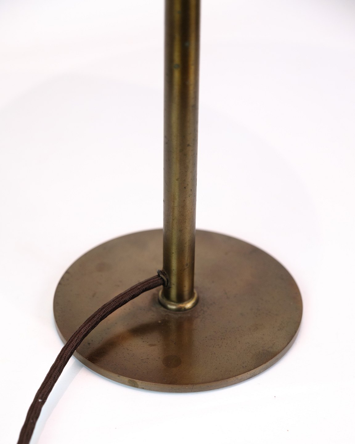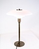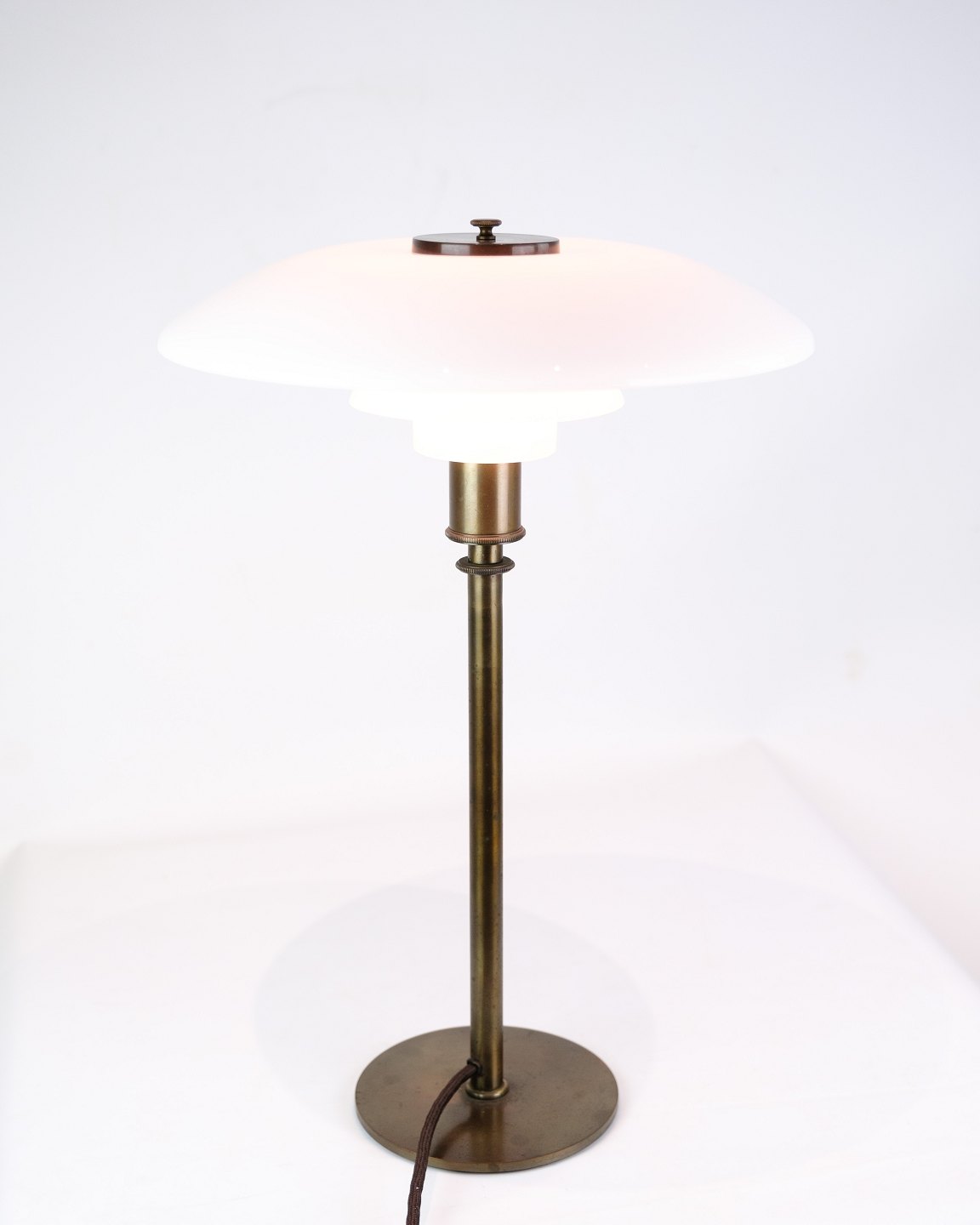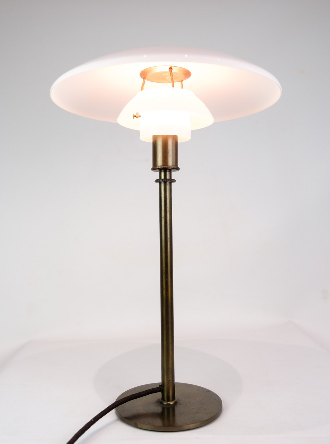 Poul Henningsen bordlampe, model PH 3½/2, fra omkring 1950'erne. Lampen er udført i bruneret messing med hvide opalglasskærme, der giver et blødt og behageligt lys. Den er udstyret med en sort stofledning, som tilføjer et klassisk touch.
