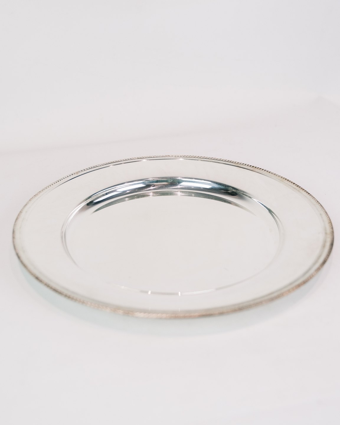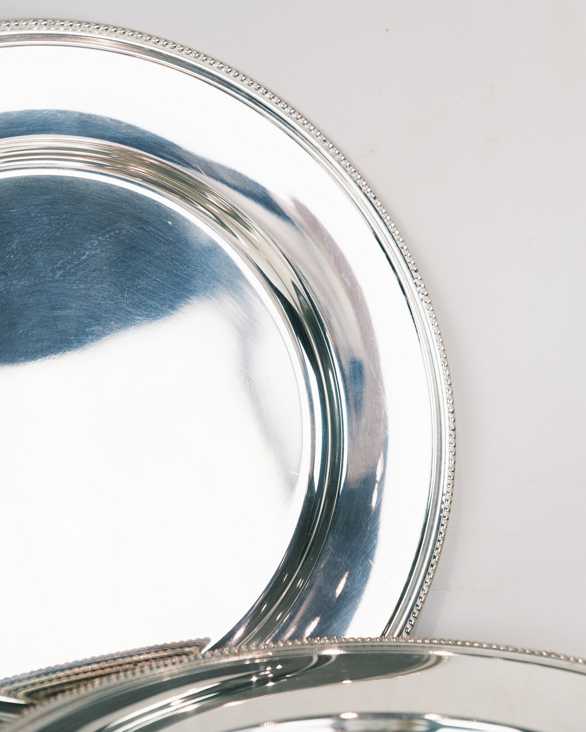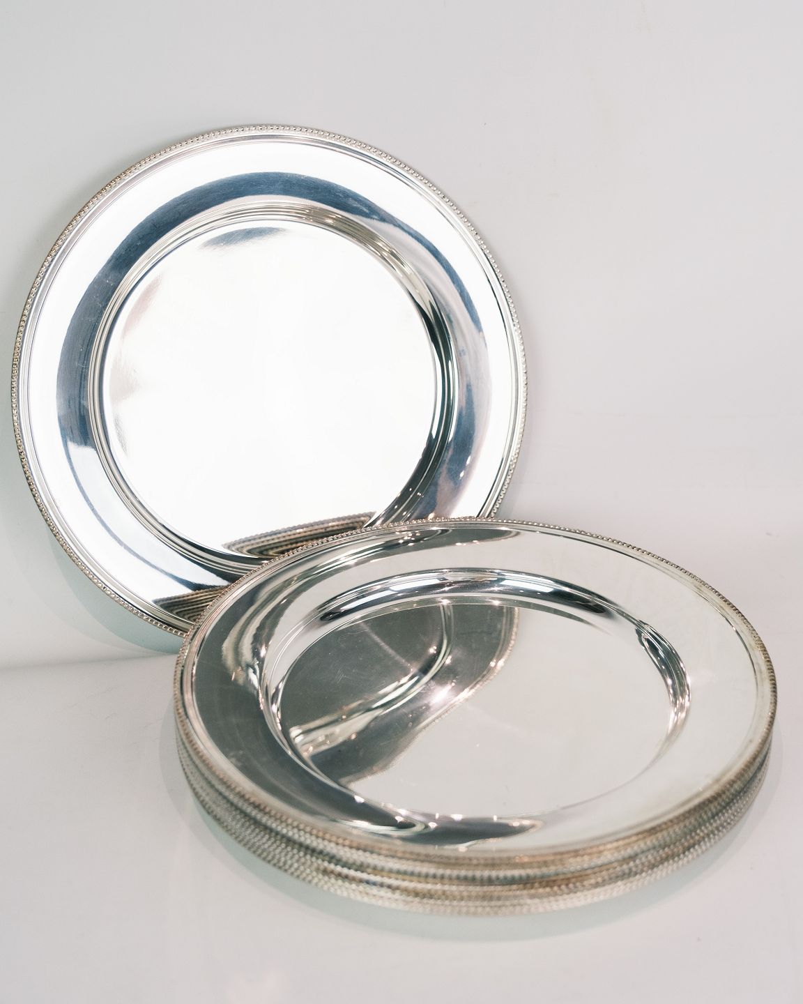 Sæt af 12 dæk tallerkner i sølvplet med perlekant. Enkel og klassisk design, der passer til enhver borddækning.