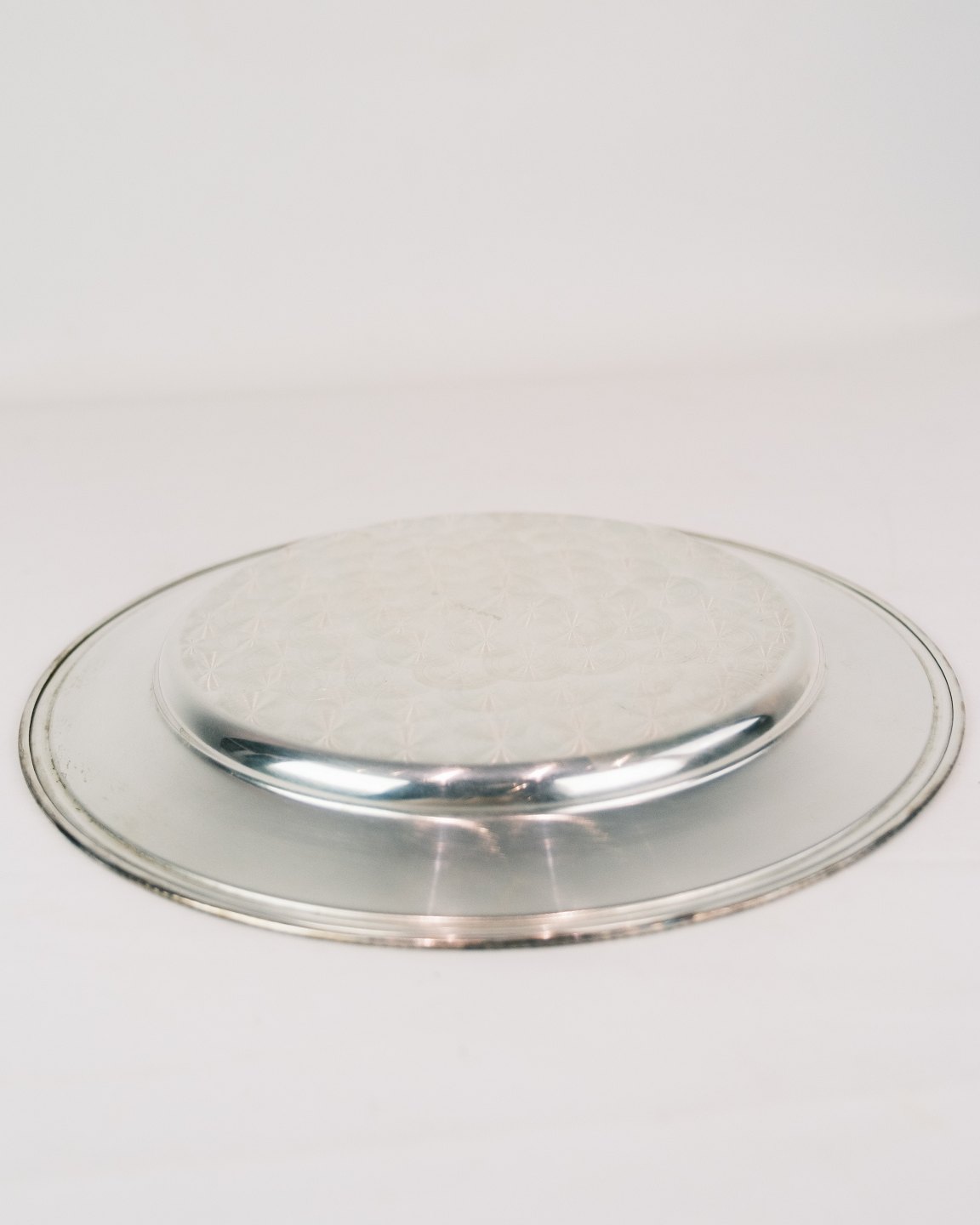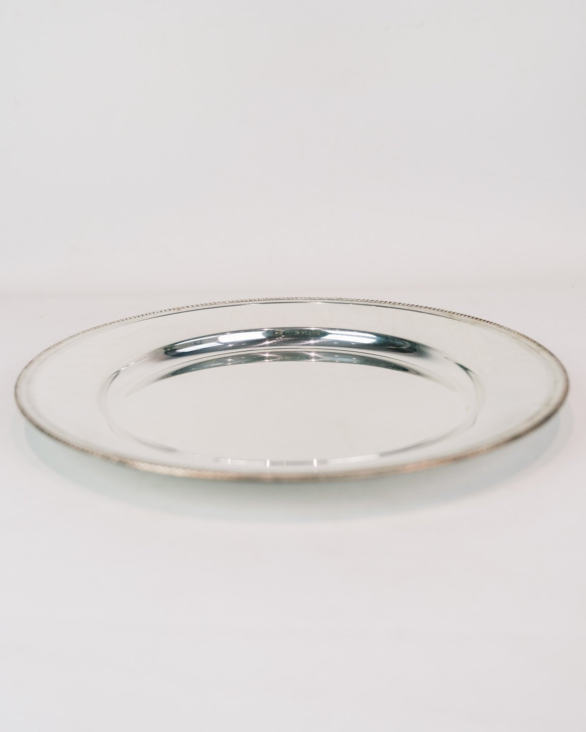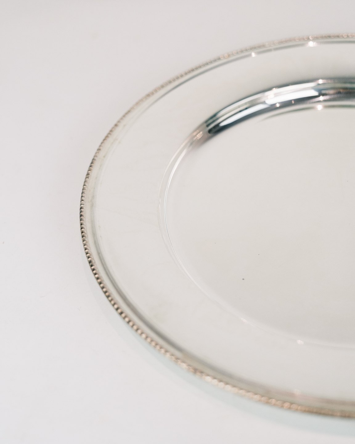 Sæt af 12 dæk tallerkner i sølvplet med perlekant. Enkel og klassisk design, der passer til enhver borddækning.