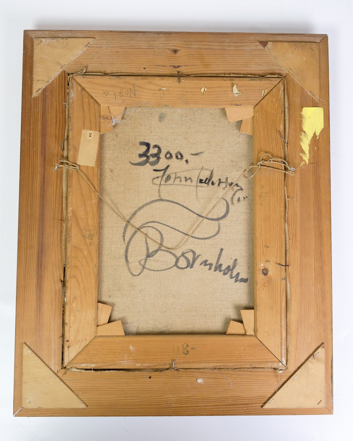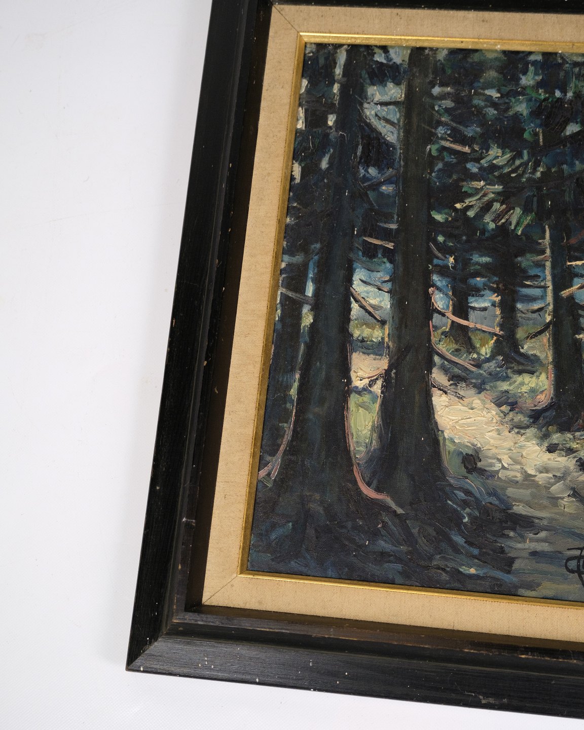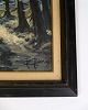 SolgtOliemaleri indrammet i en sort og forgyldt træramme med motiv af skovlandskab signeret af John Pedersen "Bornholm"