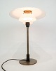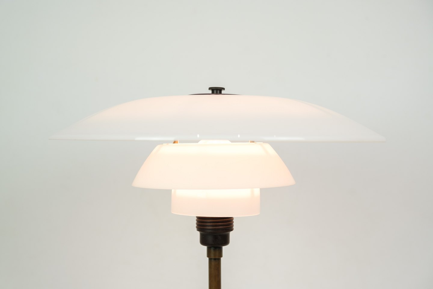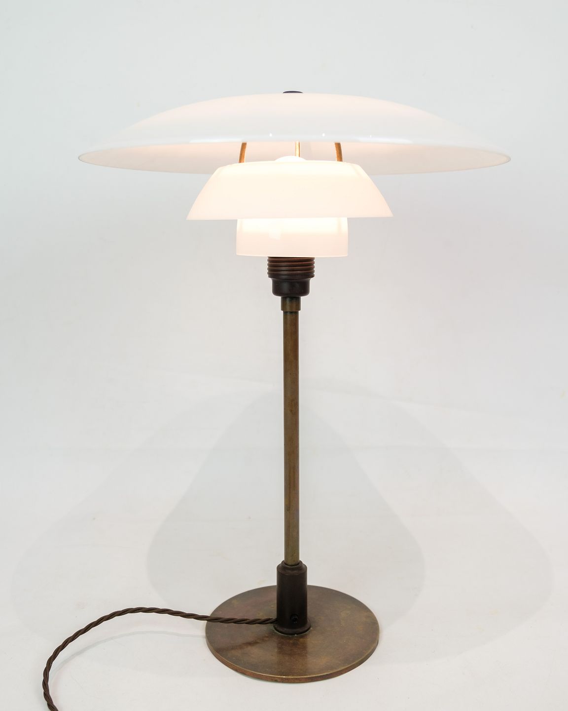 Kontakt os vedrørende prisBordlampe, PH 4/2½, designet af Poul Henningsen og fremstillet af Louis Poulsen i 1930'erne. Lampen er udført med hvide opal glasskærme og et stel af bruneret messing, som giver en klassisk kombination af funktion og elegance. PH-lamperne er kendt for deres unikke design, hvor skærmene er skabt til at sprede lyset jævnt og blødt.