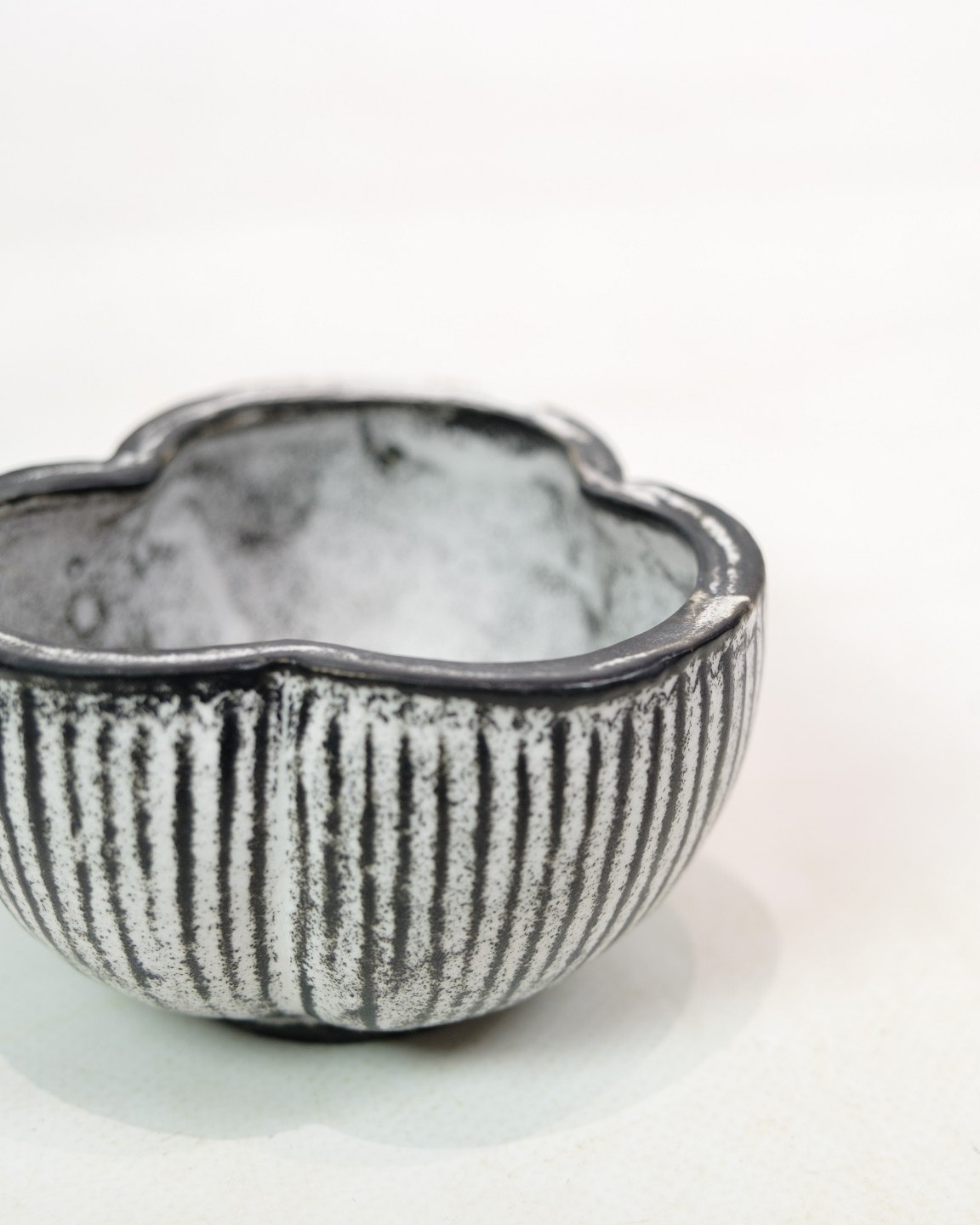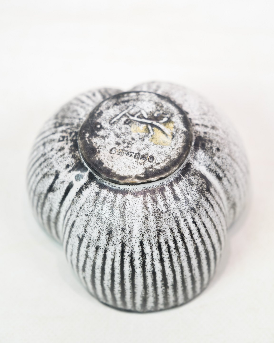 SolgtSkål med grå/sort dobbeltglasur, designet af Svend Hammershøj og fremstillet af Kähler i 1940'erne. Hammershøj var en kendt dansk keramiker, der arbejdede med Kähler fra starten af 1900-tallet og var kendt for sine eksperimenter med forskellige glasurer, herunder den dobbeltglasur, som blev et kendetegn i hans designs.