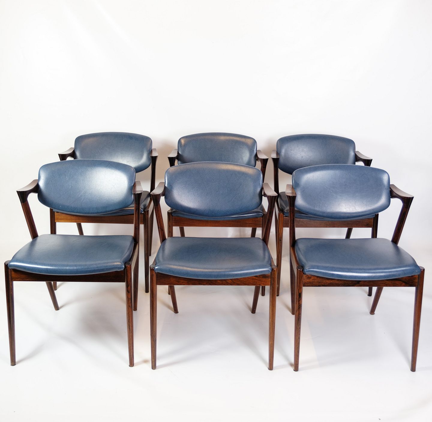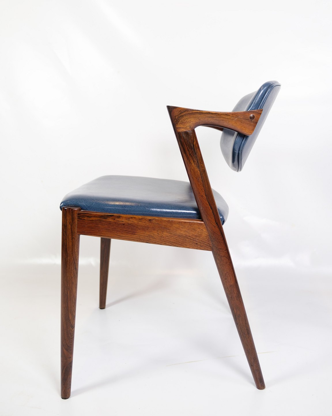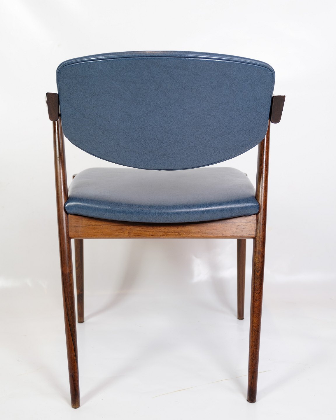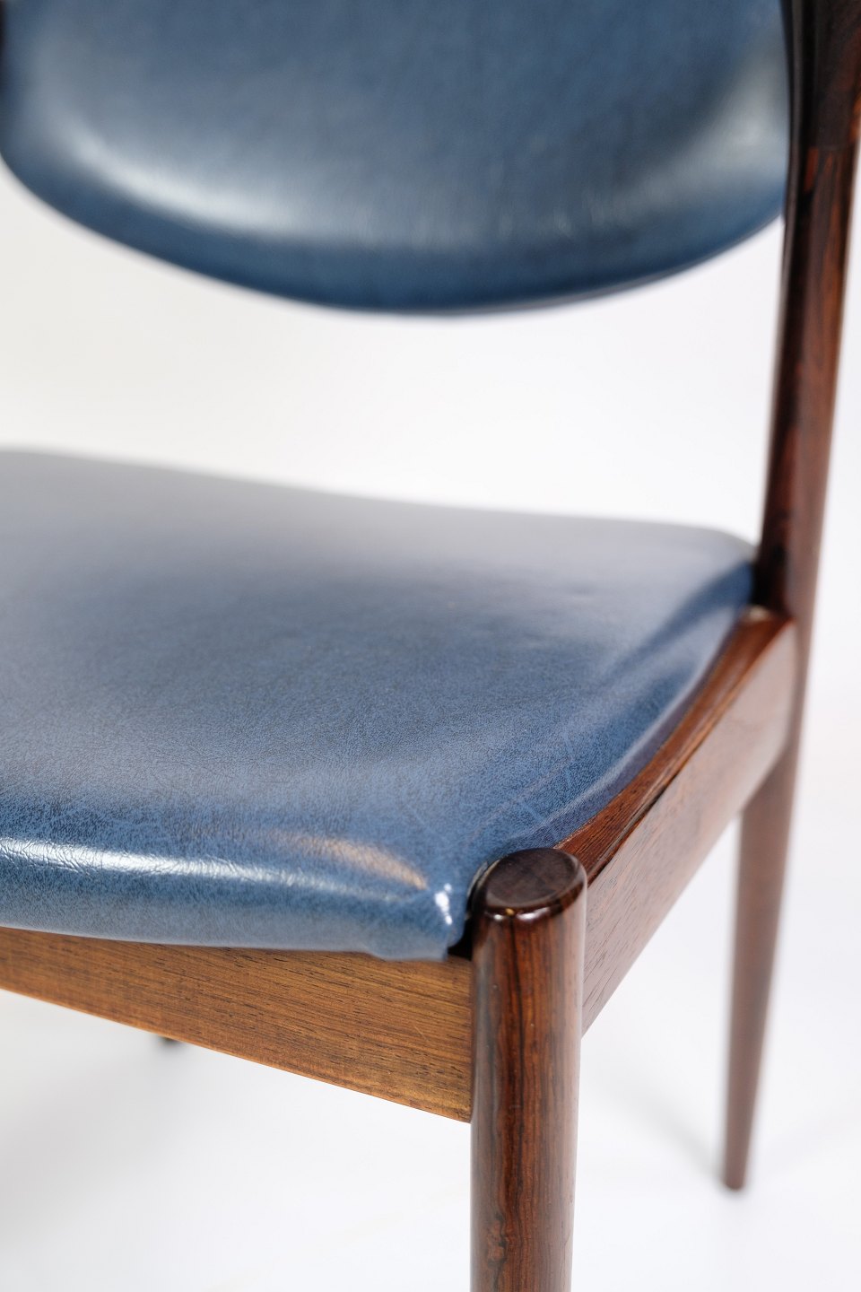 SolgtSæt af 6 spisebordsstole i palisander med blå læderpolstring, designet af Kai Kristiansen. Stolene har en ramme i palisander, som viser de flotte åretegninger i træet, og de er polstret med blå læder, som både er behageligt og slidstærkt.