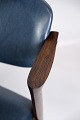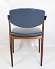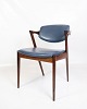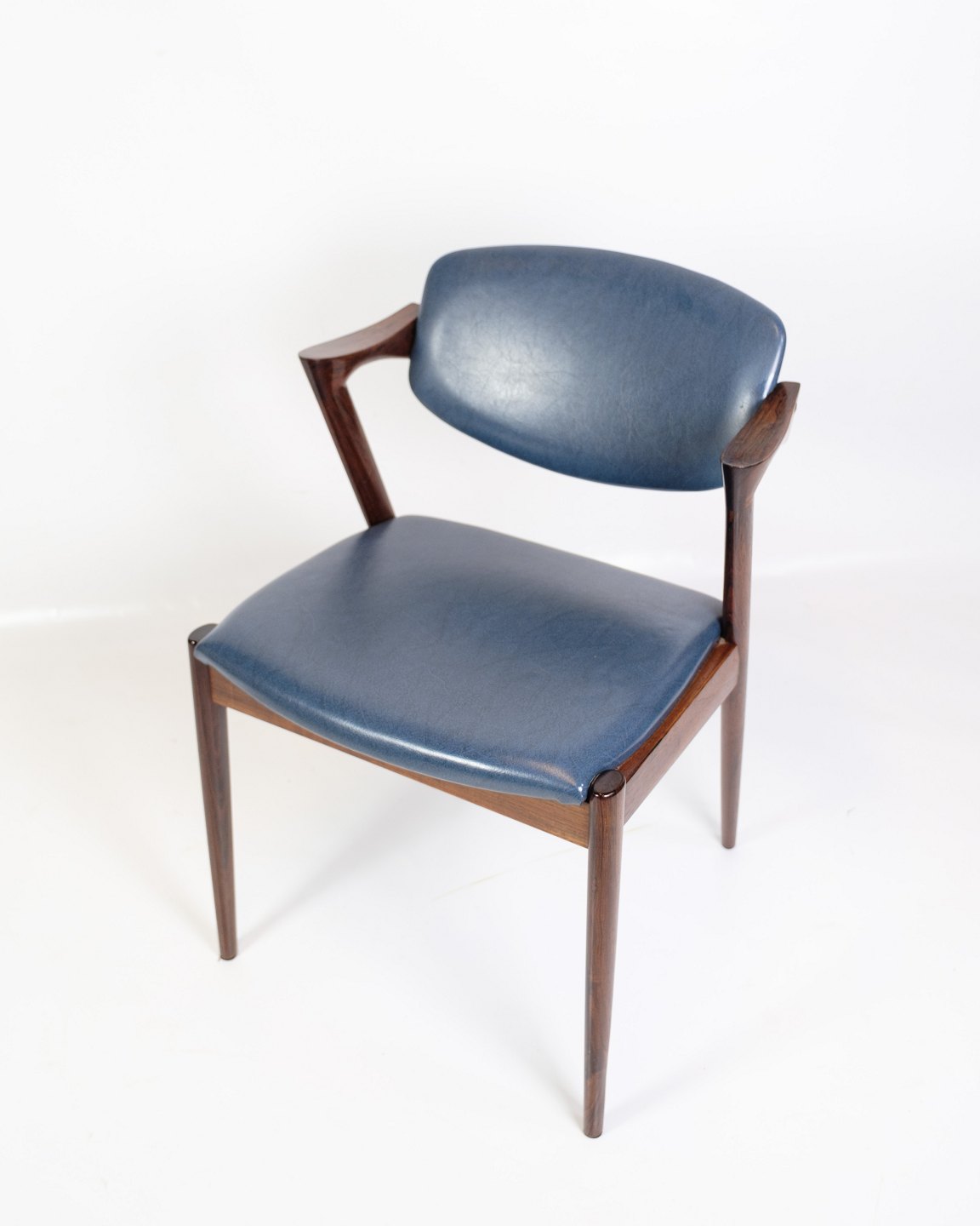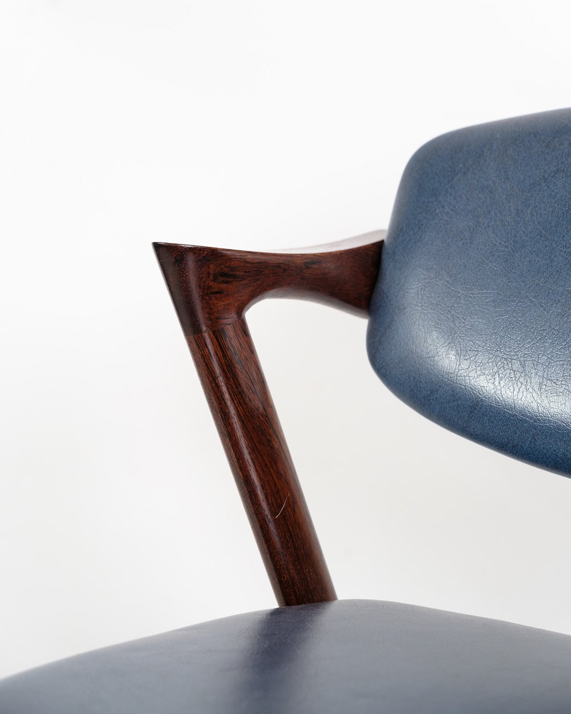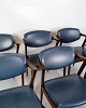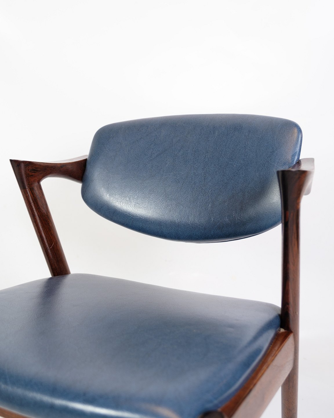 SolgtSæt af 6 spisebordsstole i palisander med blå læderpolstring, designet af Kai Kristiansen. Stolene har en ramme i palisander, som viser de flotte åretegninger i træet, og de er polstret med blå læder, som både er behageligt og slidstærkt.
