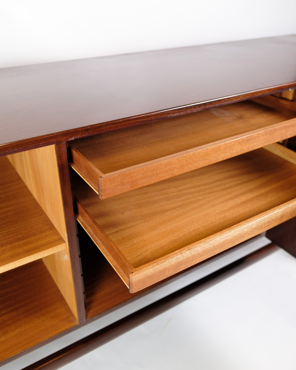 Skænk i mahogni, designet af Ole Wanscher og fremstillet af P. Jeppesen i 1960'erne. Skænken har tre låger på fronten, som åbner op til rummelige opbevaringsrum med hylder på begge sider samt to skuffer i midten, ideelle til opbevaring af mindre genstande. De tappede samlinger og det smukke mahogni fremhæver kvaliteten og det solide håndværk, der er kendetegnende for Wanschers designs.