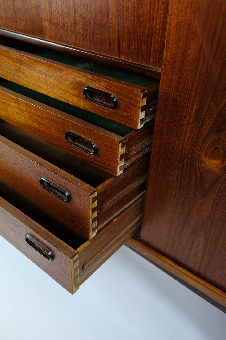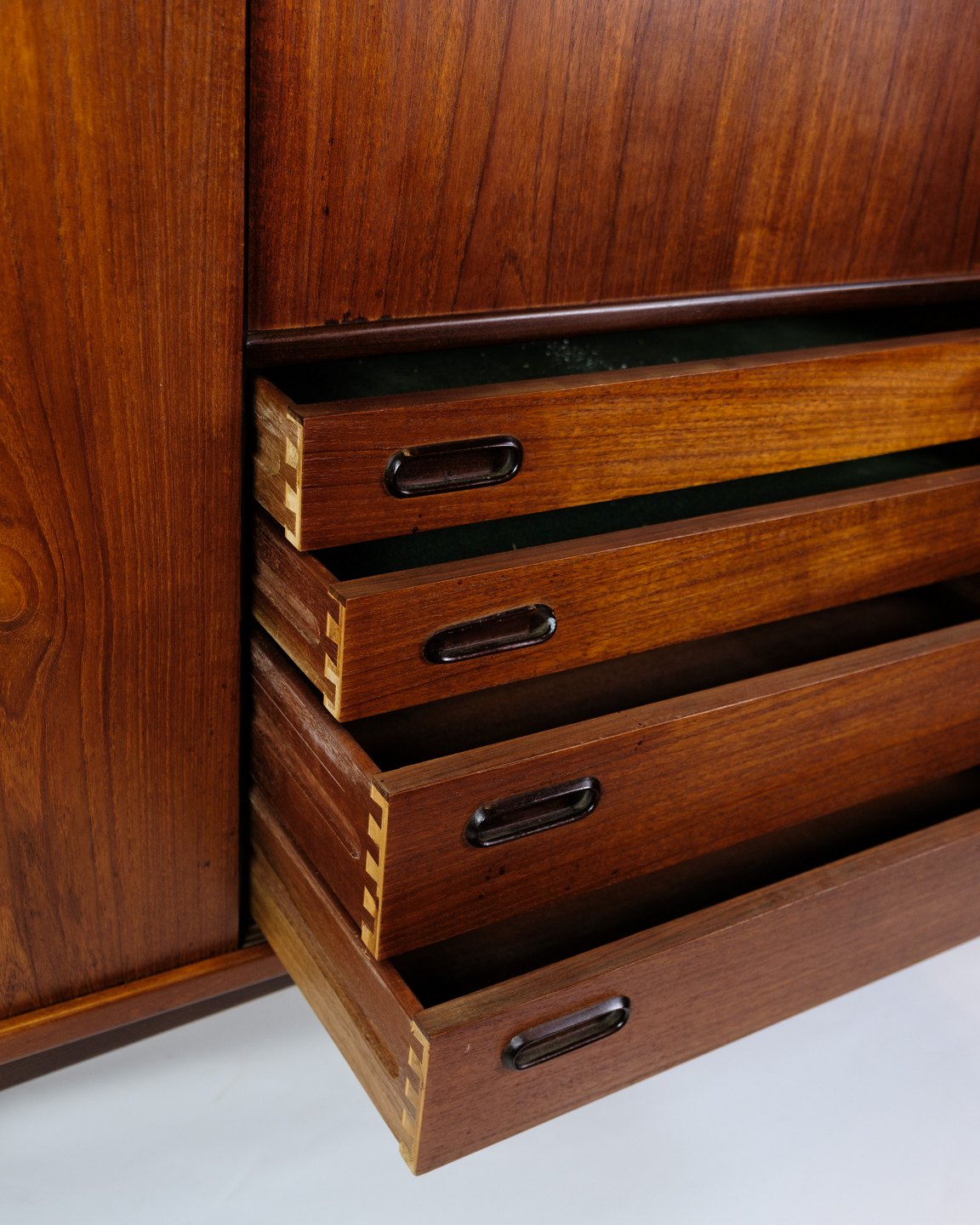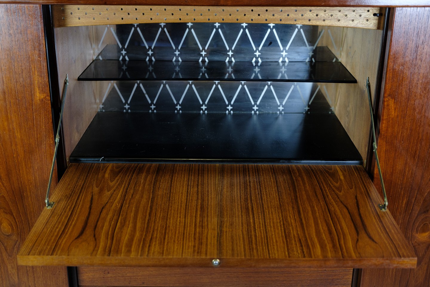 Super velholdt og flot skænk, designet af Harry Østergaard for Randers Møbelfabrik udformet i palisander træ i 1950'erne. Denne skænk er meget speciel grundet dens design og hvordan designet af benene på skænken er fremstillet til at stabilisere skænken. Skænken er meget funktionsdygtig med opbevaringsplads i begge sider med hylder og i midten fire skuffer med kvalitetsgreb og indvendig glashylde.