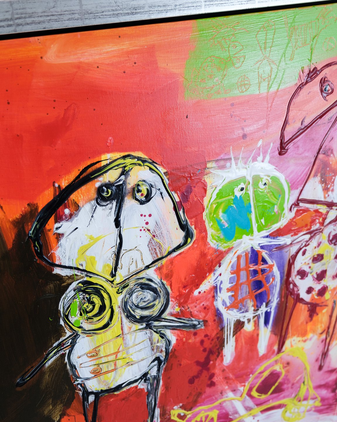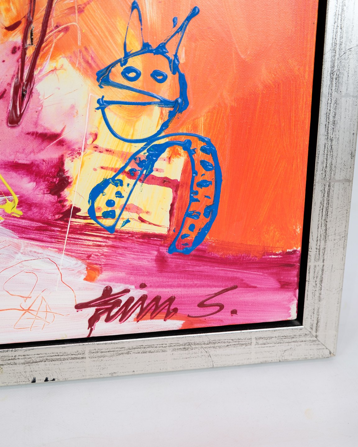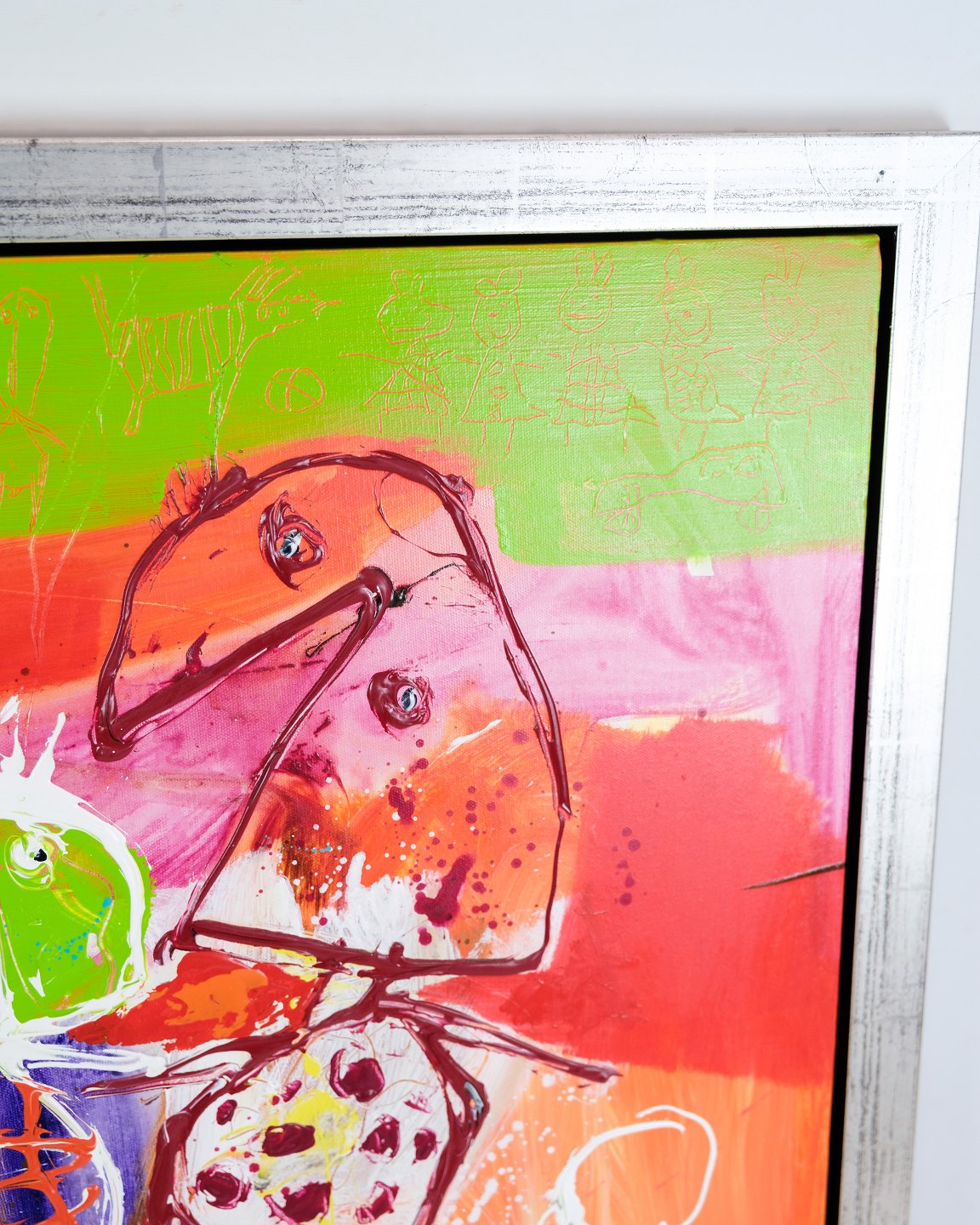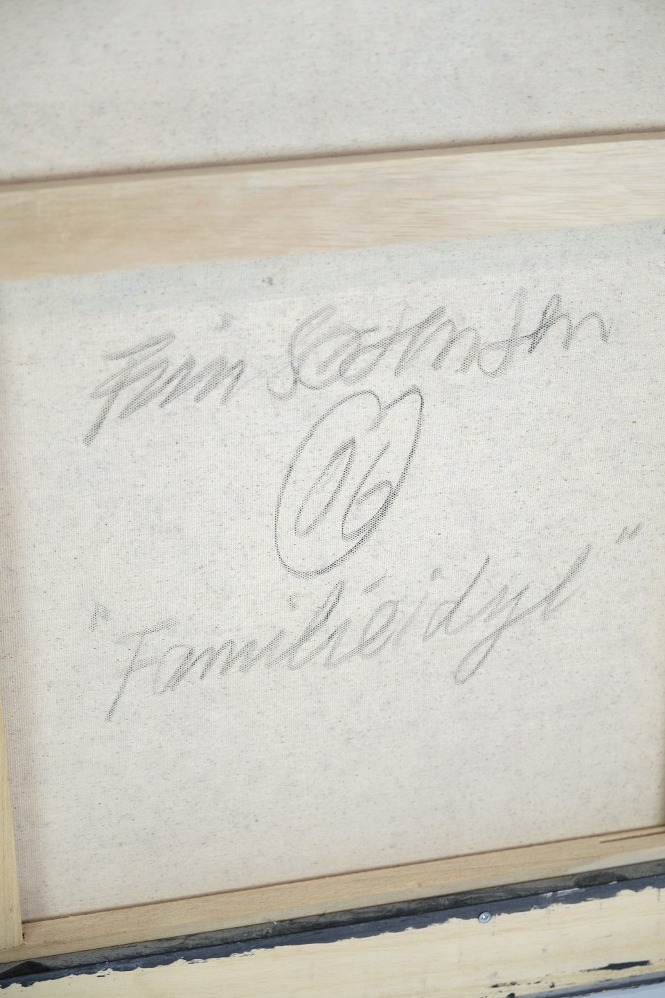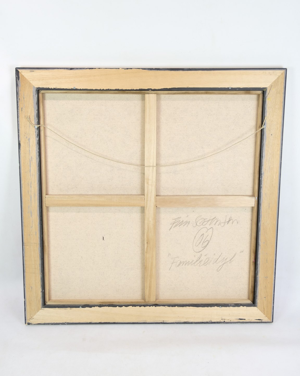 Dette oliemaleri er skabt af den danske kunstner Finn Sørensen i 2006 og bærer titlen "Familieidyl". Maleriet er kendetegnet ved Sørensens ekspressive og legende stil, med farverige figurer og en dynamisk komposition, der indbyder til fortolkning. De klare, kontrastfyldte farver og naive former skaber en stærk visuel fortælling, hvor motivet emmer af liv og energi. Værket er indrammet i en sølvfarvet ramme, der fremhæver maleriets intense farvepalet. Et unikt og iøjnefaldende kunstværk, der vil tilføje personlighed til ethvert rum.