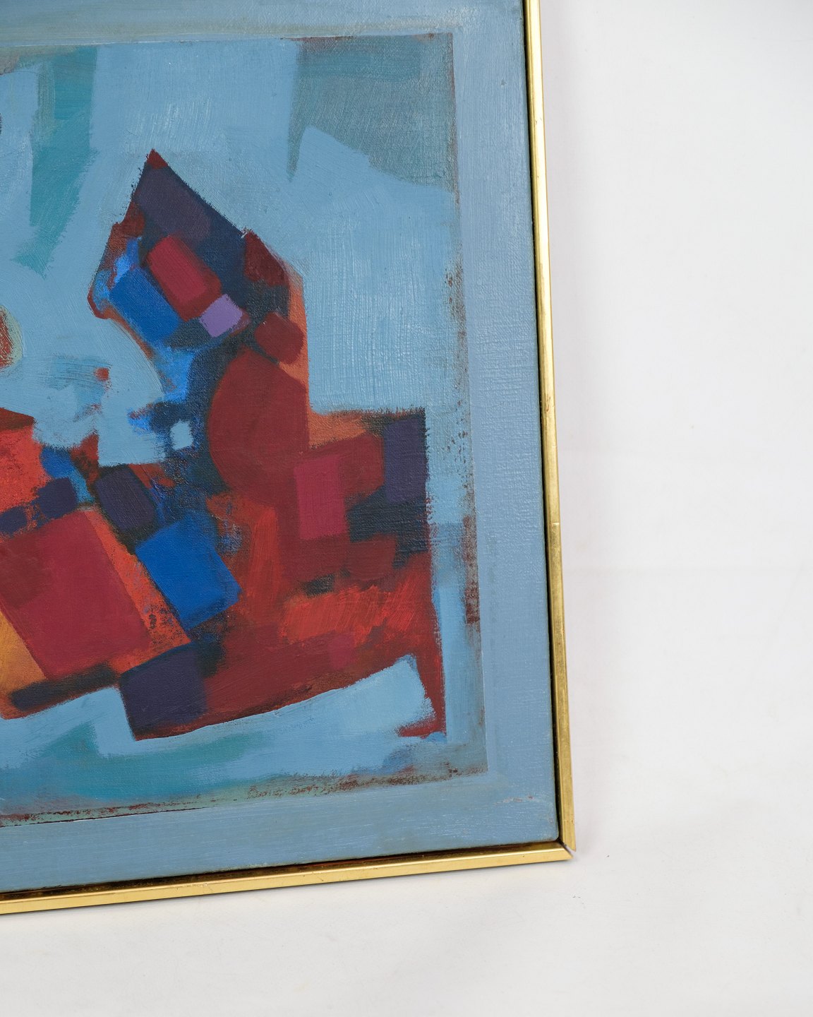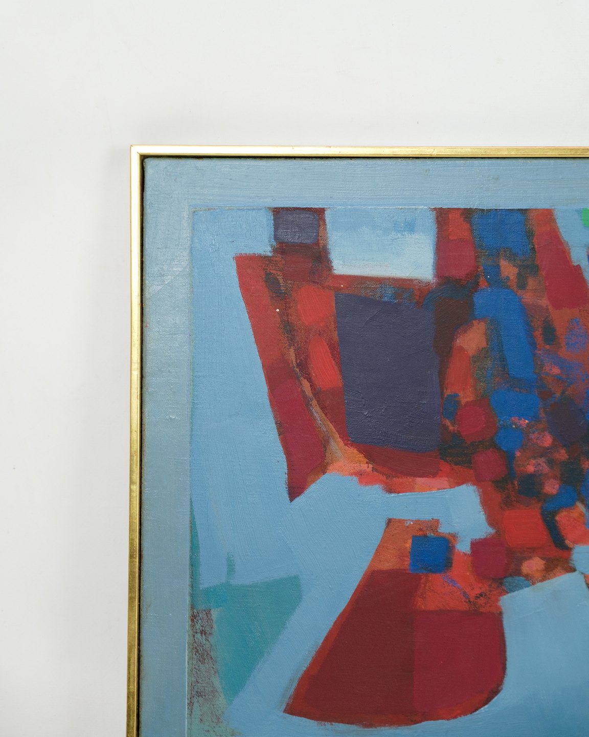 Dette oliemaleri af Gudmund Olsen er et imponerende eksempel på abstrakt kunst. Maleriet udstråler en harmonisk balance mellem geometriske former og farvekontraster, hvor rige røde, blå og violette nuancer dominerer kompositionen. Den blå baggrund skaber en beroligende ramme, der fremhæver de dynamiske elementer i forgrunden.