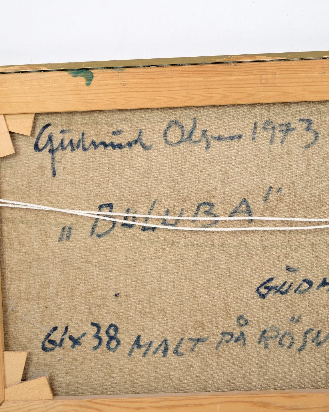 Indrammet i en smal, guldfarvet ramme, understreges værkets elegance og dybde. Gudmund Olsens arbejde er kendt for at udforske farvespil og teksturer, hvilket gør dette maleri til et spændende og unikt tilføjelse til en samling af moderne kunst.