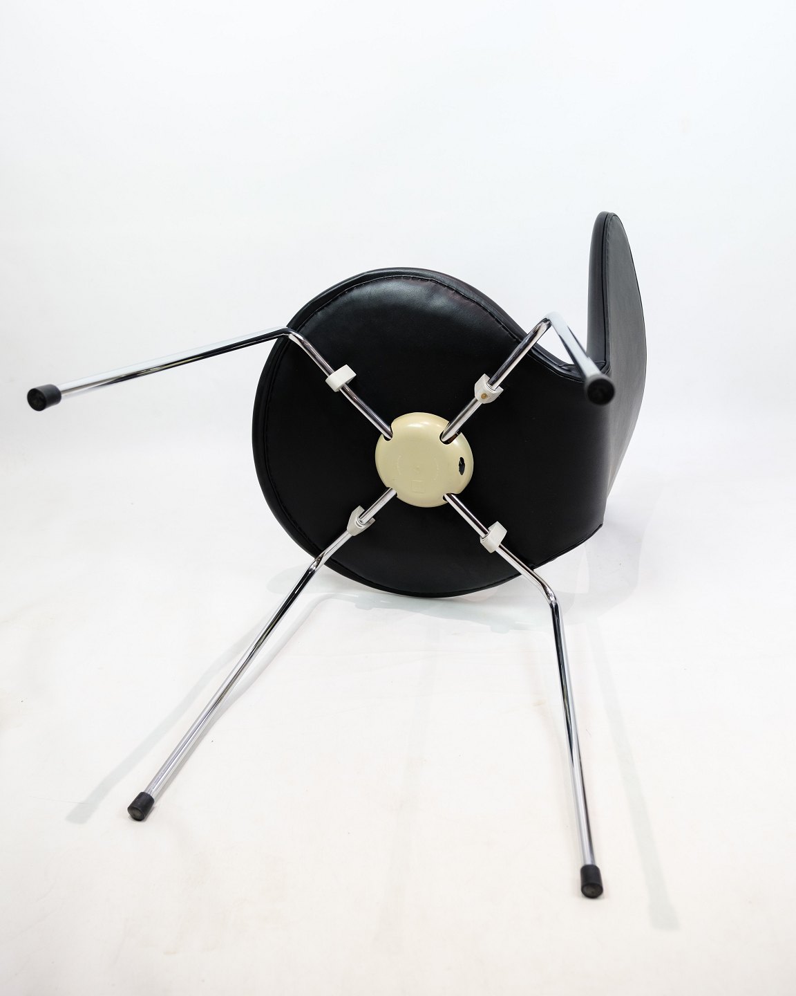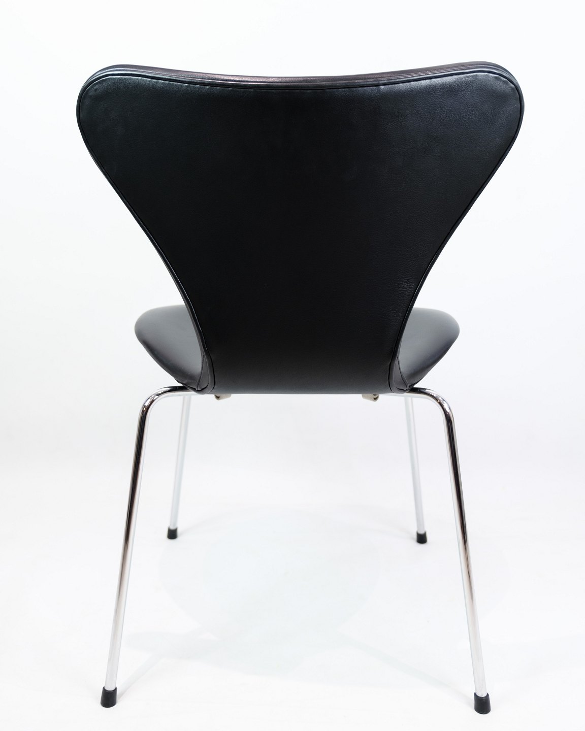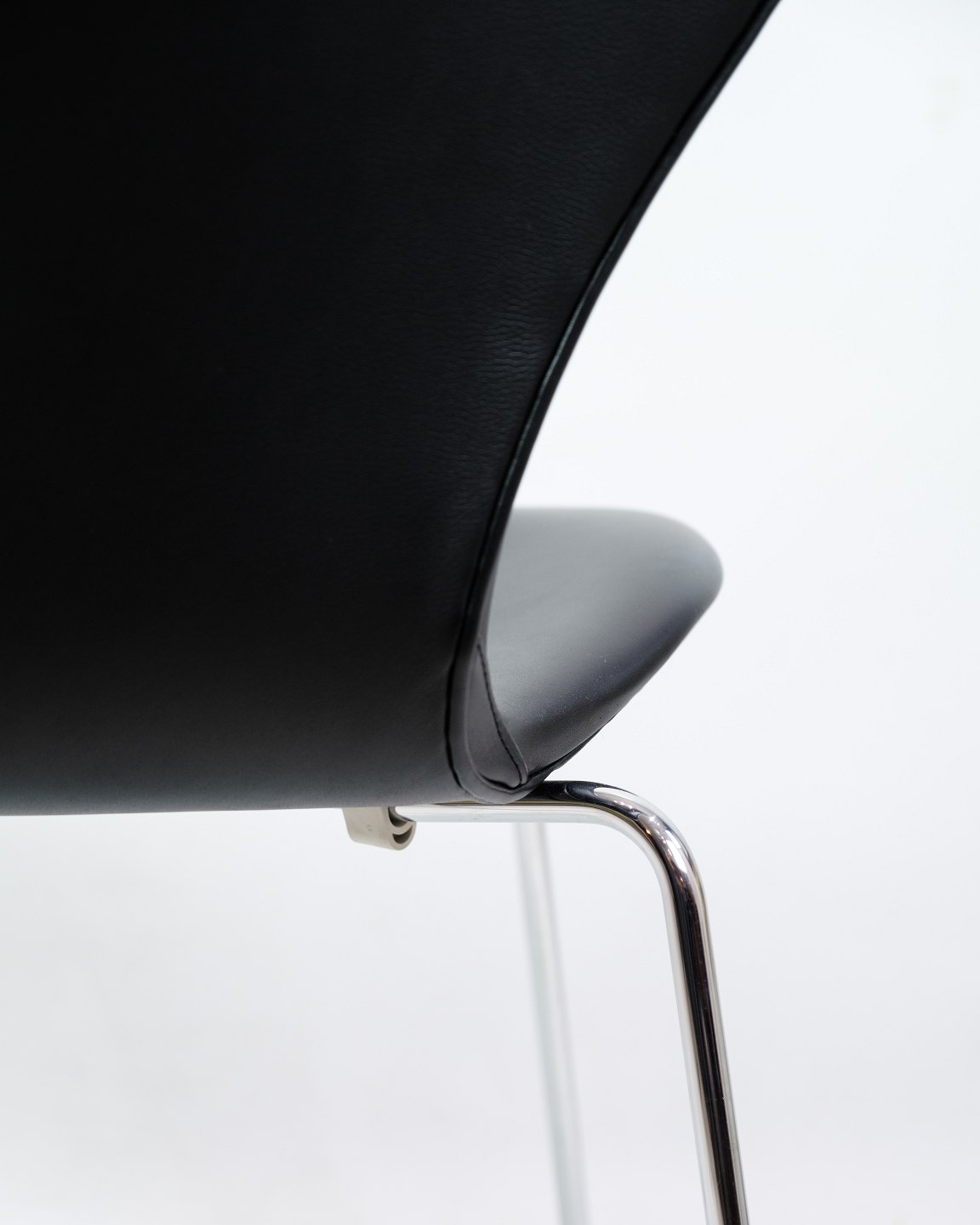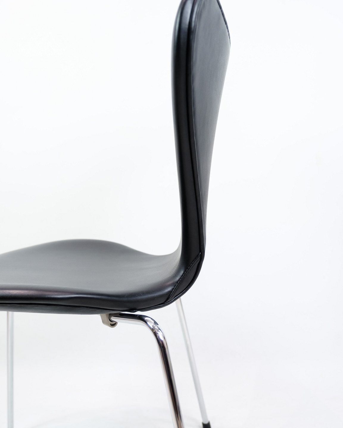 Sæt af fire syverstole med sjælden årgang med en gammel fabriks syning, som man kun ser på de ældre produceret syverstole. Designet af Arne Jacobsen og produceret af Fritz Hansen. Står med fine blanke stel uden nogen form for rust.